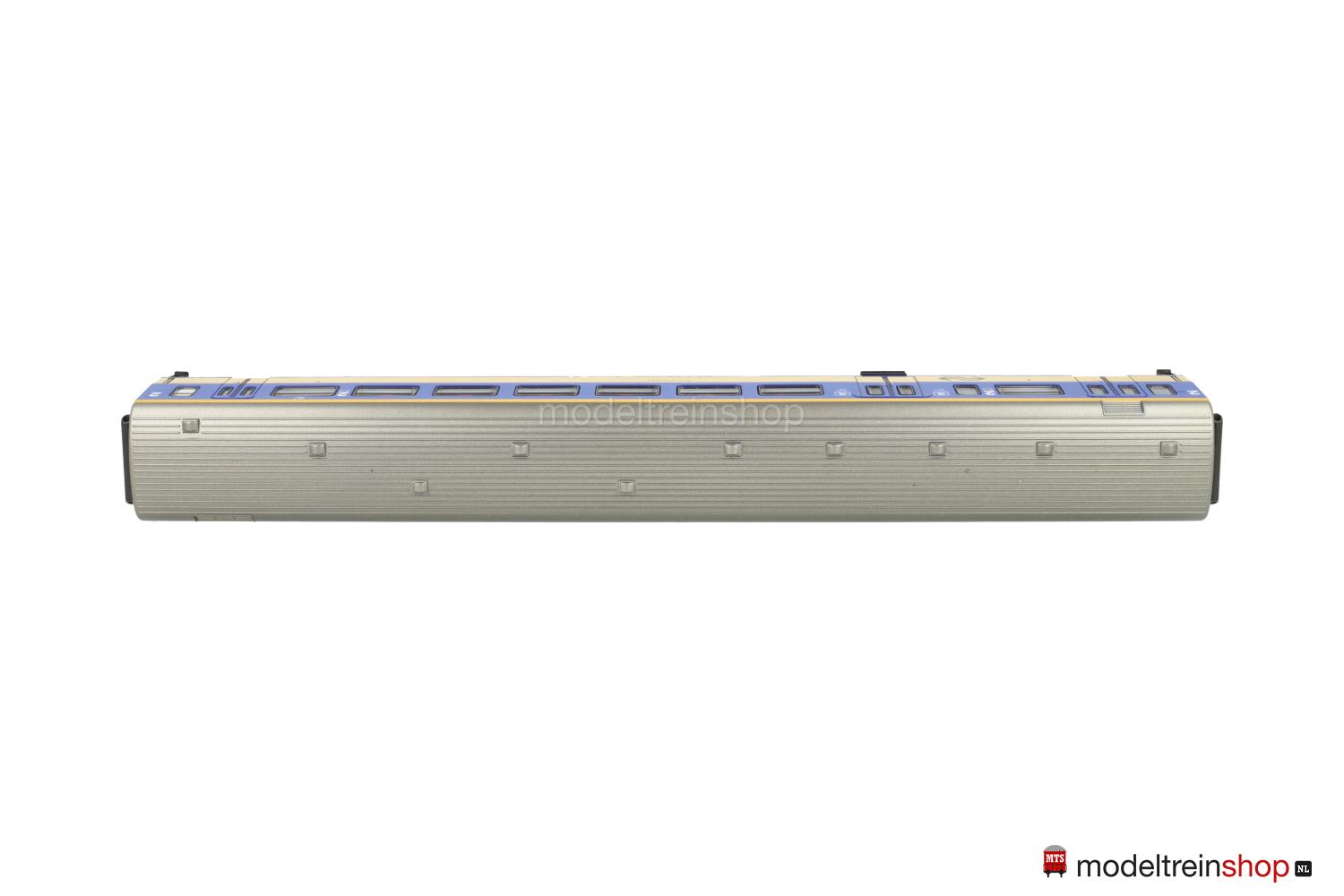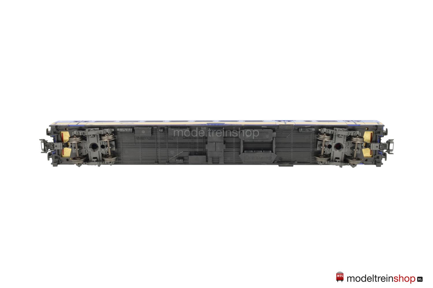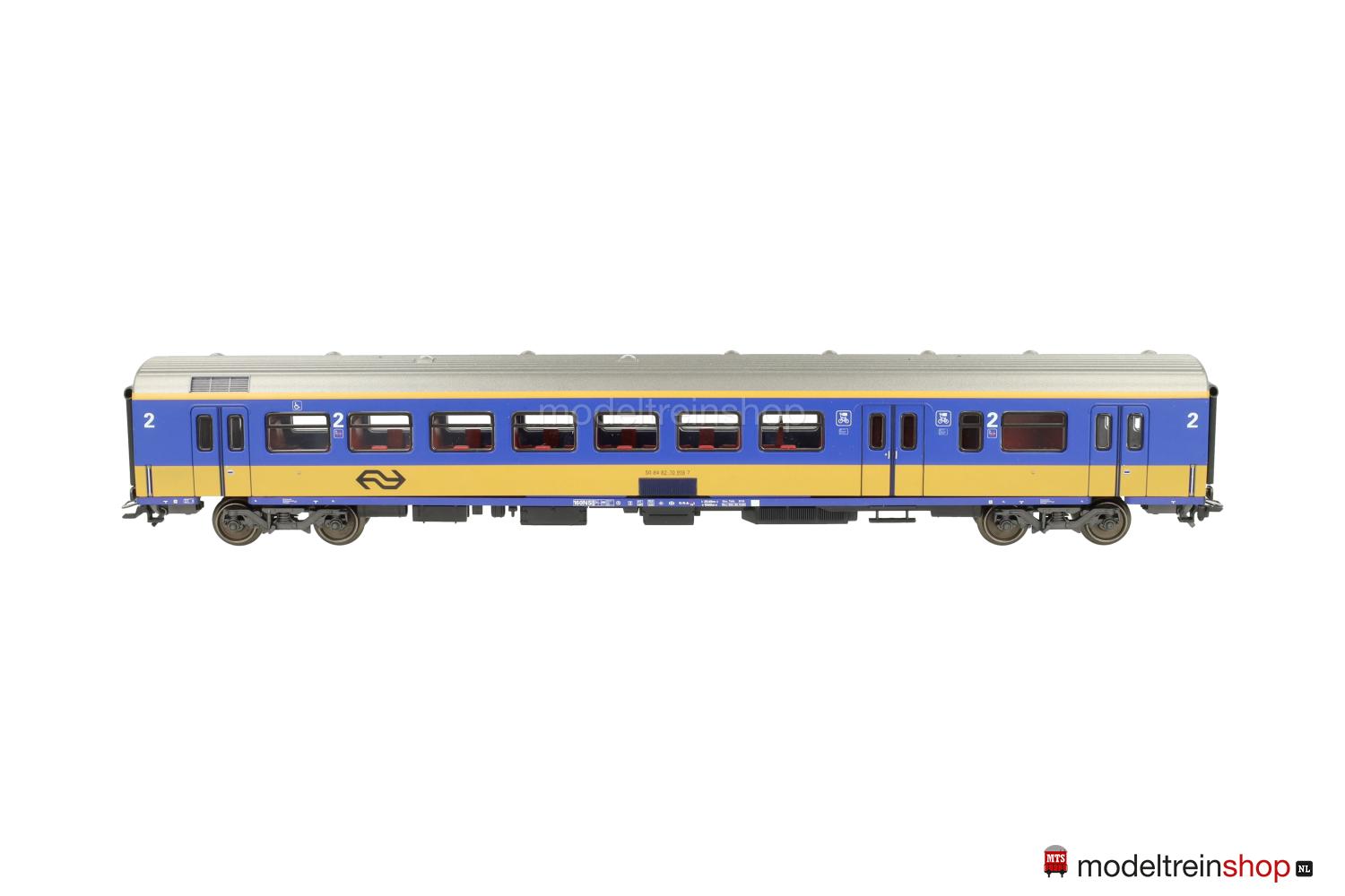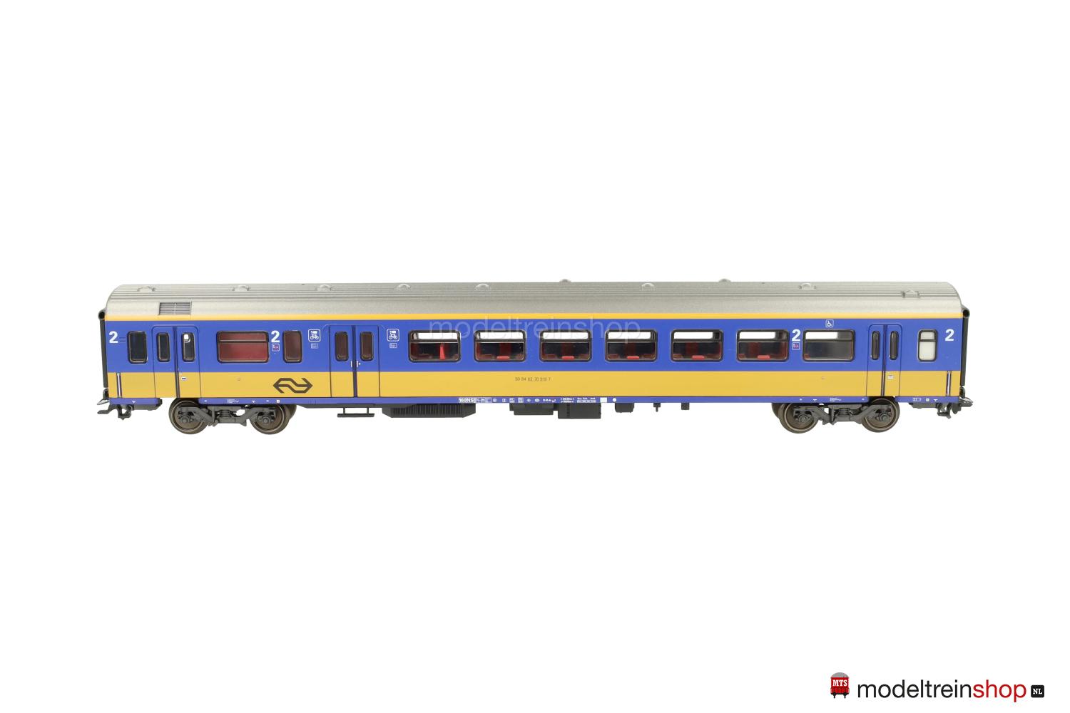 Schwarzes Kunststoff-Untergestell, Fiat-Drehgestelle (Typ 14-b). Kunststoff-Aufbau: blau/gelber Wagenkasten, blaue Wagenunterkanten mit weißen Aufschriften, silbergraues Dach mit Längsrippen, schwarze Aufschriften, Wagen-Nr.: 50 84 82-70 918-7, schwarze NS-Embleme, weiße Klassenkennzeichnung “2”, eingesetzte Fenster mit schwarzen Rahmen, Inneneinrichtung, Gummiwulstübergänge.