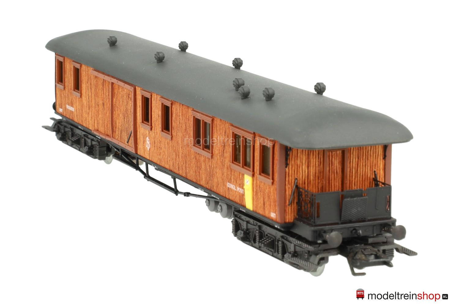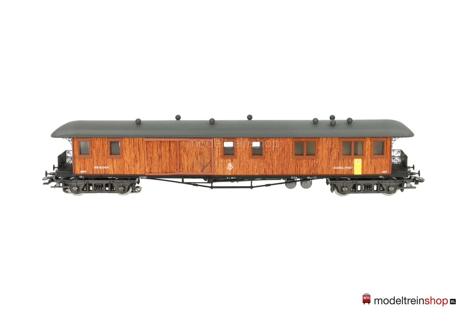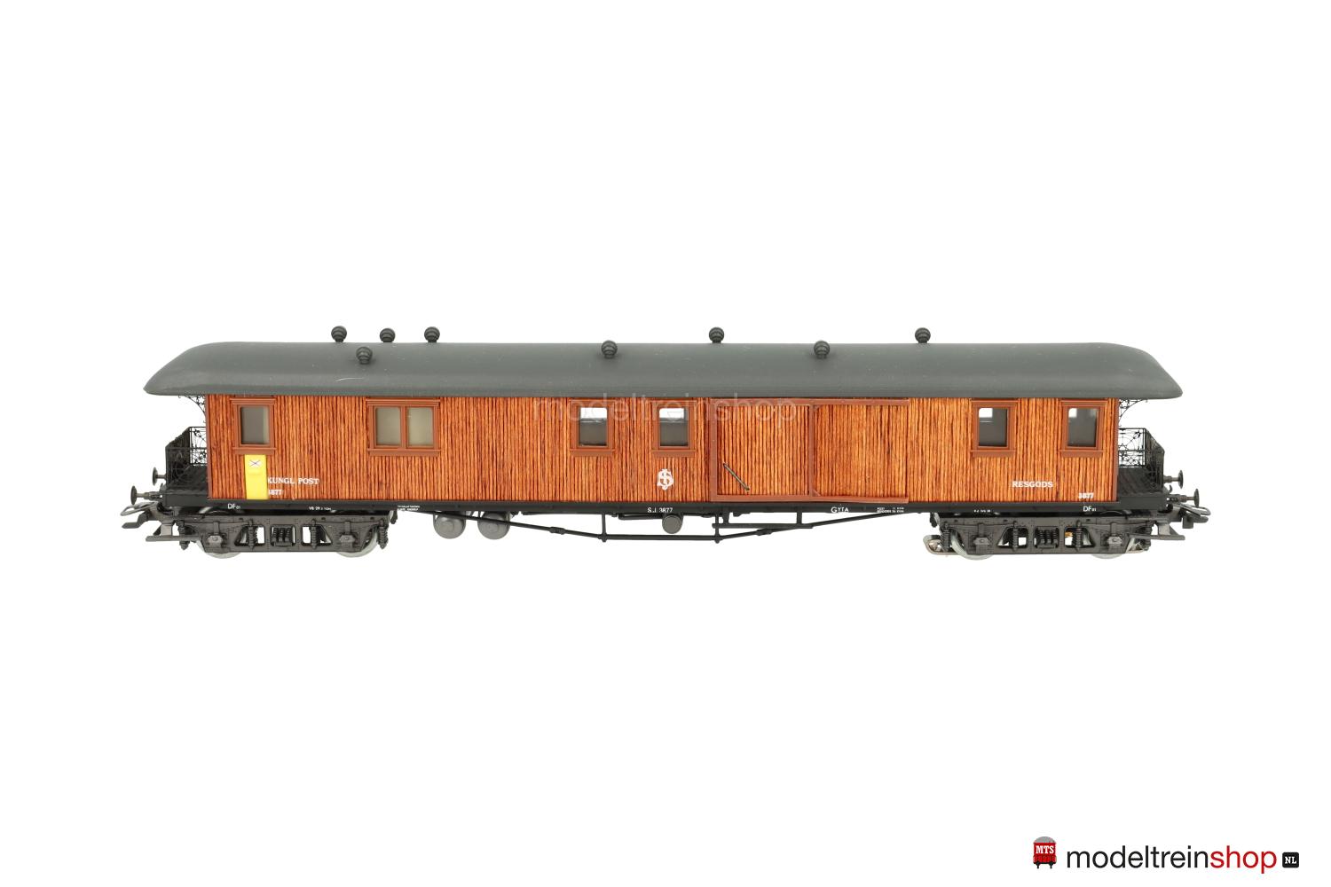 Schwarzes, reichhaltig detailliertes Guß/Kunststoff-Untergestell, KPEV-Regel-Drehgestelle (Typ 13-c), federnde Stangenpuffer, zwei Gasbehälter unter dem Wagenboden parallel und quer angeordnet. Aufbau aus glasklarem Kunststoff mit rötlichbraun gebeizten und aufgeklebten Holzleisten (Balsa-Holz), braune eingesetzte Fenster- und Türrahmen, unter dem ersten Fenster ein gelber, in der Seitenwand eingelassener Briefkasten, daneben weiße Aufschrift: “Kungl. Post”, weiße SJ-Embleme und Wagen-Nr.: 3877, graues Dach, aufgesetzte Lüfter, schwarze Bühnengeländer und Dachstützen aus geätztem Metall, Inneneinrichtung, Innen- und Plattformbeleuchtung (Leuchtdioden).