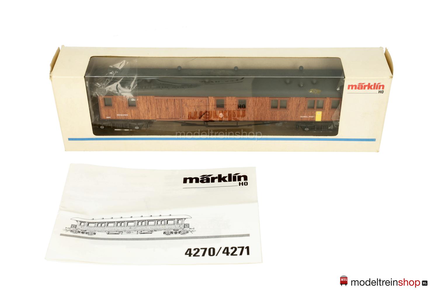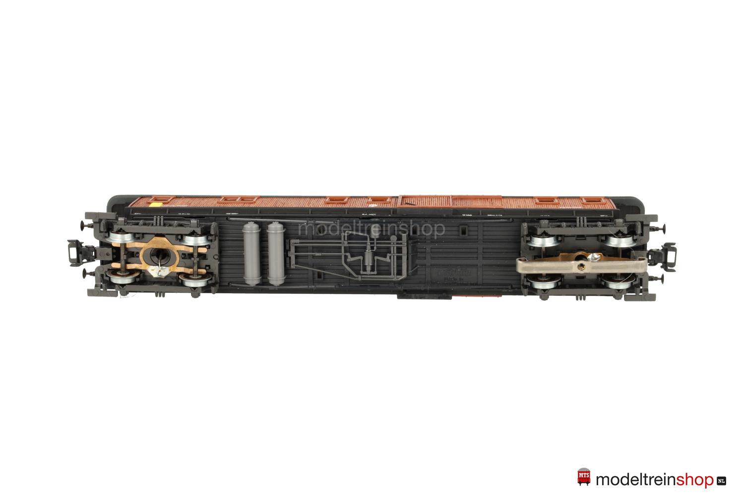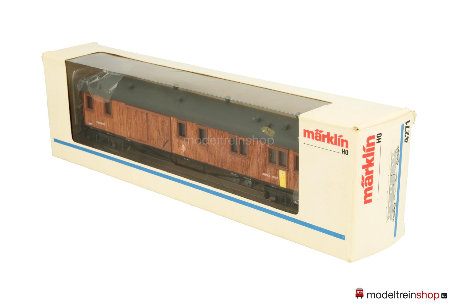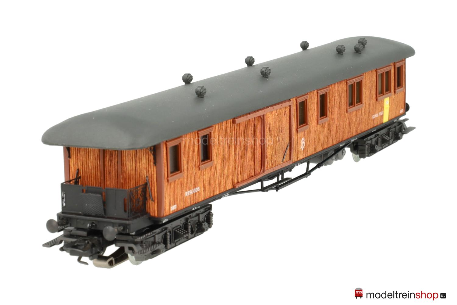 Schwarzes, reichhaltig detailliertes Guß/Kunststoff-Untergestell, KPEV-Regel-Drehgestelle (Typ 13-c), federnde Stangenpuffer, zwei Gasbehälter unter dem Wagenboden parallel und quer angeordnet. Aufbau aus glasklarem Kunststoff mit rötlichbraun gebeizten und aufgeklebten Holzleisten (Balsa-Holz), braune eingesetzte Fenster- und Türrahmen, unter dem ersten Fenster ein gelber, in der Seitenwand eingelassener Briefkasten, daneben weiße Aufschrift: “Kungl. Post”, weiße SJ-Embleme und Wagen-Nr.: 3877, graues Dach, aufgesetzte Lüfter, schwarze Bühnengeländer und Dachstützen aus geätztem Metall, Inneneinrichtung, Innen- und Plattformbeleuchtung (Leuchtdioden).