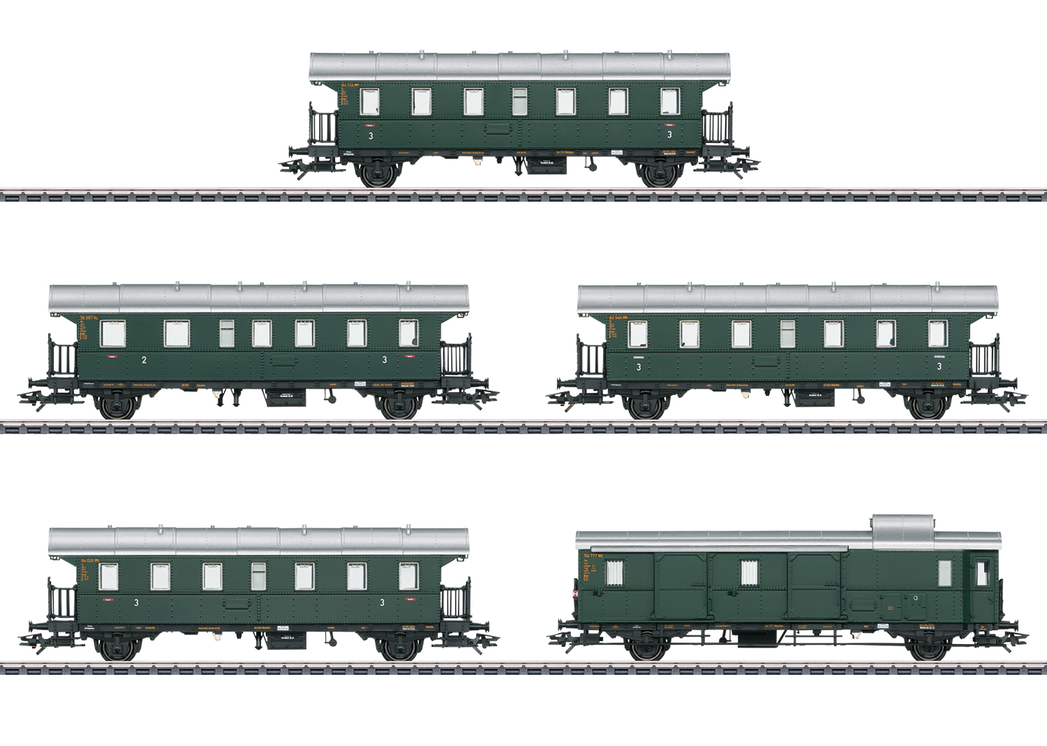 Vijf standaardtype tweeassige doorgangswagens voor hoofdlijnen van de Deutsche Bundesbahn (DB). In de volksmond ook “Donderbus” genoemd. Drie rijtuigen Ci 3e klas, een rijtuig BCi 2e/3e klas en een bagagewagen Pwi. Glasgroene kleurstelling. Thuisstation München. Zoals in gebruik rond 1951.