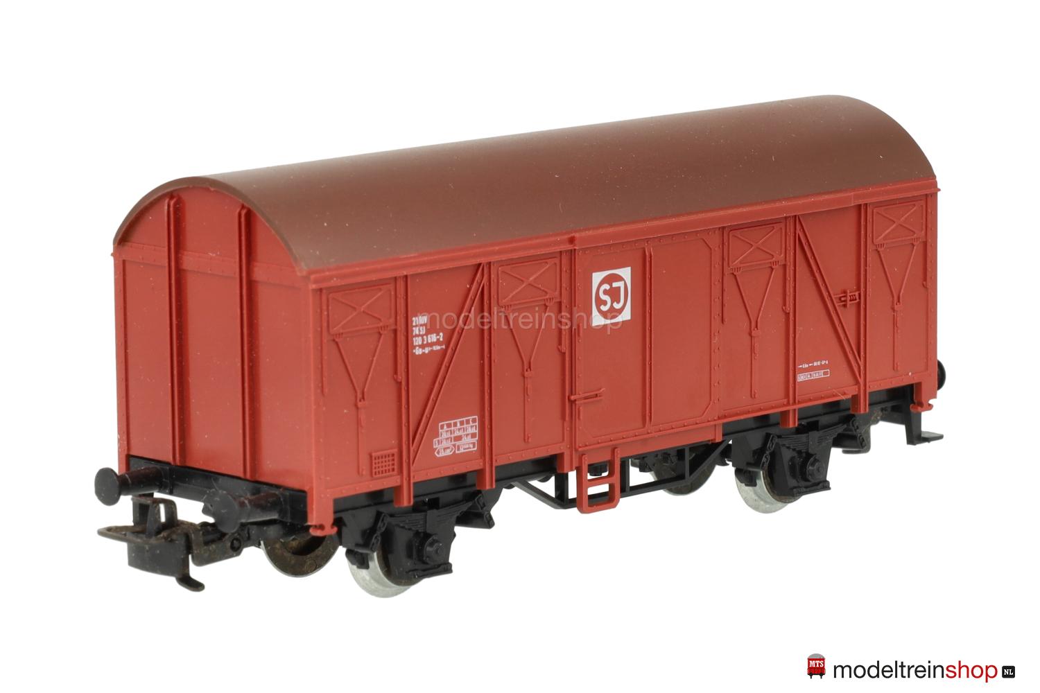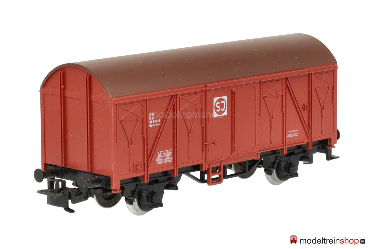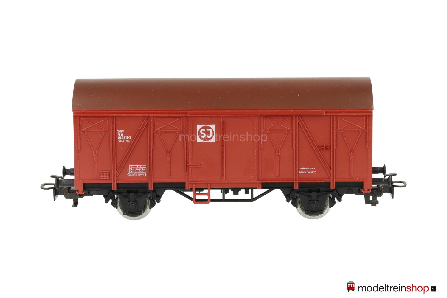 Schwarzes Kunststoff-Untergestell Typ B. Kunststoff-Aufbau: rotbrauner Wagenkasten, braunes Dach, weiße Aufschriften, Wagen-Nr.: 120 3 616-2, weiße SJ-Embleme.