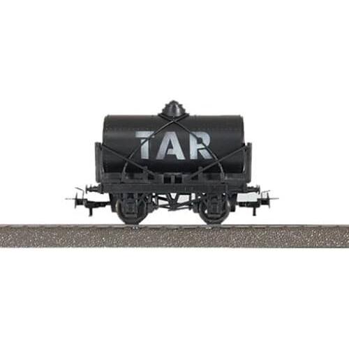 Schwarzes detailliertes Kunststoff-Untergestell. Schwarzer Kunststoff-Aufbau, weißer genieteter Kessel mit blauen Schriftzügen “TIDMOUTH MILK”.