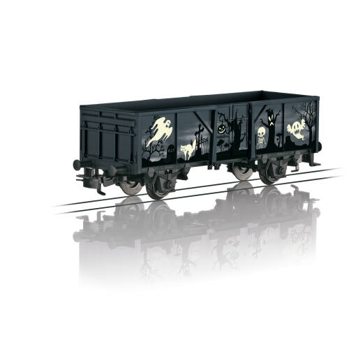 Open goederenwagen in fantastische halloween-uitvoering. Sommige opgedrukte elementen geven licht in het donker – Glow in the Dark. De wagen is beladen met een geluidsmodule op batterijen met afneembare geest. De geluidsmodule heeft een vast geprogrammeerde geluidsfunctie “spokengejammer”. Extra leuk is de opnamefunctie voor een extra, zelf bedacht geluid. Relex-koppelingen. Lengte over de buffers 11,5 cm. Set geisoleerde assen E700580 is apart verkrijgbaar. Batterijen worden meegeleverd.