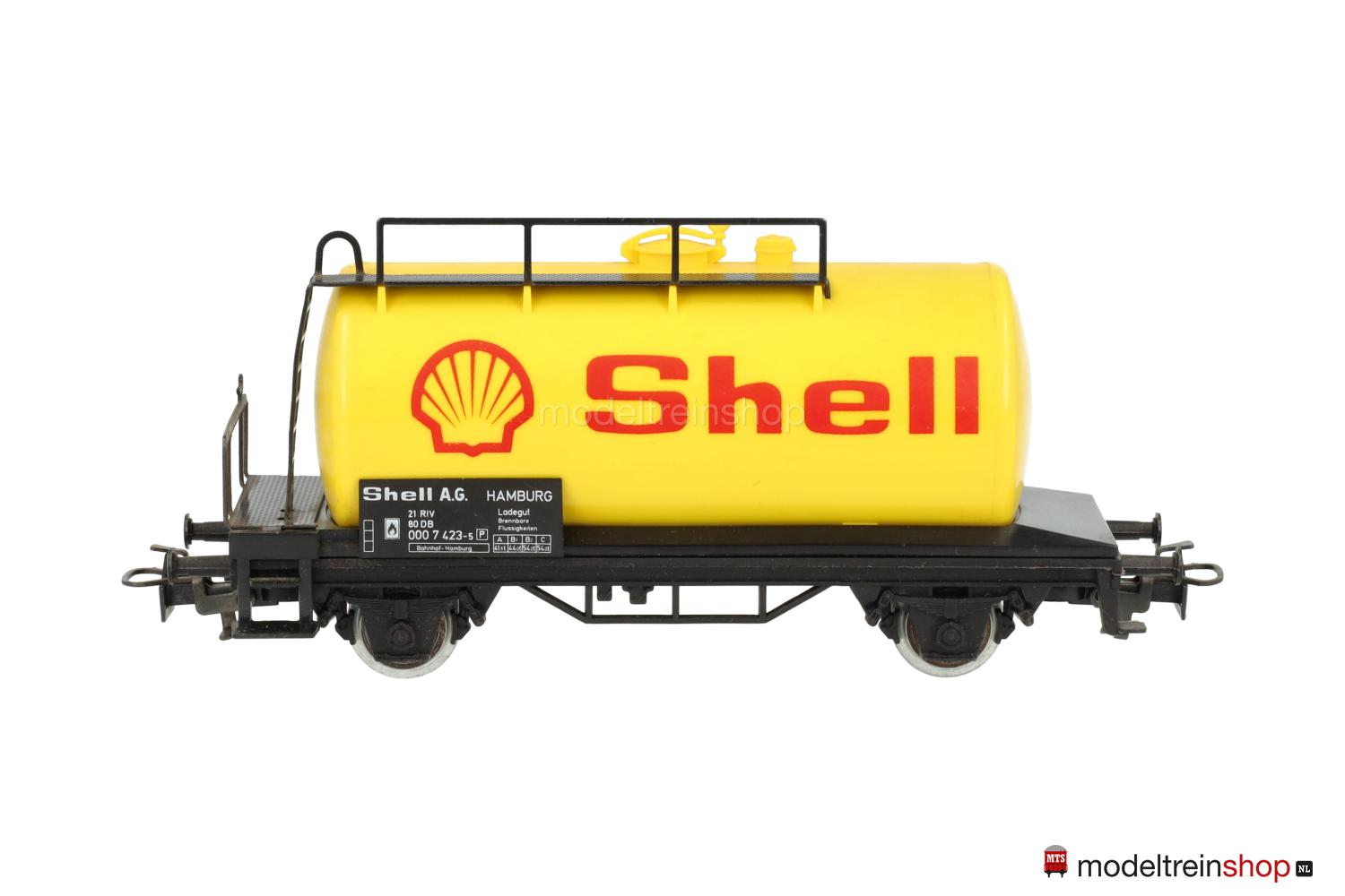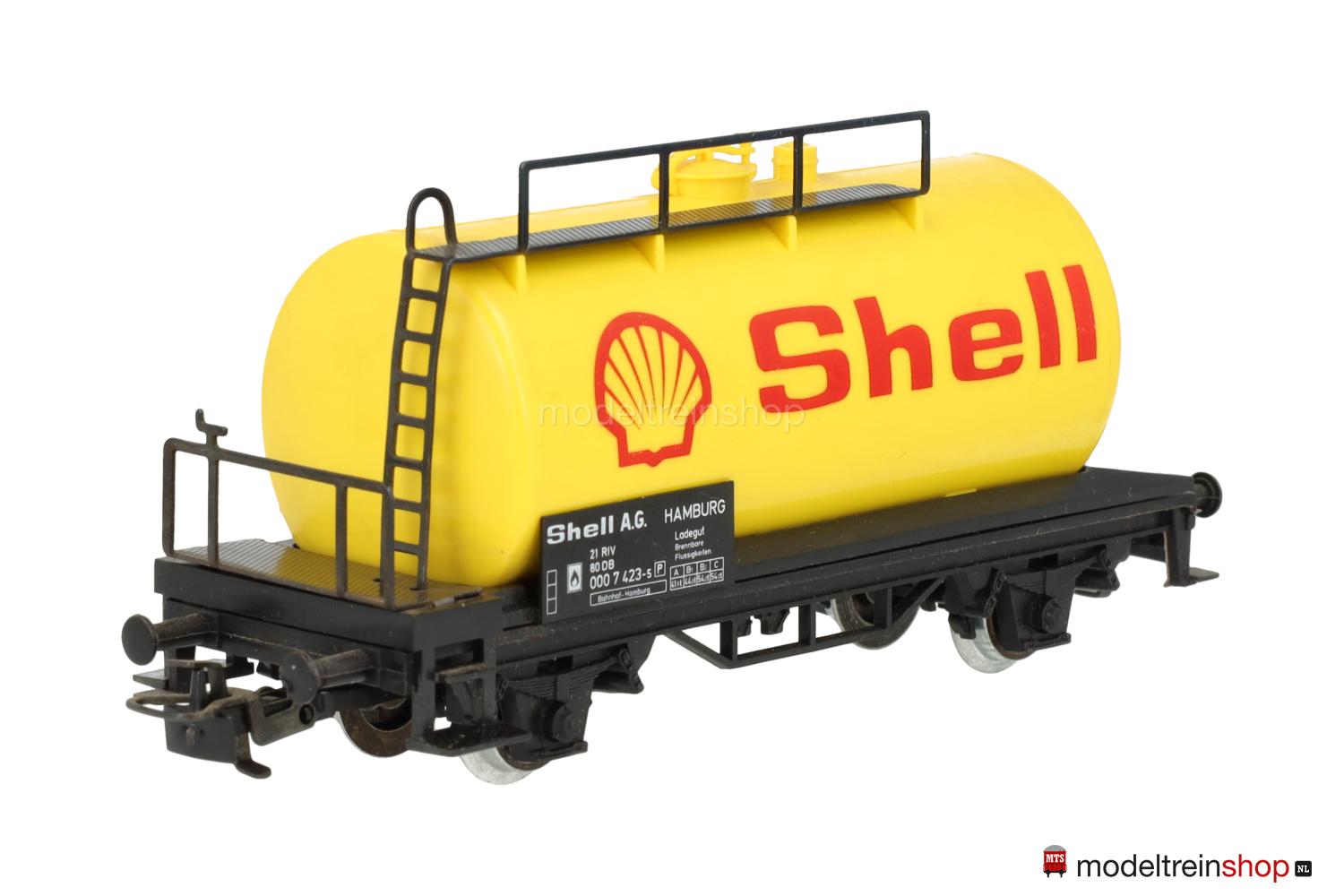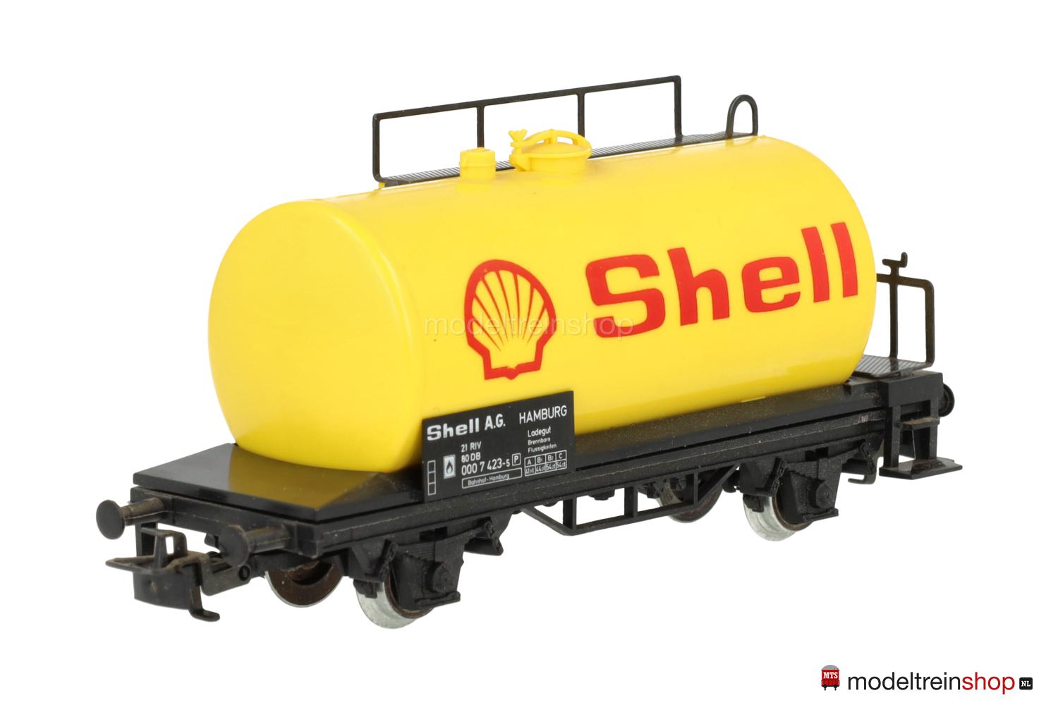 Schwarzes Kunststoff-Untergestell, Bremserbühne aus Metall. Schwarzer Wagenboden und gelber Kessel aus Kunststoff, rote Aufschrift: “Shell” und rote “SHELL”-Embleme, Leiter und Laufsteg aus Metall, schwarze Gattungsschilder mit weißen Aufschriften.