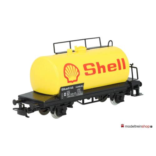 Schwarzes Kunststoff-Untergestell, Bremserbühne aus Metall. Schwarzer Wagenboden und gelber Kessel aus Kunststoff, rote Aufschrift: “Shell” und rote “SHELL”-Embleme, Leiter und Laufsteg aus Metall, schwarze Gattungsschilder mit weißen Aufschriften.