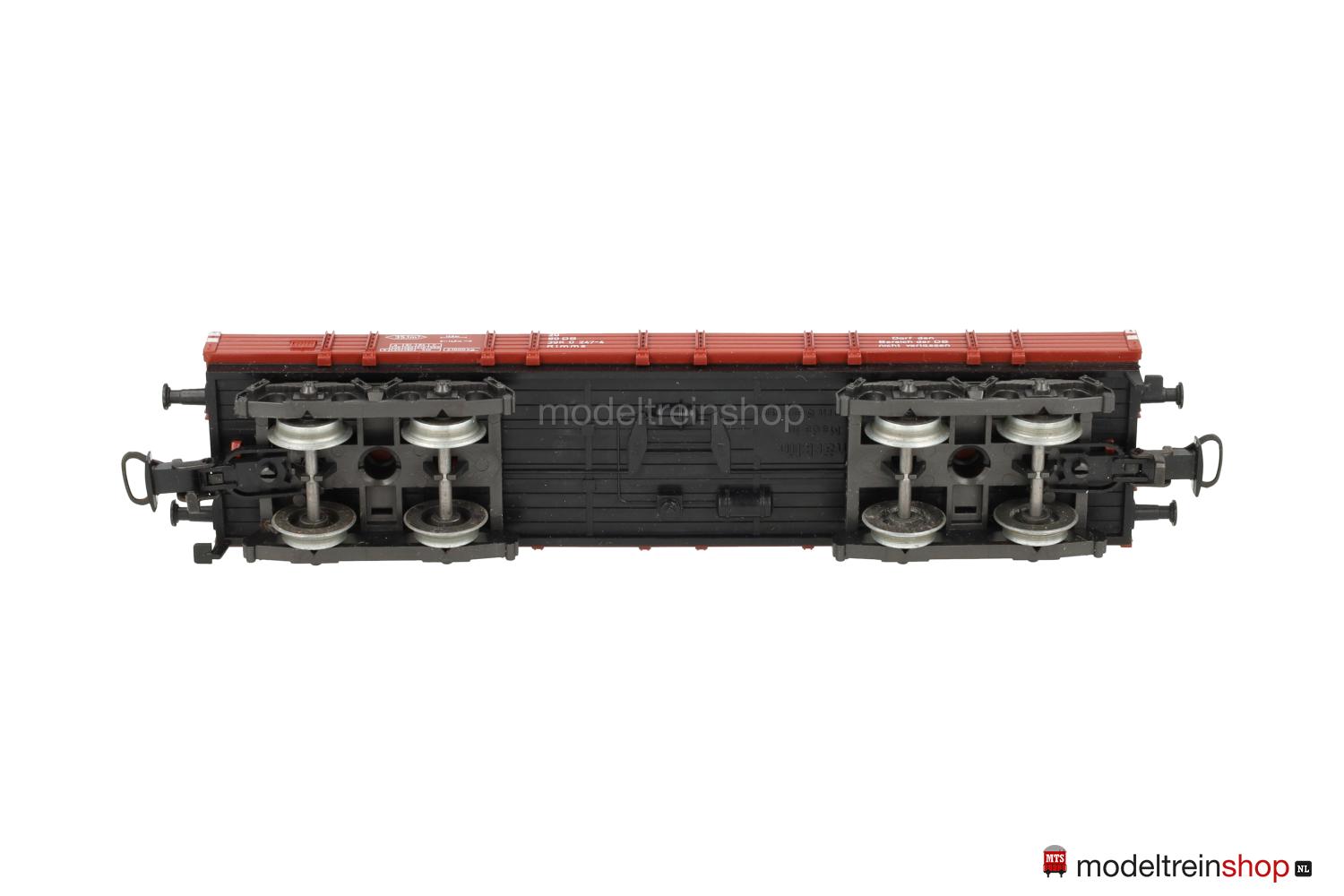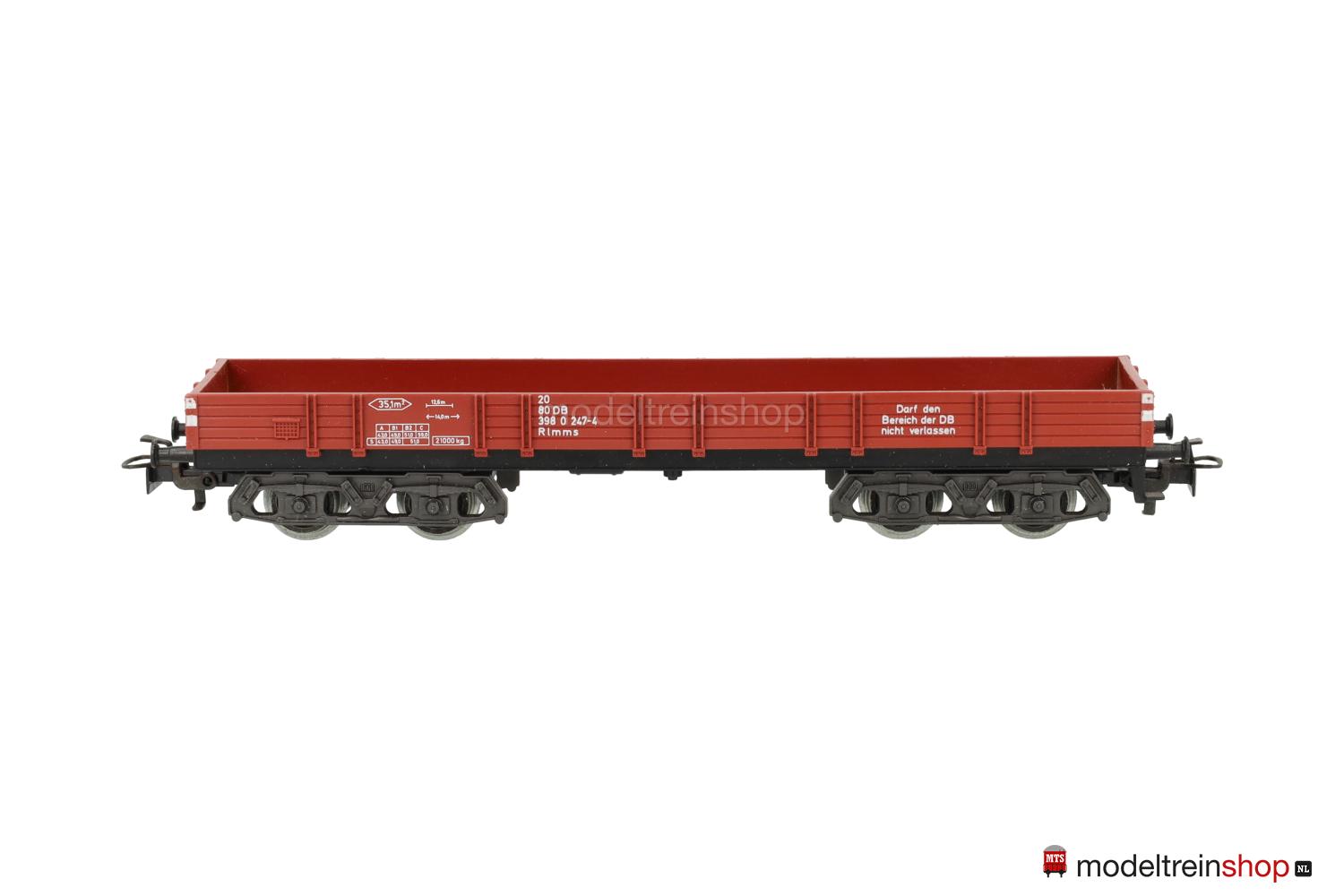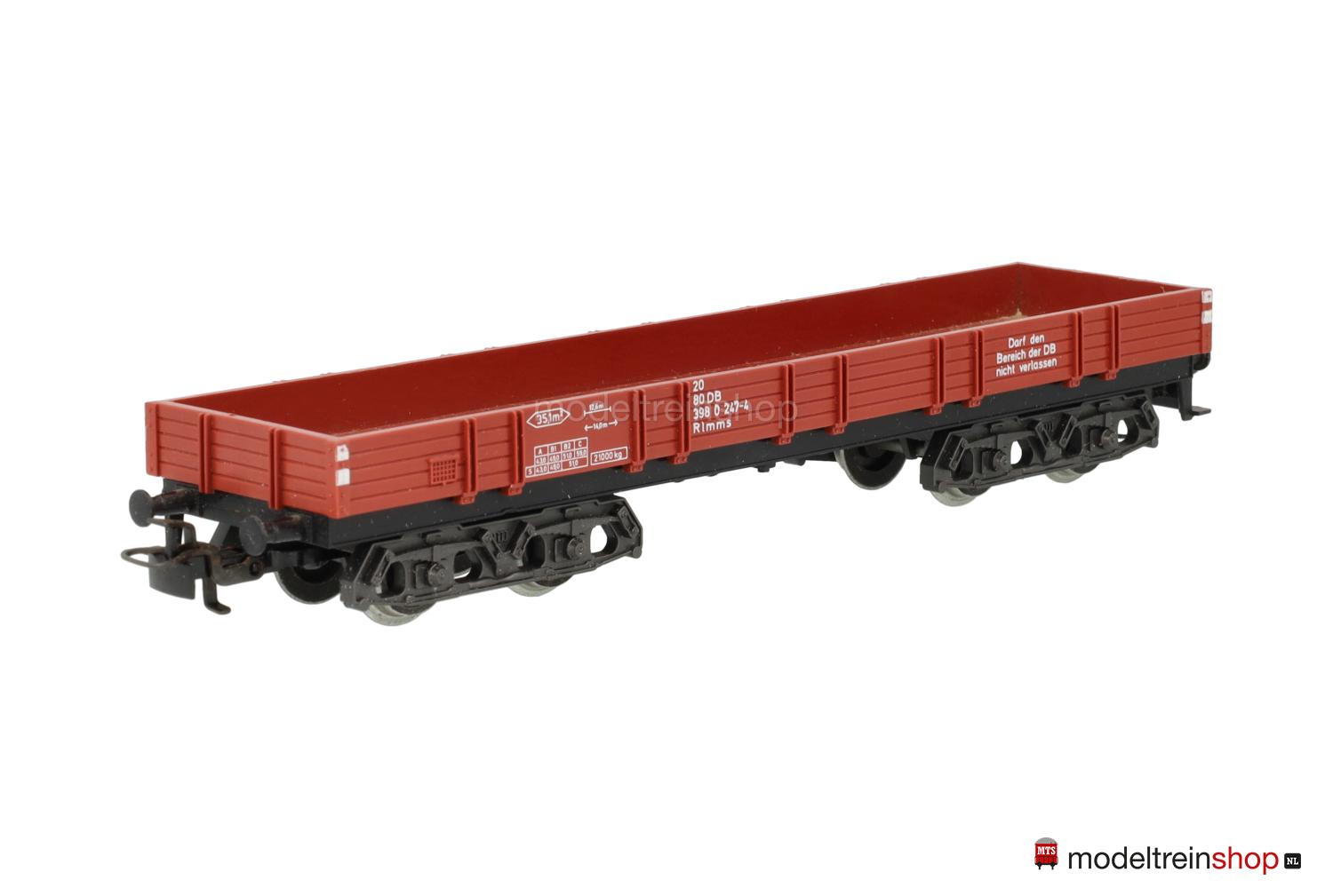 (Rlmms der DB) Wagenkasten in hellerem Rotbraun, weiße Aufschriften – u.a.: “Darf den Bereich der DB nicht verlassen”, Wagen-Nr.: 398 0 247-4, eine Anschriftenfläche (jeweils links) ohne durchgehende Bretter, Bremszeichen an den Wagenecken.