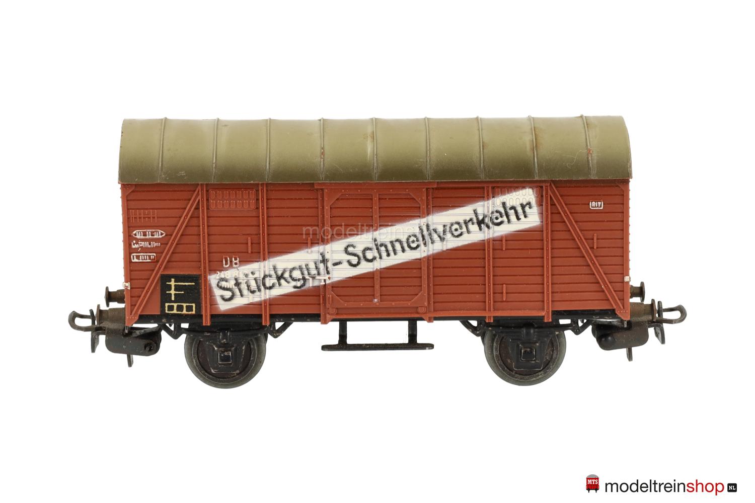 Schwarzes Blech-Untergestell mit am Wagenboden angenieteten Trittbrettern. Kunststoff-Aufbau: brauner Wagenkasten, beigefarbenes und schattiertes Dach, weiße Aufschriften, Wagen-Nr. 248 847, quadratische Übergabezettel-Felder = Schiebebilder, diagonal laufende weiße Balken mit Aufschrift: “Stückgut-Schnellverkehr”, erhabene “306” an den Stirnseiten.