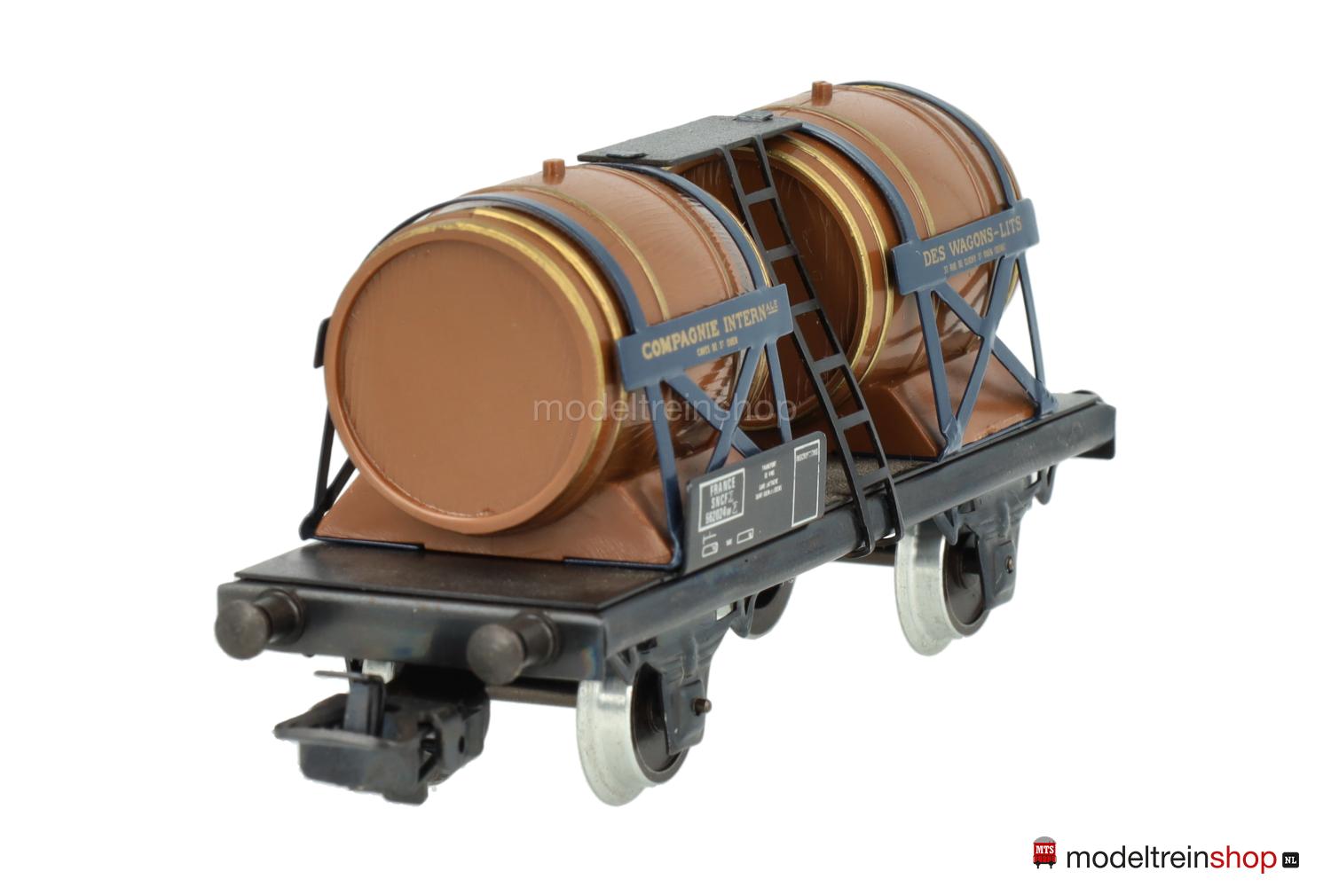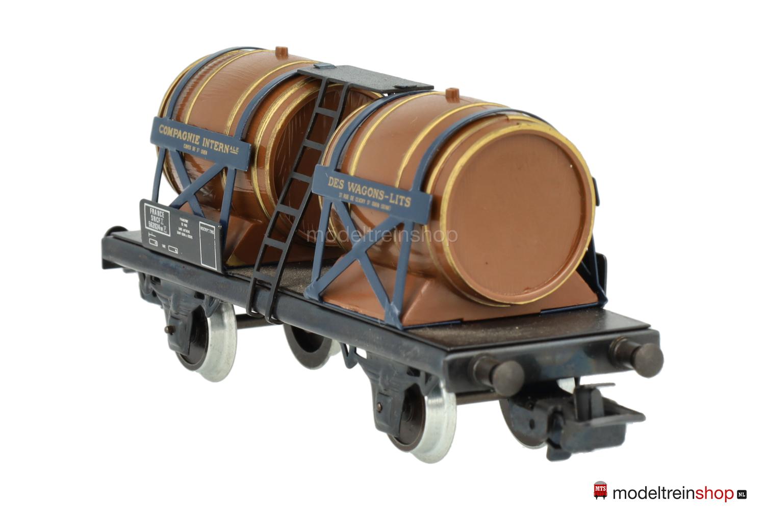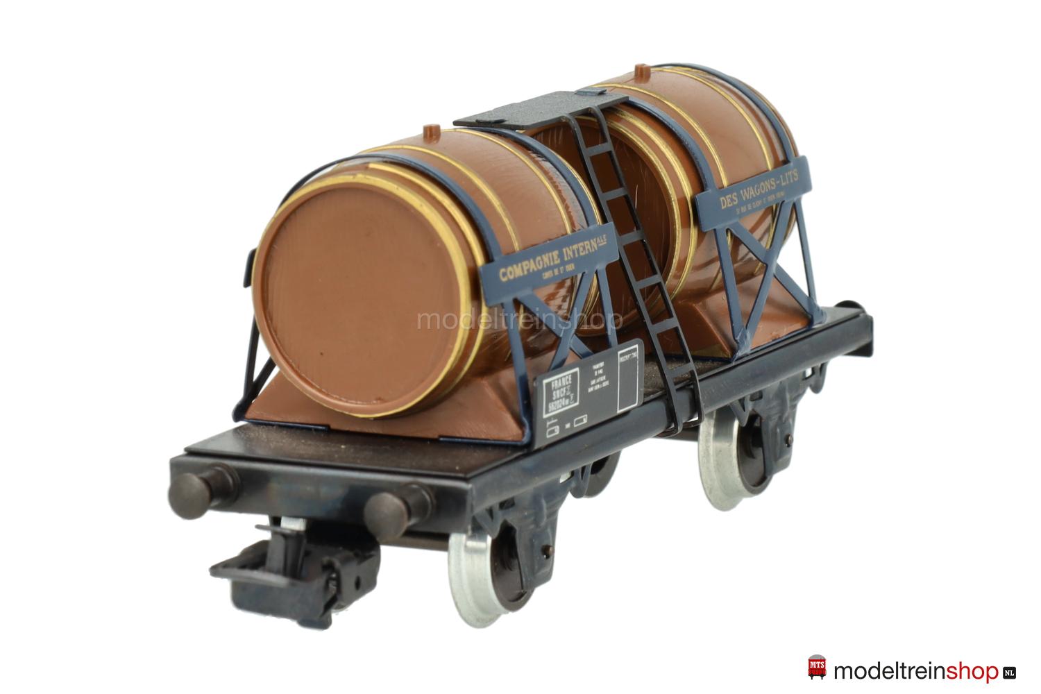 (SNCF) Dunkelbraune Fässer mit goldfarbenen Faßreifen, vier Schilder mit goldfarbener Beschriftung – u.a.: “COMPAGNIE INTERNATIONALE DES WAGON-LITS”, Gattungsschilder mit weißen Aufschriften, Wagen-Nr.: 562024