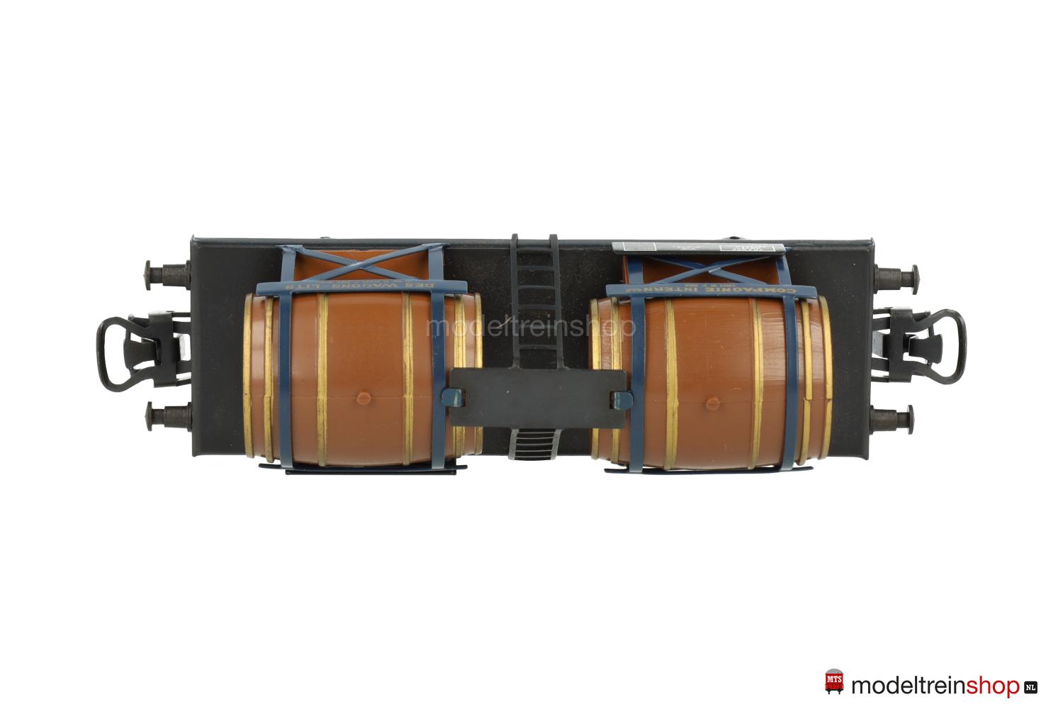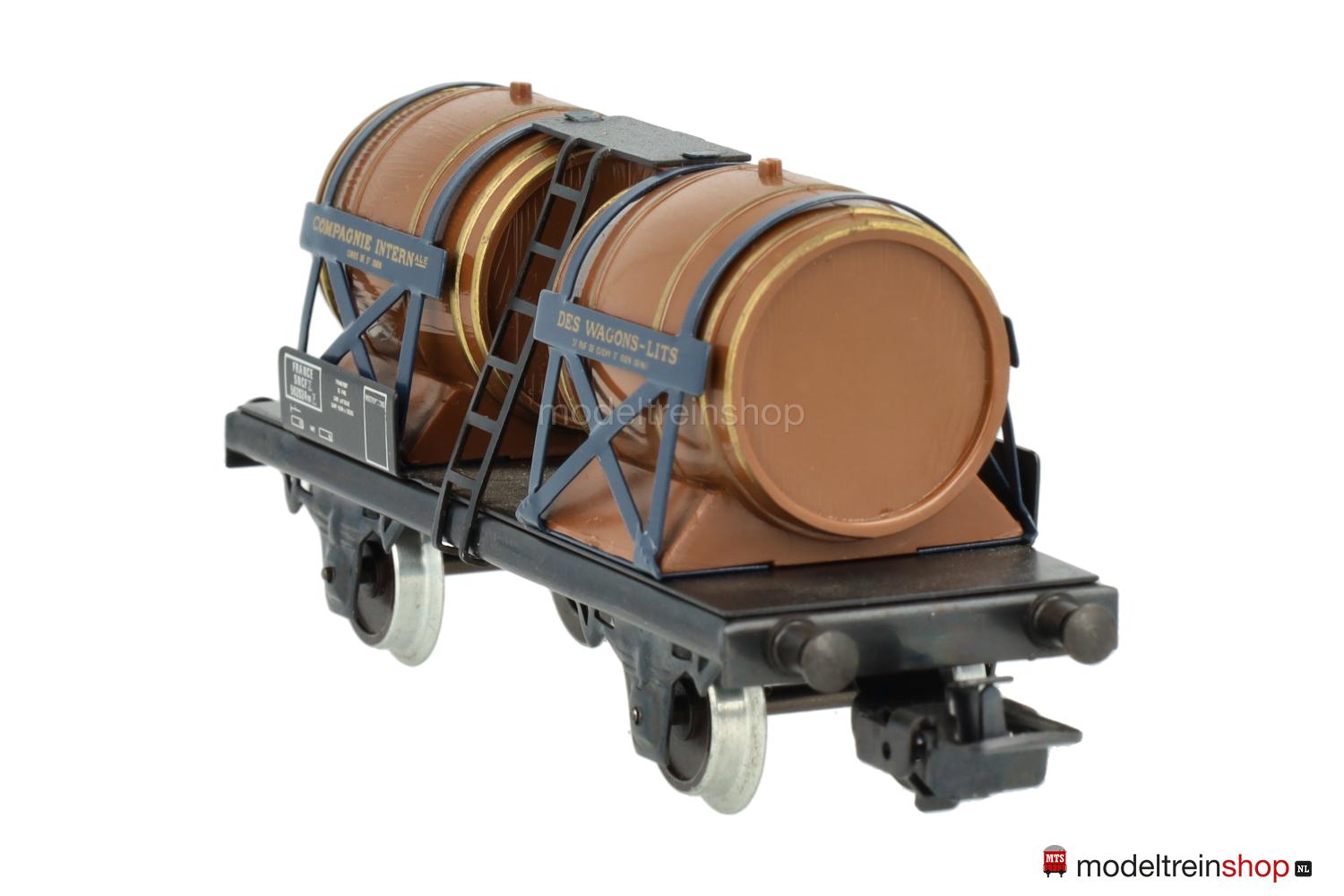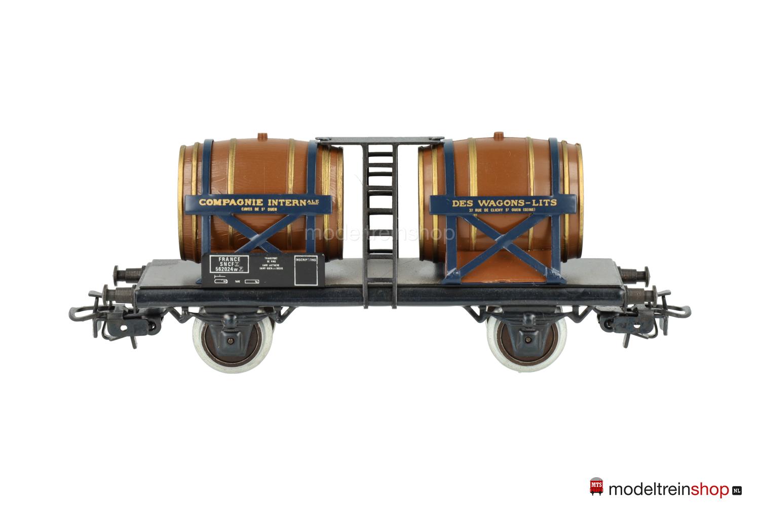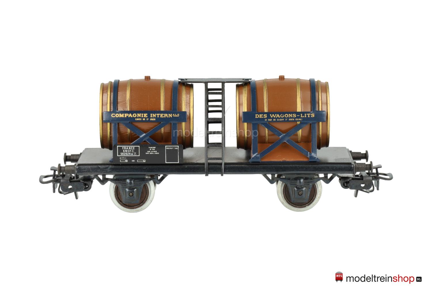(SNCF) Dunkelbraune Fässer mit goldfarbenen Faßreifen, vier Schilder mit goldfarbener Beschriftung – u.a.: “COMPAGNIE INTERNATIONALE DES WAGON-LITS”, Gattungsschilder mit weißen Aufschriften, Wagen-Nr.: 562024