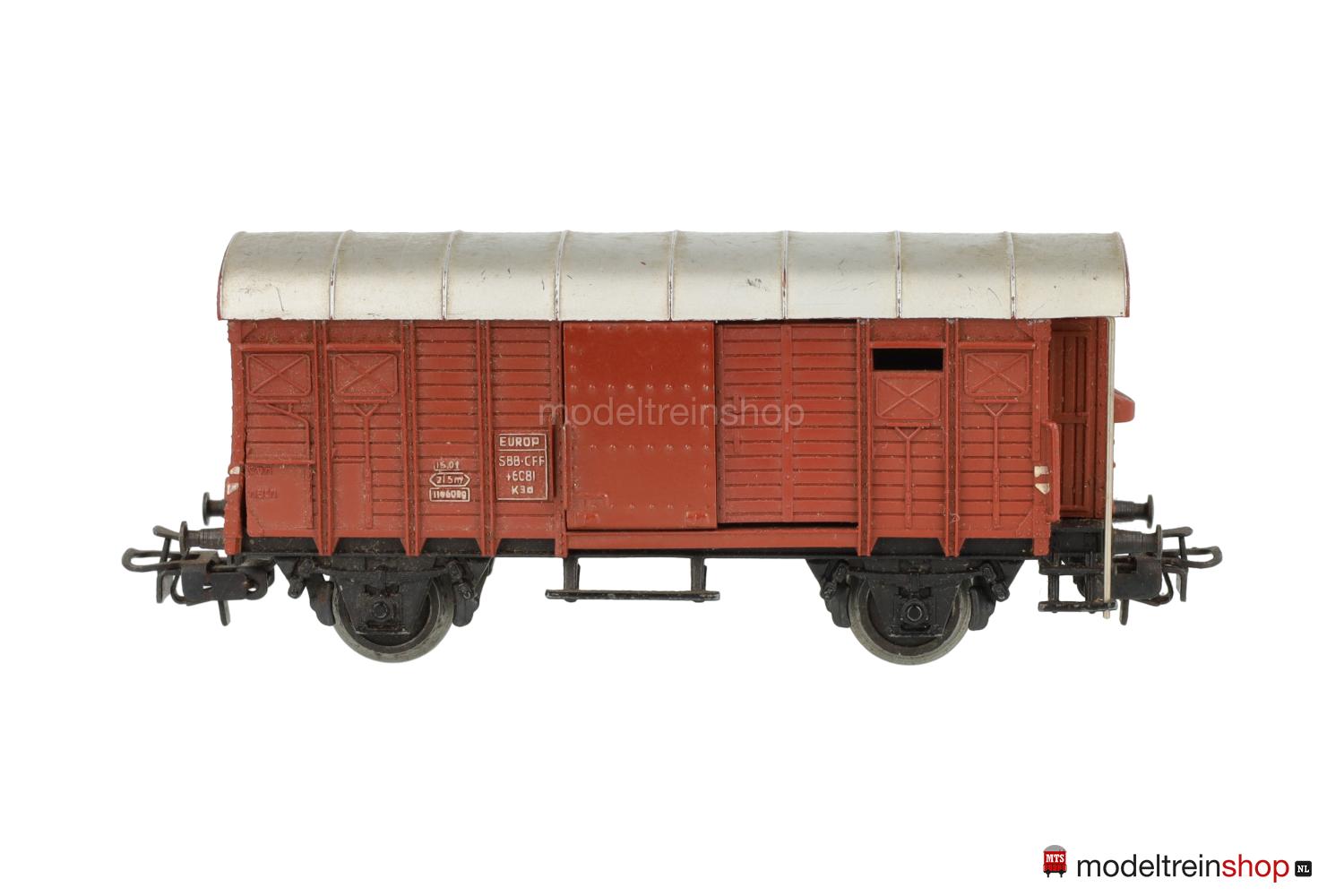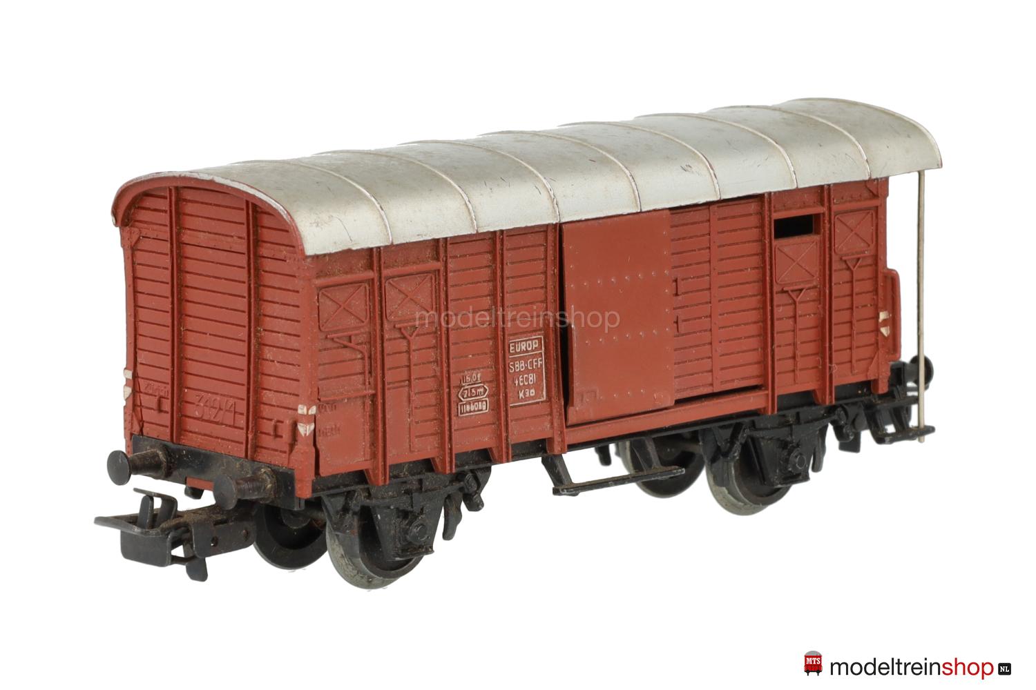 Schwarzes Guß-Untergestell mit angegossenen Trittbrettern. Kunststoff-Aufbau: Wagenkasten mit integriertem Bremserhaus, Griffstangen aus Draht, silberfarbenes Dach, erhabene weiße Aufschriften, Wagen-Nr.: 46081. Übergabezettel-Felder: Fläche und erhabene Aufschriften ohne Färbung, an den Stirnseiten erhabene Aufschriften “Zürich” und “312/1”, zwei bewegliche Schiebetüren aus Blech.