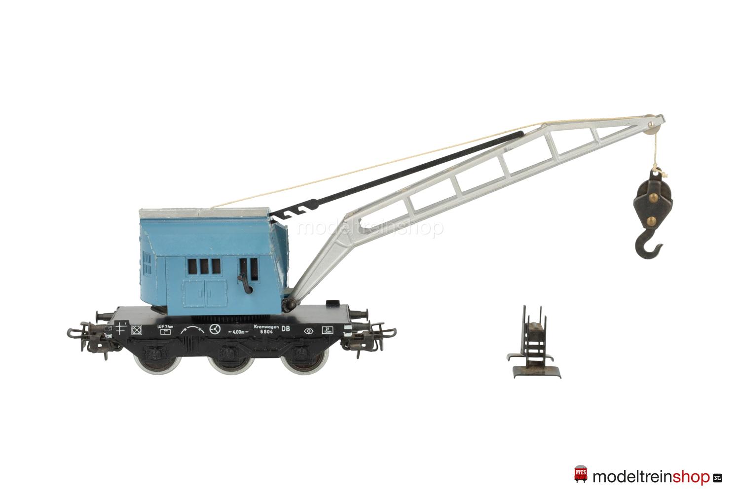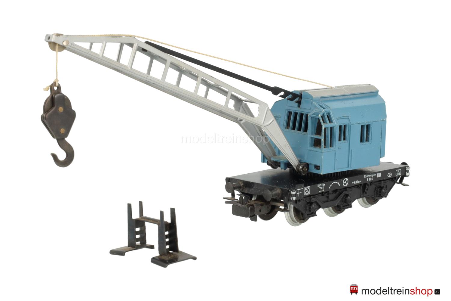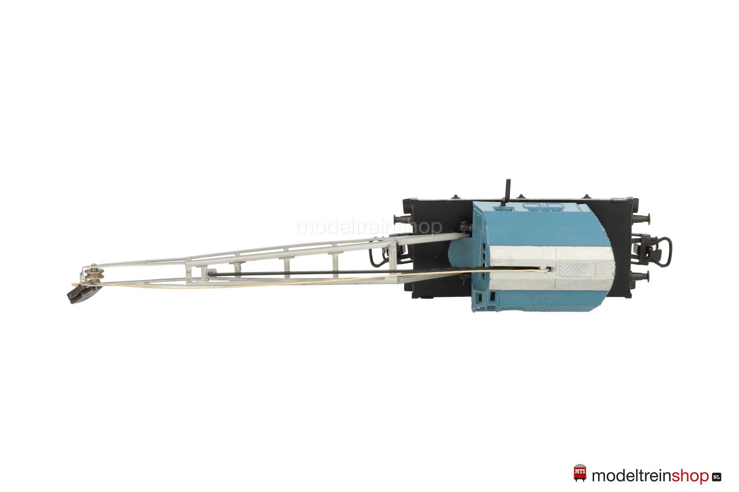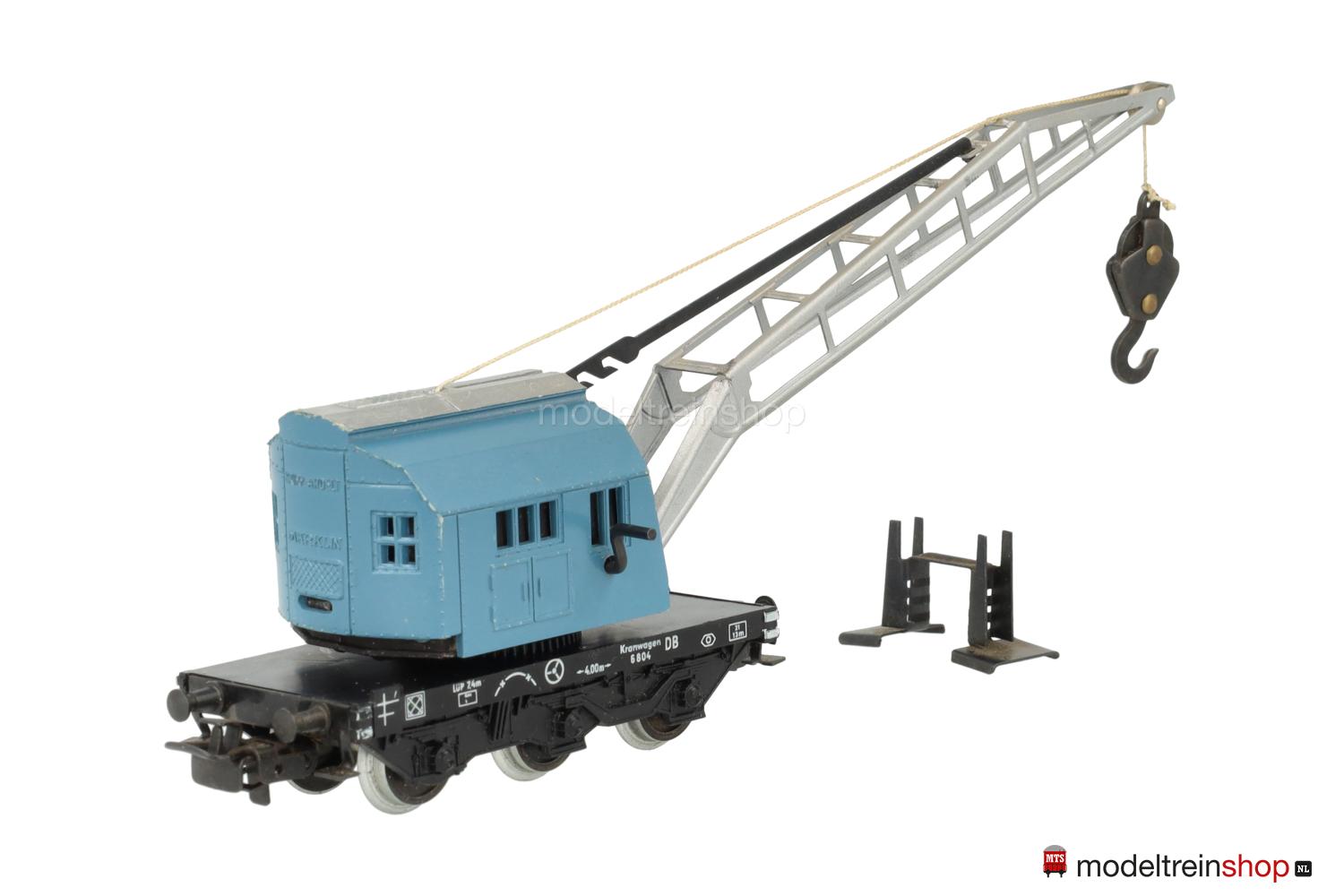 Schwarzes Blech-Untergestell, 3 Achsen, Pufferbohlen mit Trittstufen, aufgesetzter Kunststoff-Wagenboden mit weißer Rahmenbeschriftung. Aufbau: drehbares Kranhaus aus Kunststoff mit eingelegtem Gußkörper, beweglicher aluminiumfarbiger Blech-Ausleger mit Stufen-Höhenverstellung und Kranhaken aus Metall. Kurbel zum Heben und Senken des Kranhakens. Auslegerstütze zur Installation im Kran-Schutzwagen beigelegt.