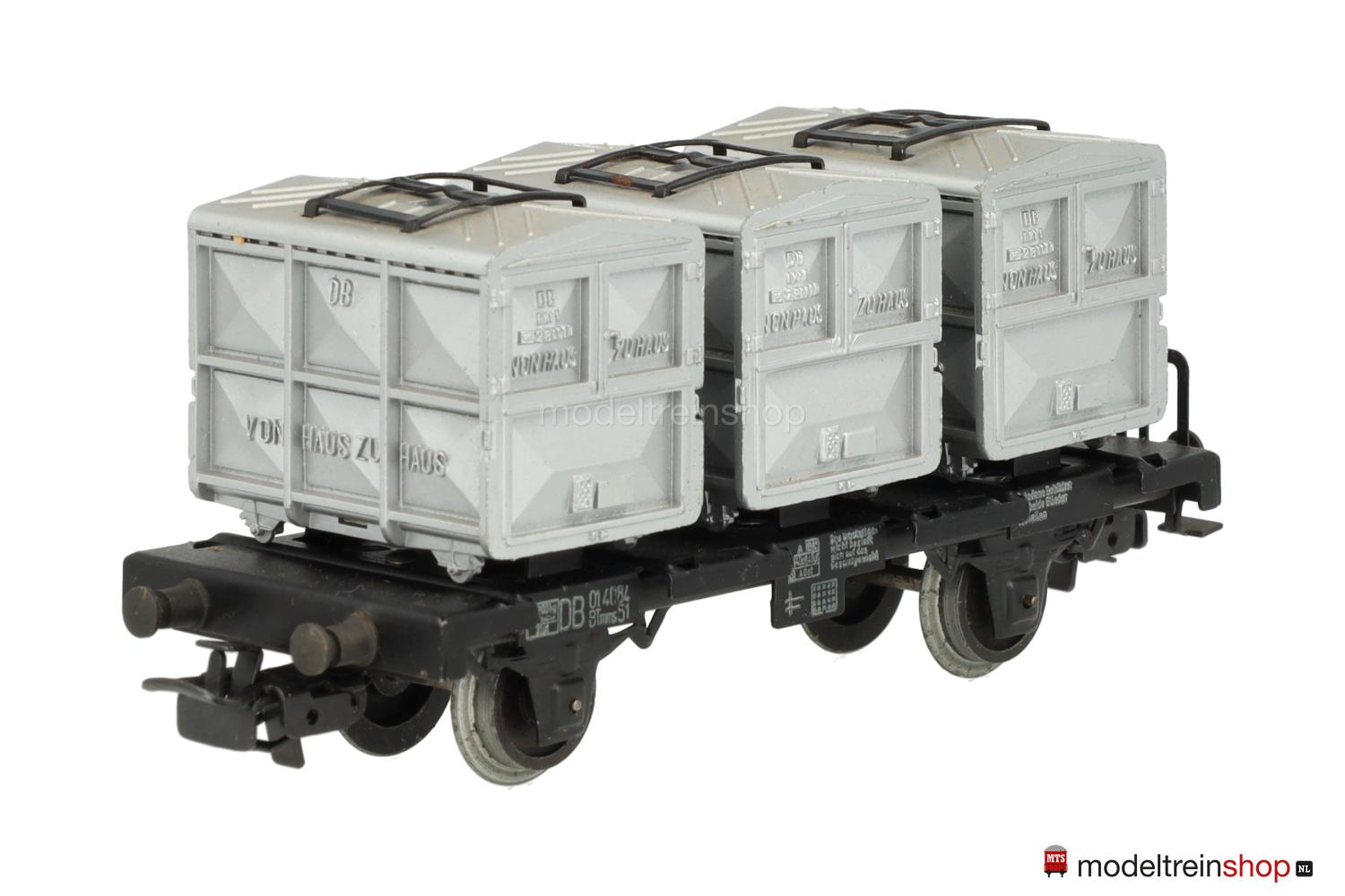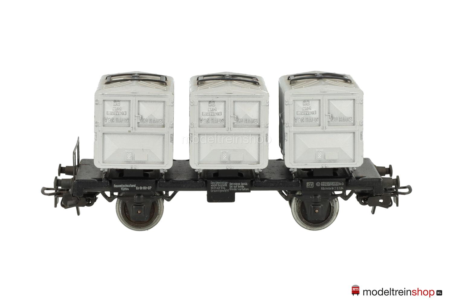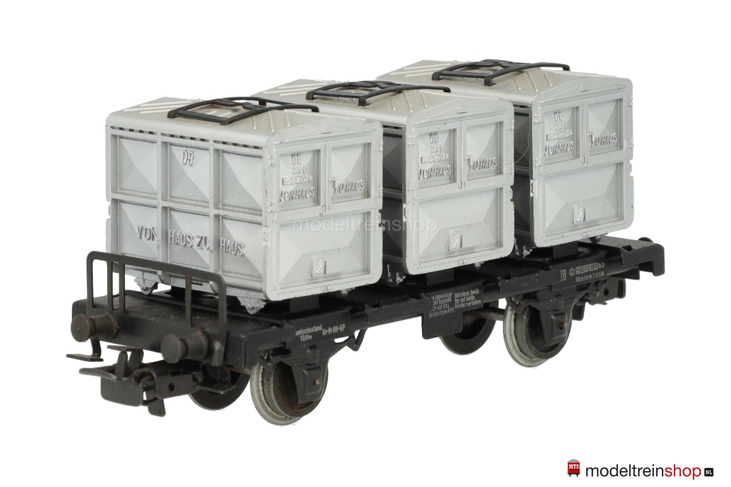 Schwarzes Guß-Untergestell mit Trittstufen, Schwarzer Blech-Wagenboden mit Bühnengeländer und Behälter-Halterungen, Bremserhaus aus Kunststoff, weiße Schiebebild-Rahmenbeschriftung, Wagen-Nr.: 012 200, beladen mit drei aluminiumfarbigen Kastenbehältern aus Kunststoff, erhabene Aufschriften, erhabene Schriftzüge: “VON HAUS ZU HAUS”, die in den Behältern eingelassenen Blechbügel ermöglichen den Transport mit dem Drehkran 7051.