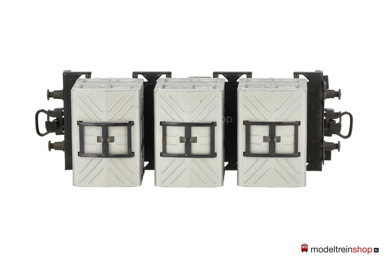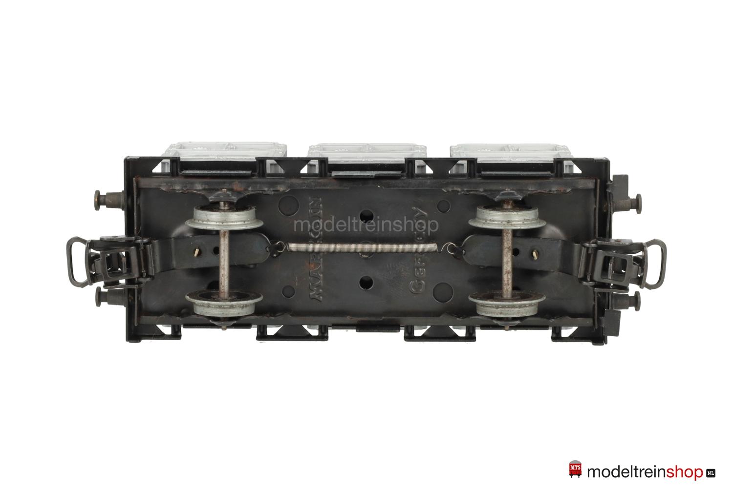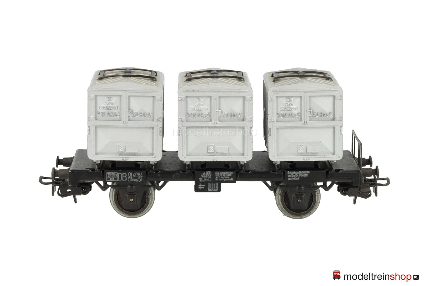 Schwarzes Guß-Untergestell mit Trittstufen, Schwarzer Blech-Wagenboden mit Bühnengeländer und Behälter-Halterungen, Bremserhaus aus Kunststoff, weiße Schiebebild-Rahmenbeschriftung, Wagen-Nr.: 012 200, beladen mit drei aluminiumfarbigen Kastenbehältern aus Kunststoff, erhabene Aufschriften, erhabene Schriftzüge: “VON HAUS ZU HAUS”, die in den Behältern eingelassenen Blechbügel ermöglichen den Transport mit dem Drehkran 7051.