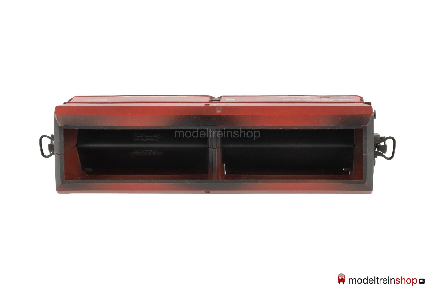 Schwarzes Blech-Untergestell, Bremserbühnen, Drehgestelle. Kunststoff-Aufbau – rotbraun / braun und schattiert, weiße Aufschriften, angegossene Handgriffe an den Wagenecken, Metall-Leitern zwischen den Entladeklappen.