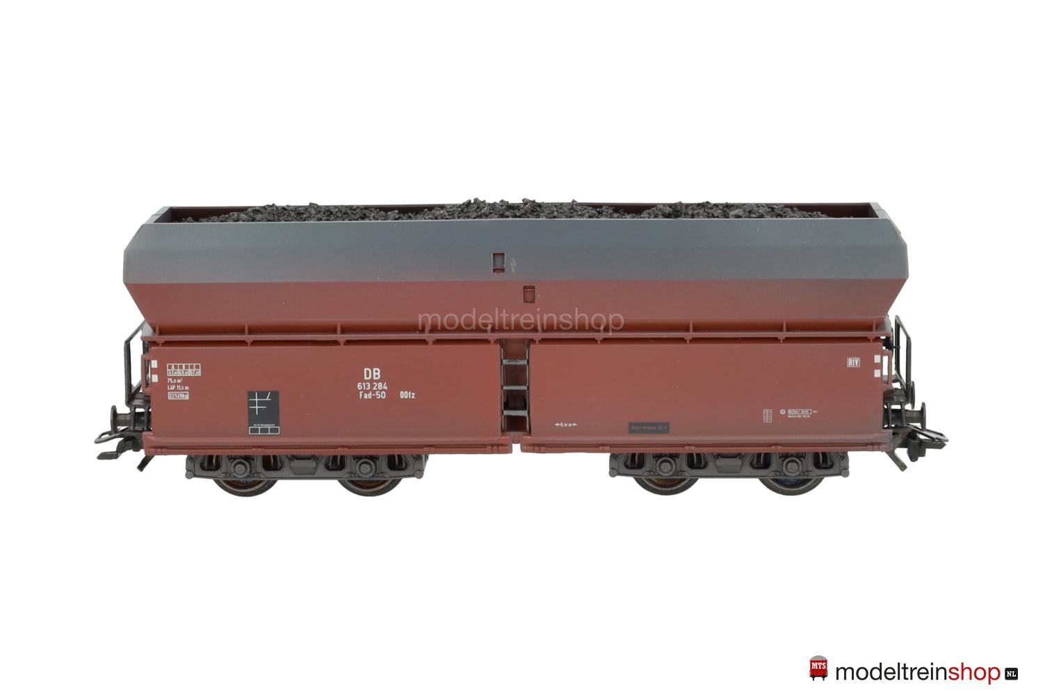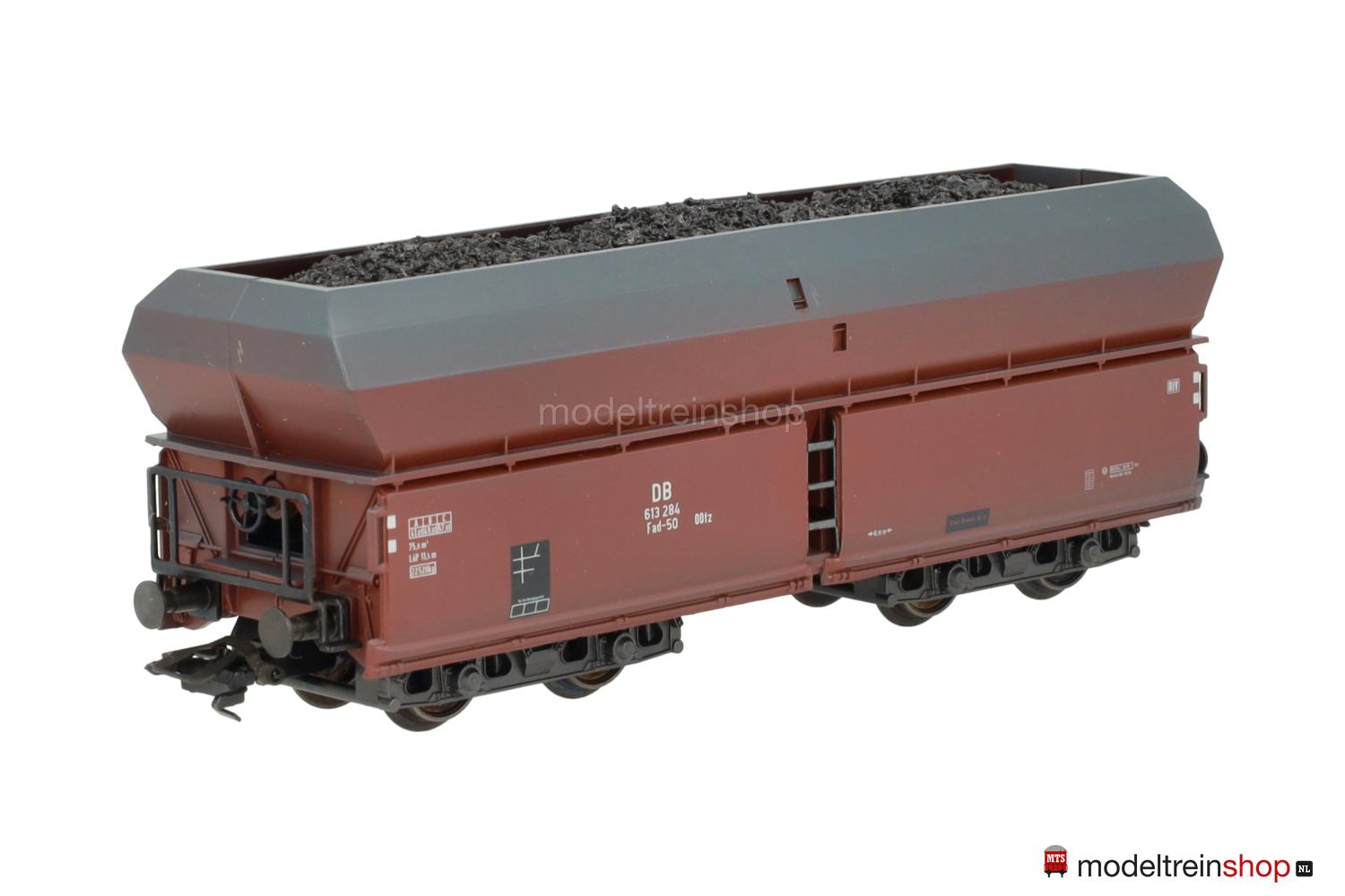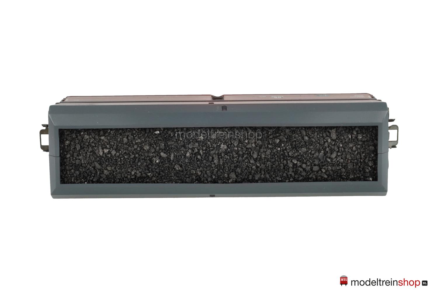 Schwarzes Blech-Untergestell, Bremserbühnen, Minden-Siegen-Drehgestelle (Typ E-c). Kunststoff-Aufbau – braun und gealtert, oberer Teil des Aufbaus dunkelgrau, weiße Aufschriften, an den Wagenecken angegossene Handgriffe, Metall-Leitern zwischen den Entladeklappen, beladen mit echtem Koks in maßstäblicher Körnung.
