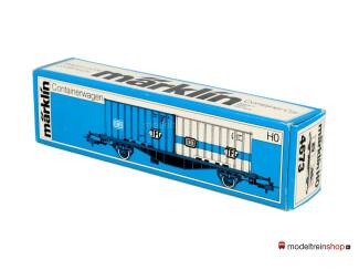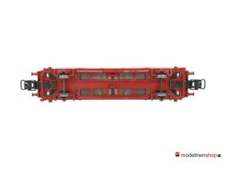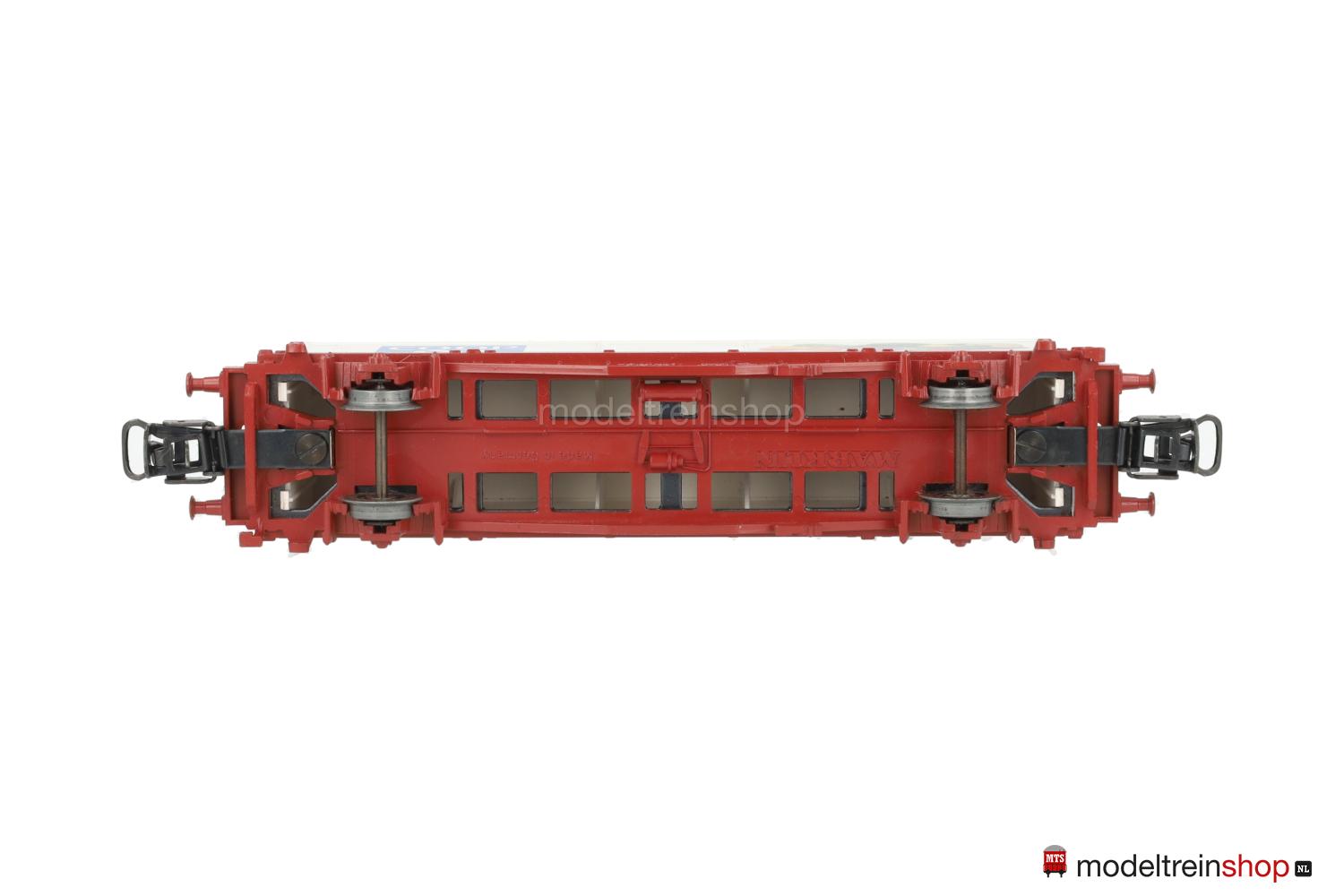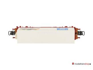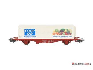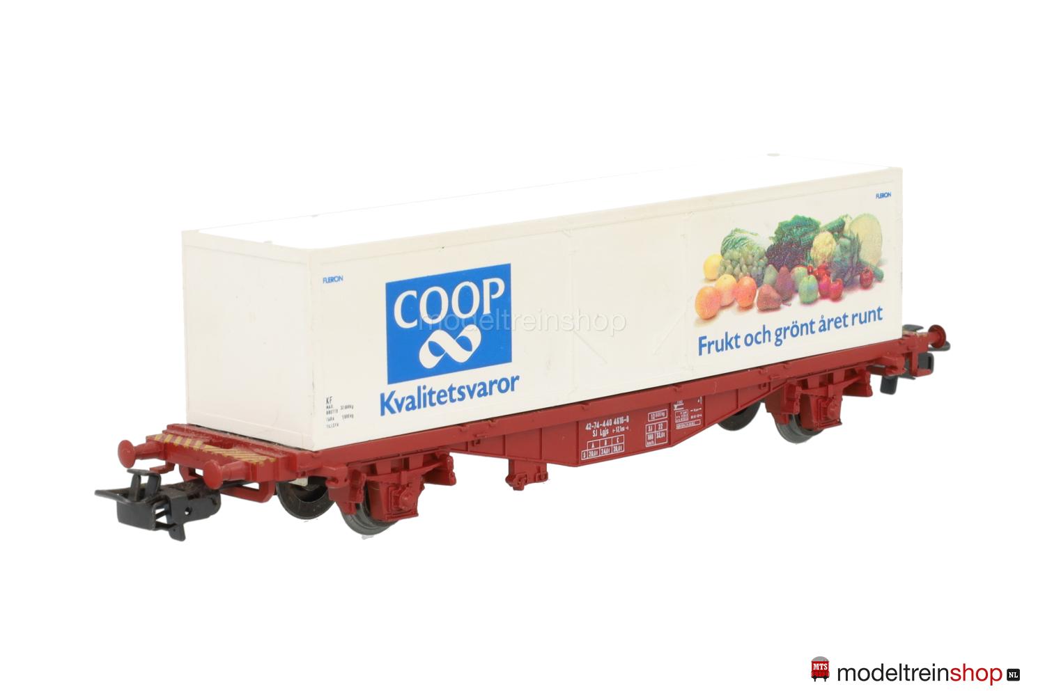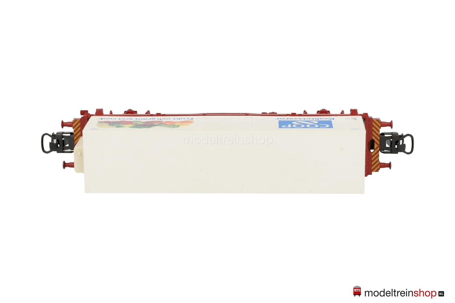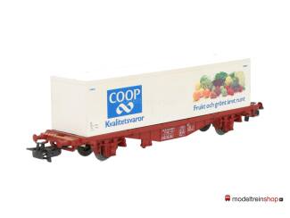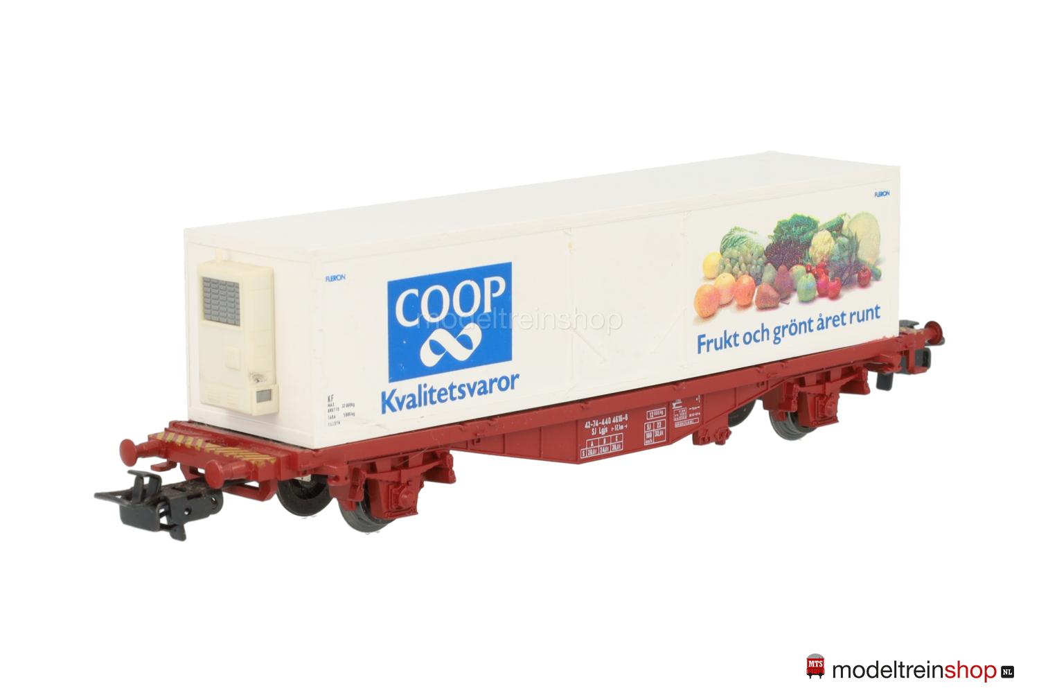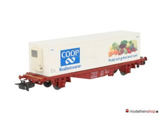 Blech/Kunststoff-Untergestell mit weißer Rahmenbeschriftung, Wagen-Nr.: 440 4 616-8, gelber Warnanstrich an den Wagenenden, beladen mit einem 40′-Kühl-Container aus Kunststoff. Weißer Container mit angesetztem Kühlaggregat, blaue Aufschriften: “Kvalitetsvaror” und “Frukt och grönt aret runt”, blaue “COOP”-Embleme und mehrfarbige Abbildungen von Obst und Gemüse.