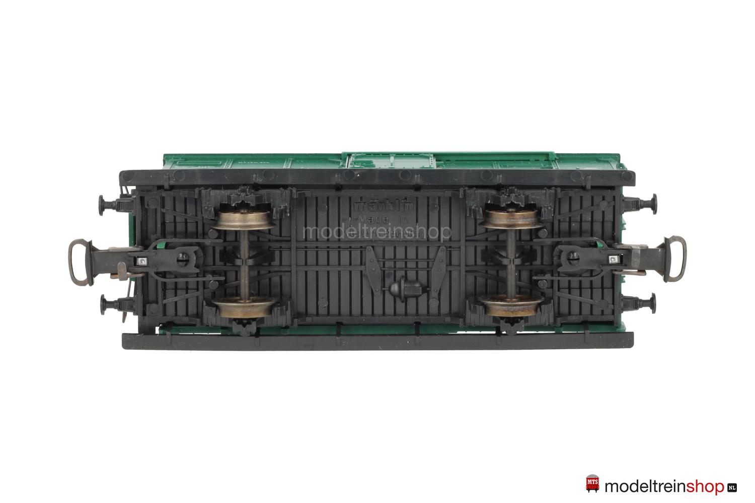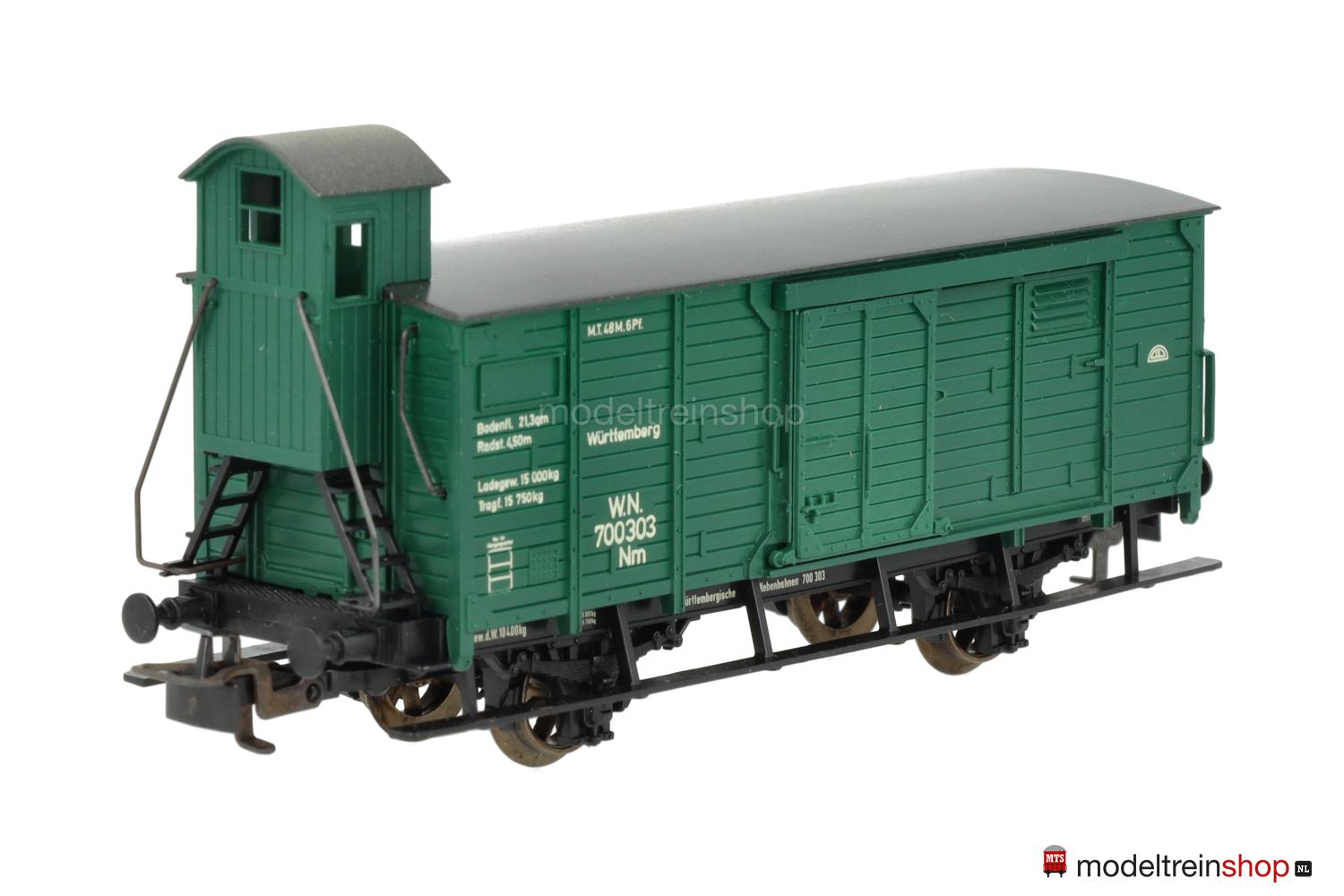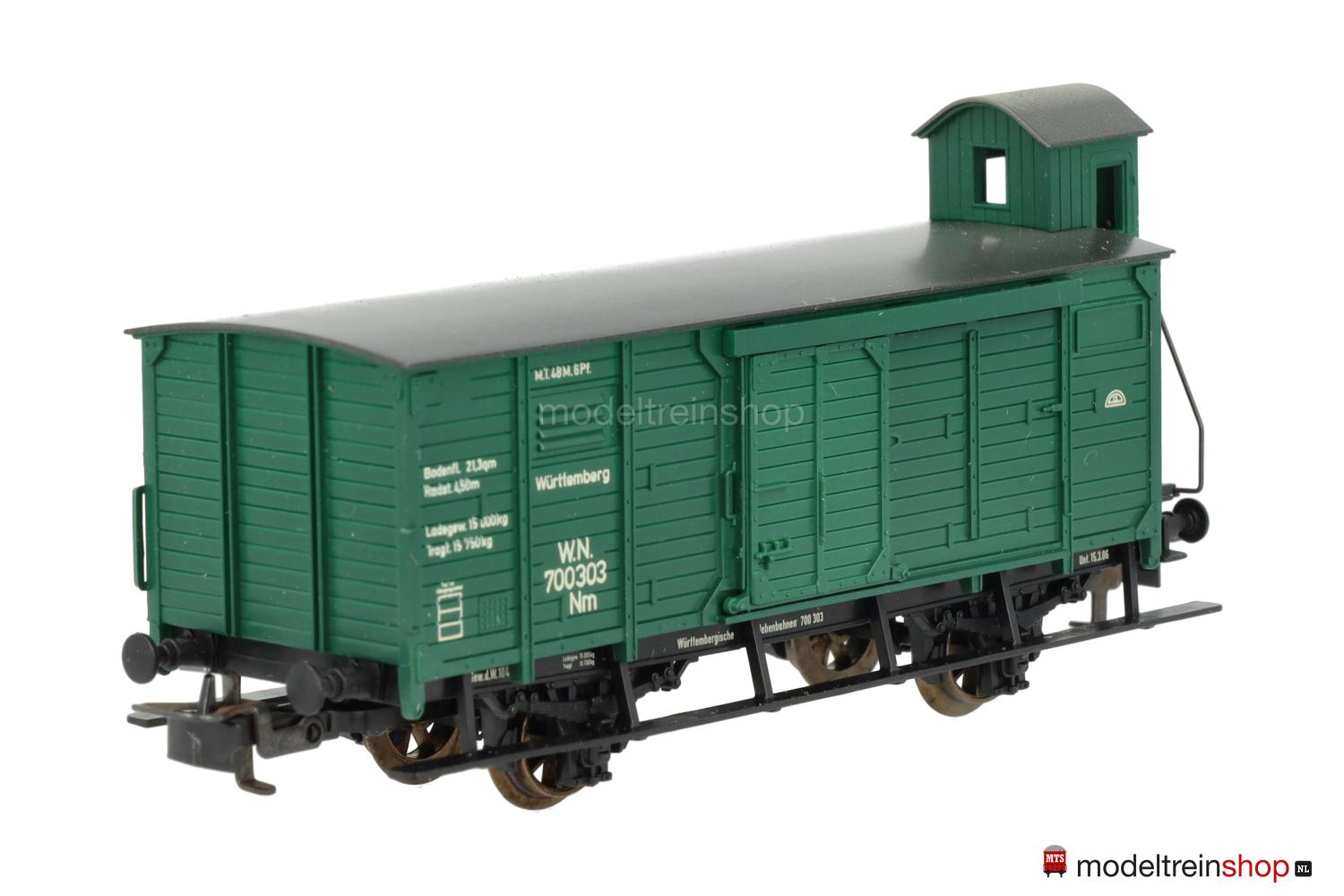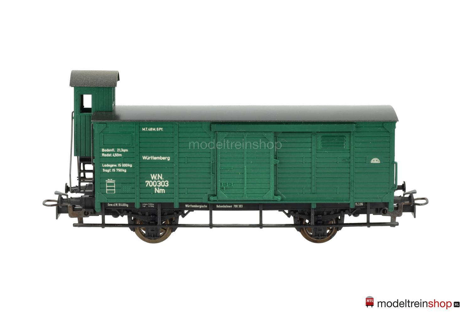 Dunkelgrüner Wagenkasten, dunkelgrünes Bremserhaus, graues und schattiertes Dach, weiße Aufschriften, Wagen-Nr.: 700303, vernickelte Griffstangen.