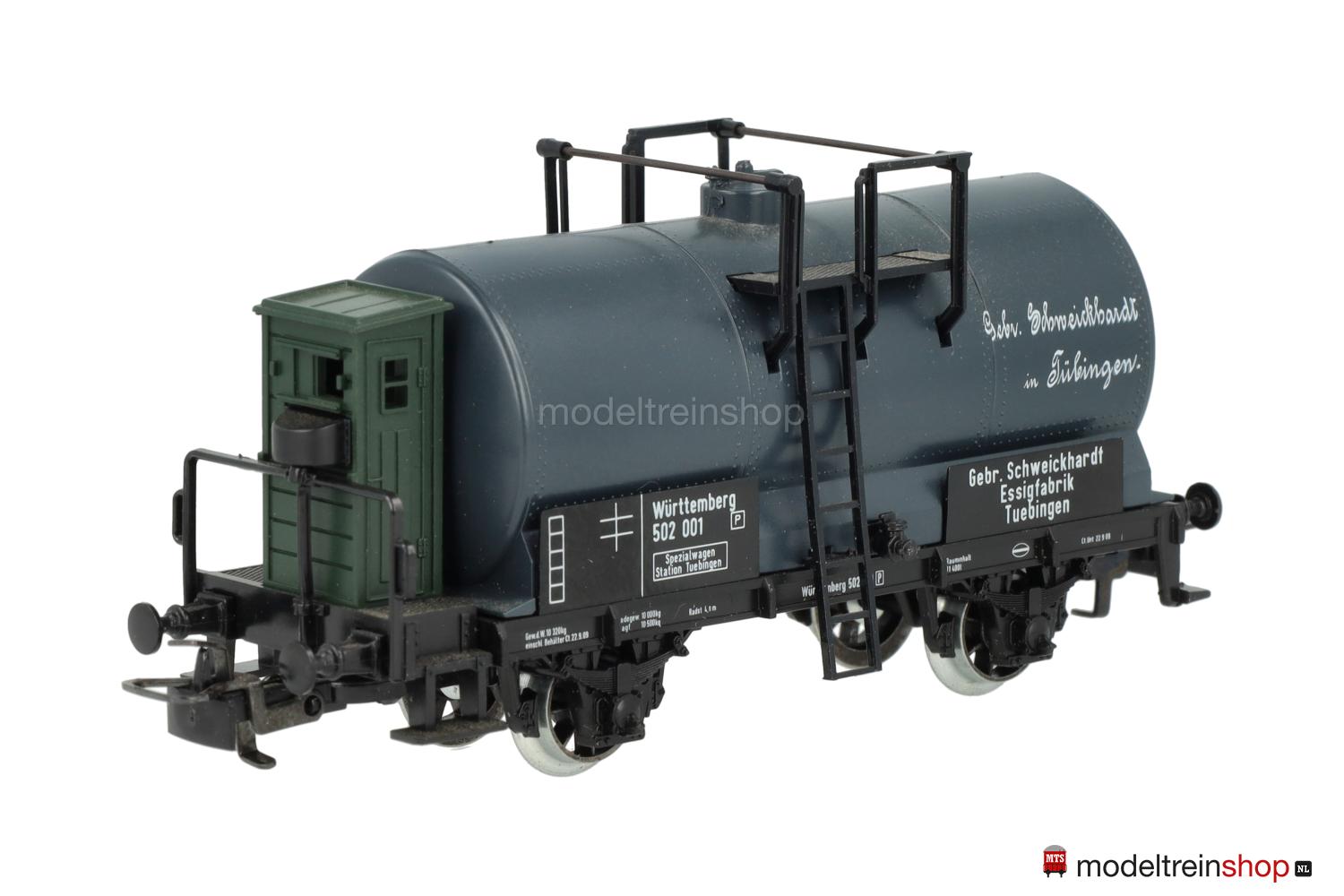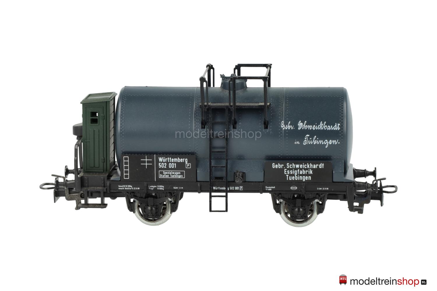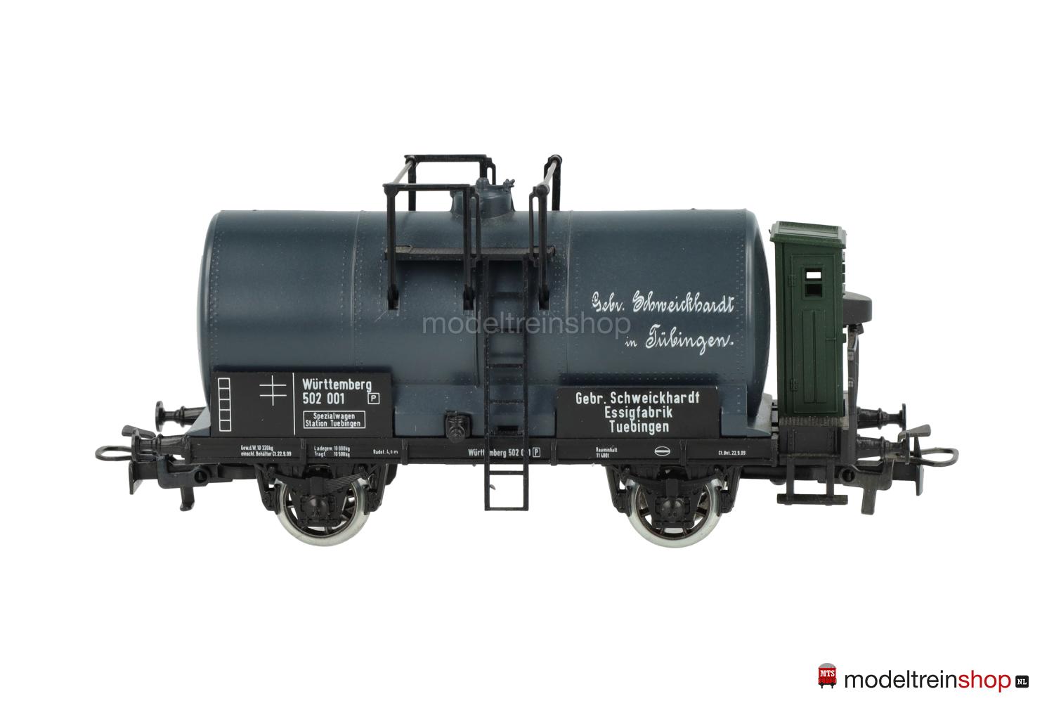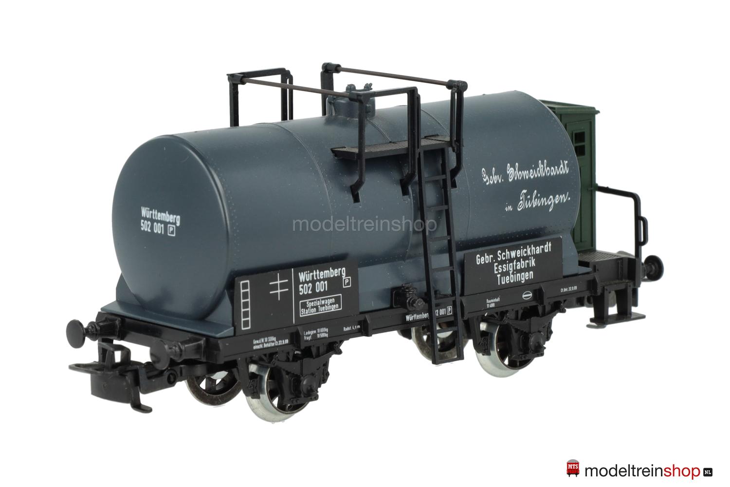 Schwarzes Kunststoff-Untergestell mit dunkelgrünem Bremserhaus, Trittstufen und weißer Rahmenbeschriftung, Stangenpuffer, Speichenräder. Dunkelgrauer Kunststoff-Kessel, weiße Schriftzüge: “Gebr. Schweickhardt in Tübingen”, Kesselanbauten aus Kunststoff und Metall, schwarze Gattungs- und Eigentumsschilder mit weißen Aufschriften, Wagen-Nr.: 502 001, Eigentumshinweis: “Gebr. Schweickhardt Essigfabrik Tuebingen”.