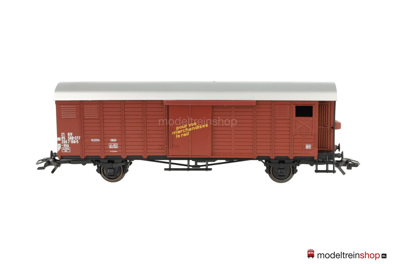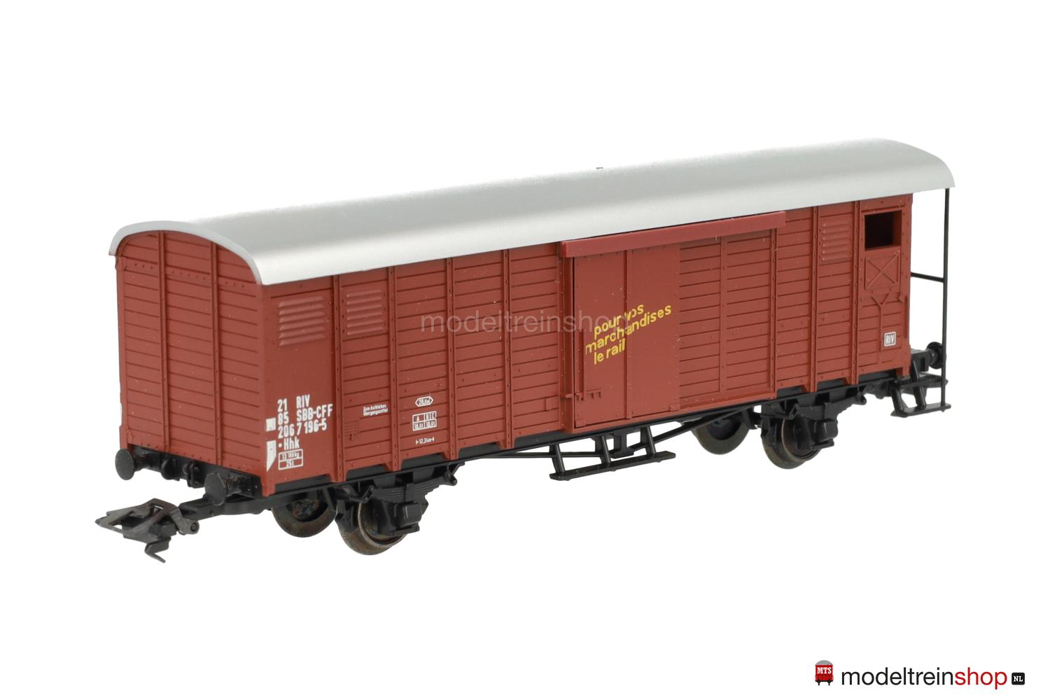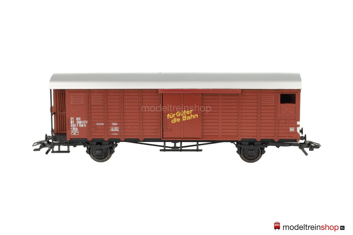 Brauner Wagenkasten, silberfarbenes Dach, Wagen-Nr.: 206 7 196-5, Schiebetüren mit gelben Aufschriften in deutsch: “für Güter die Bahn” und französisch: “pour vos marchadises le rail”.