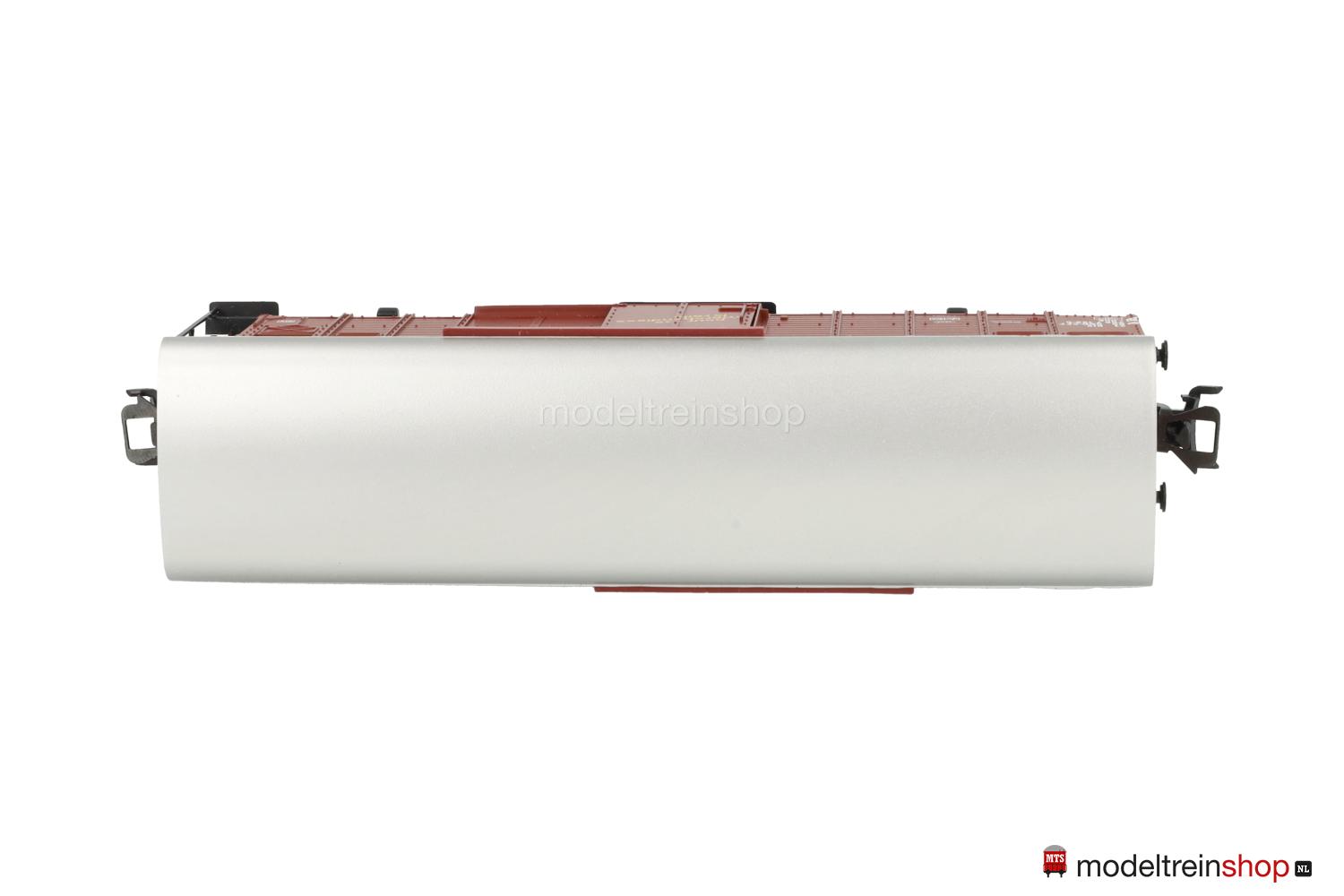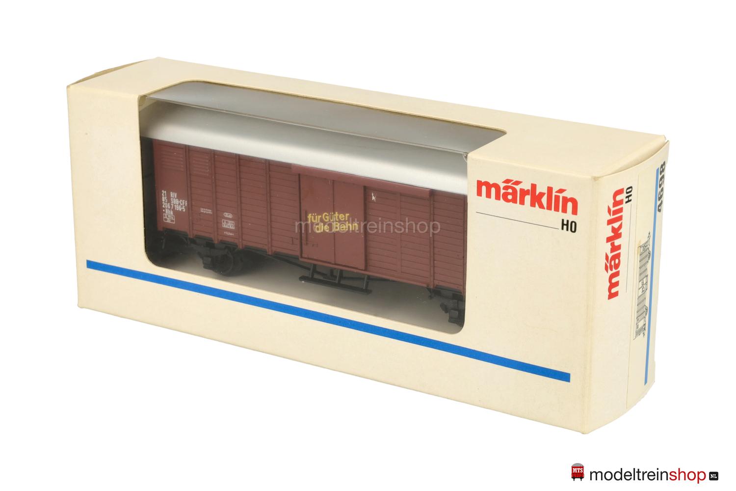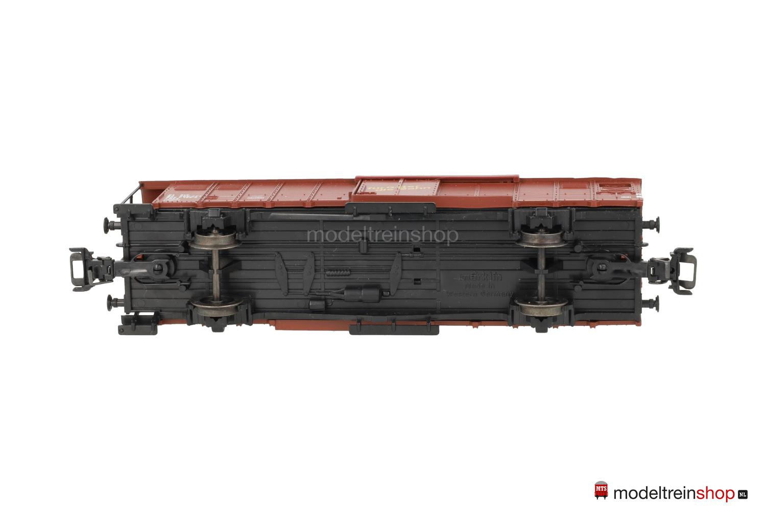 Brauner Wagenkasten, silberfarbenes Dach, Wagen-Nr.: 206 7 196-5, Schiebetüren mit gelben Aufschriften in deutsch: “für Güter die Bahn” und französisch: “pour vos marchadises le rail”.
