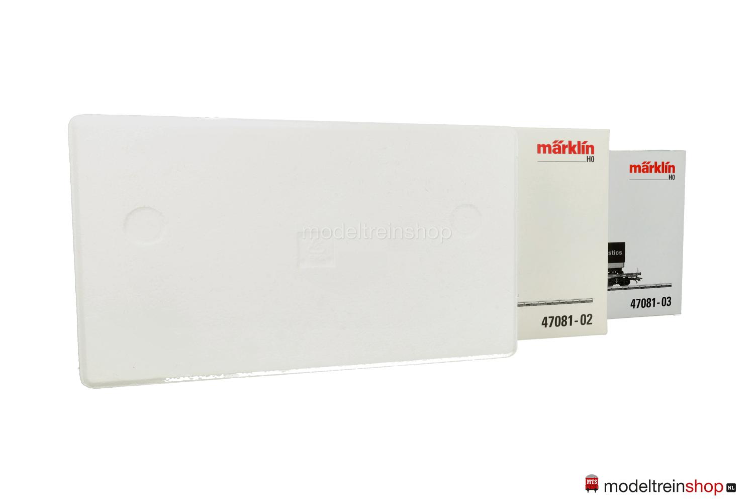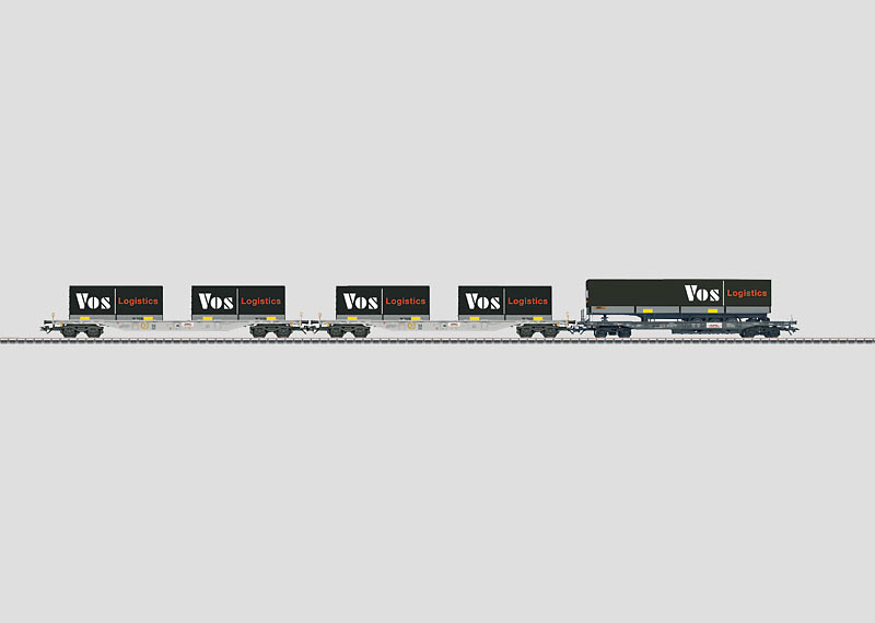 Model:Â Kangoeroewagen: frame, bodem en laadbak van metaal. Speciale draaistellen in lage constructie. Vele gemonteerde details. Ladinghouders verstelbaar. Beladen met een opleggermodel. Containerwagen: Draaistellen type Y25. Opengewerkte metalen wagenvloer volgens het voorbeeld met markante visbuikachtige buitenlangsdragers. Elke draagwagen is beladen met 2 vrachtwagen-wisselbakken. Stempels voor wisselbakken worden afzonderlijk meegeleverd. Alle wagens en ladingen met verschillende bedrijfsnummers en steeds afzonderlijk verpakt. Extra buitenverpakking. Totale lengte over buffers 64,4 cm.