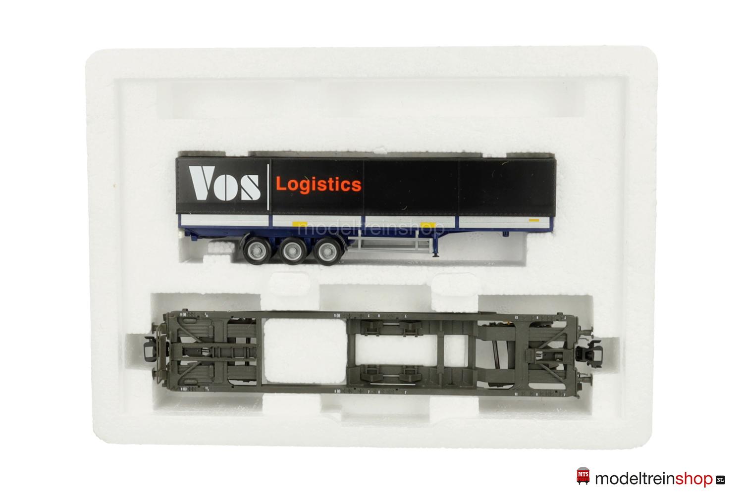 Umbragraue UIC-Standard-Drehgestelle (Typ G-n, G-m) aus Kunststoff, ein Drehgestell mit angesteckten gelben Handrädern. Umbragraues Gußgestell, angesteckte Arbeitsbühne mit Trittstufen aus Kunststoff, weiße Rahmenbeschriftung, Zurrhaken, verstellbare Ladehalterungen. Wagen-Nr.: 475 4 582-5, weiße Aufschriften und HUPAC-Embleme. Beladen mit Sattelauflieger (Herpa-Modell) der Firma “VOS | Logistics”.