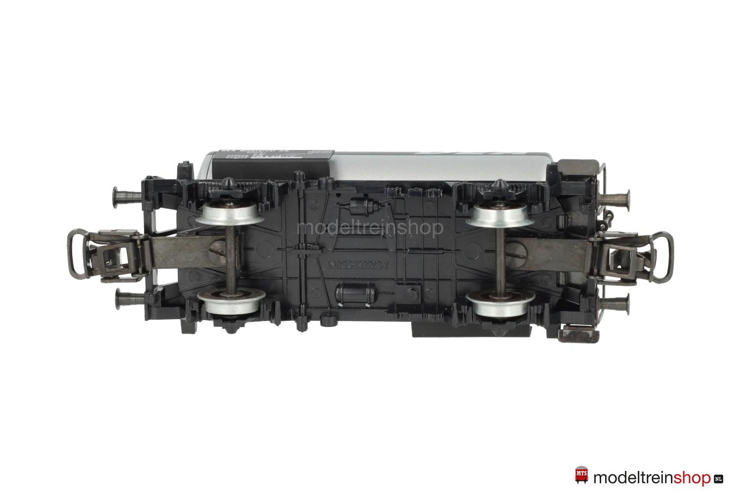 Schwarzes Kunststoff-Untergestell mit weißer Rahmenbeschriftung, angesetzten Trittbrettern und Bremserbühne aus Metall, bewegliche Bremskurbel. Aluminiumfarbiger Kunststoff-Kessel mit umlaufendem schwarzem Streifen, Gattungsschilder mit weißen Aufschriften.
