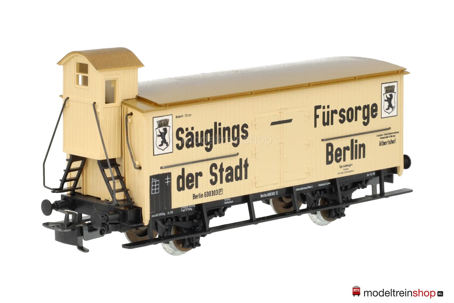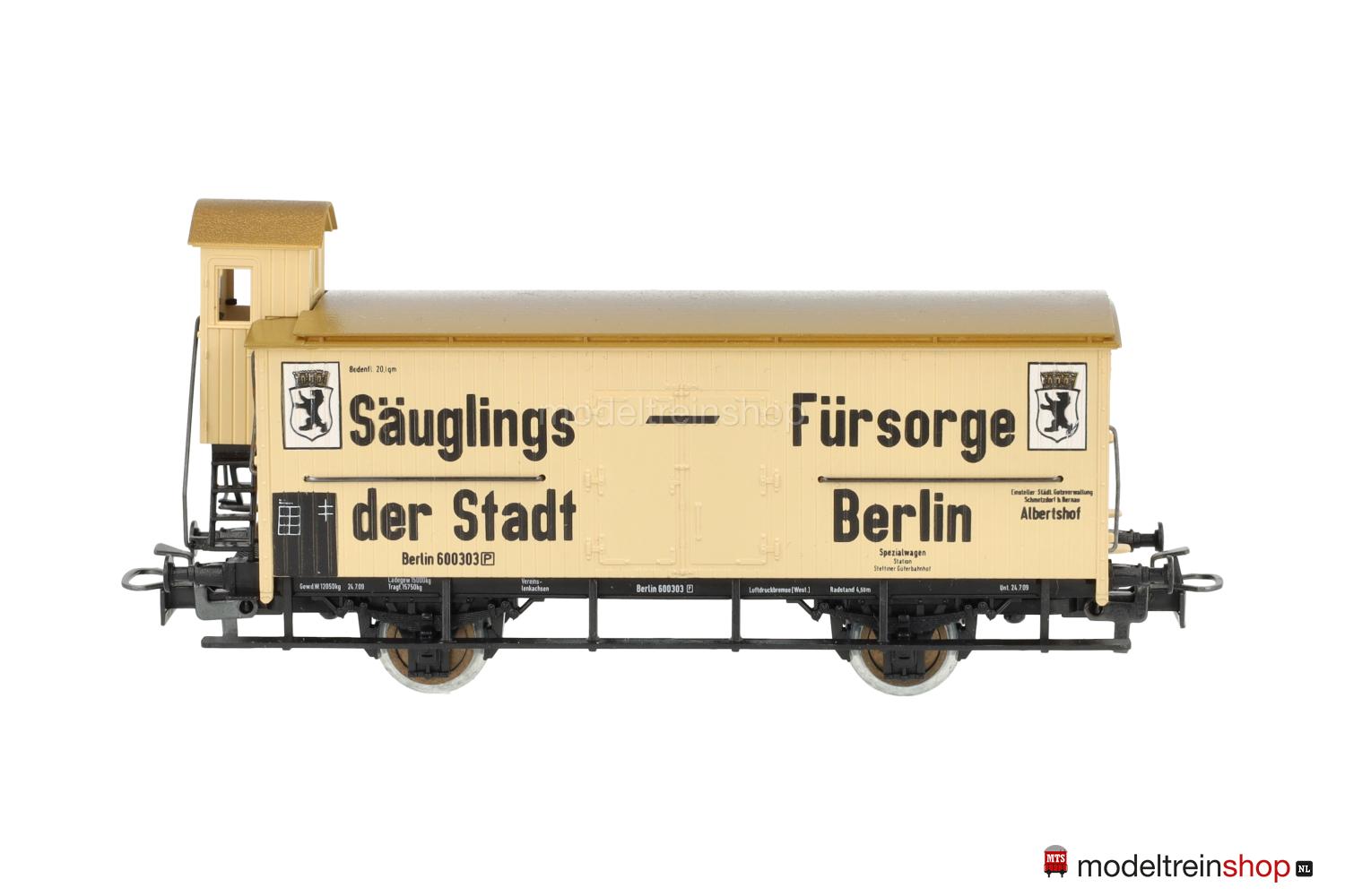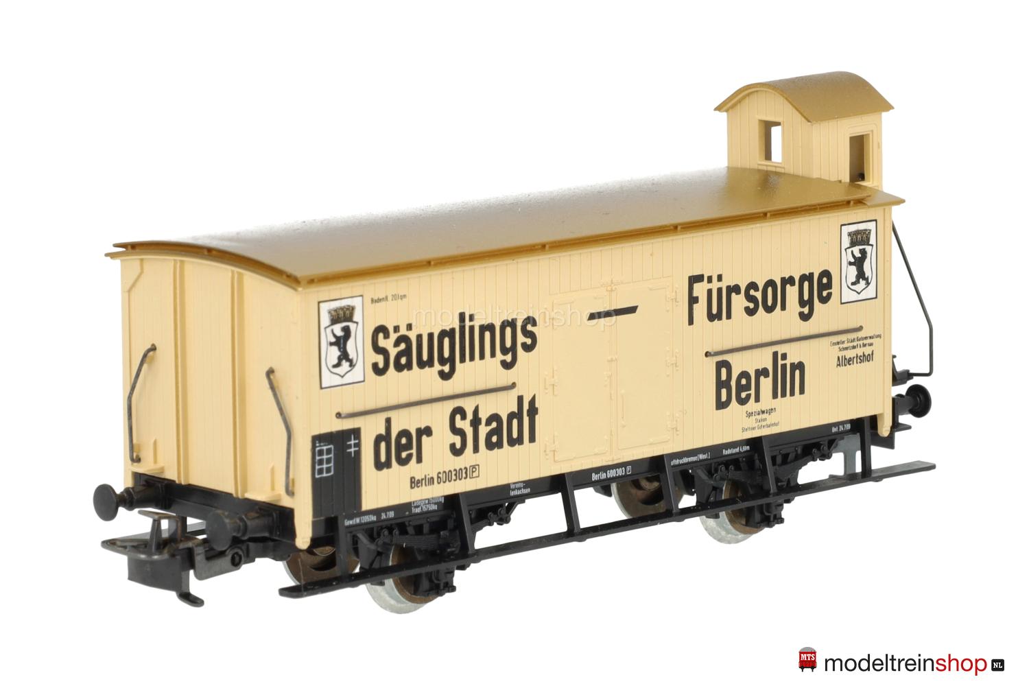 Schwarzes Untergestell mit Trittbrettern, Stangenpuffern und weißer Rahmenbeschriftung. Kunststoff-Aufbau: beigefarbener Wagenkasten, braunbeigefarbenes und schattiertes Dach, schwarze Aufschriften, Wagen-Nr.: Berlin 600303, schwarze Aufschrift: “Säuglings-Fürsorge der Stadt Berlin”, rundum angesteckte Handläufe aus Metall, Stiegen am Bremserhaus.