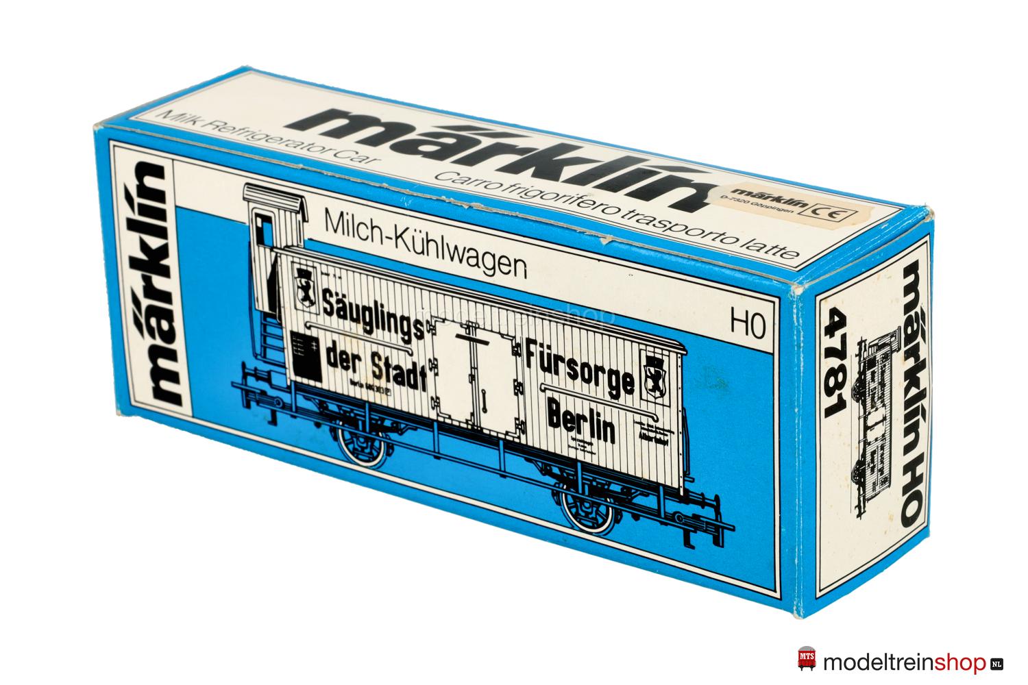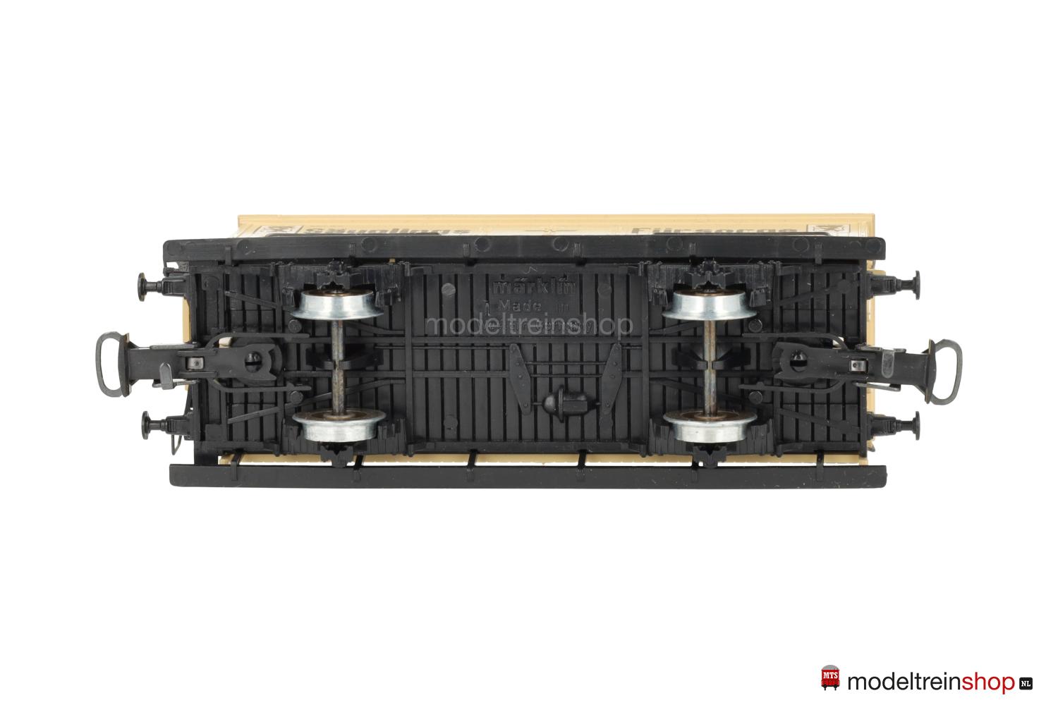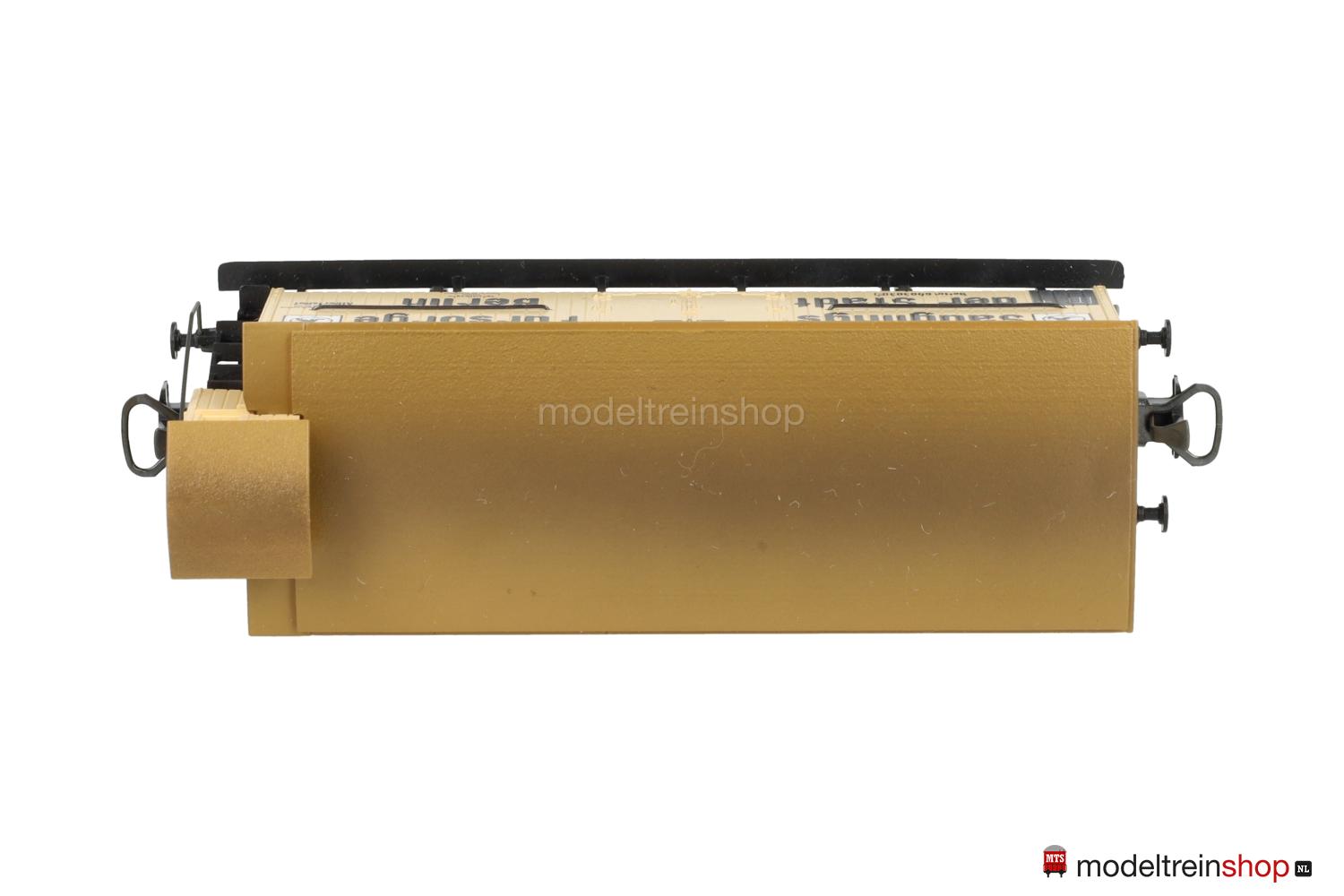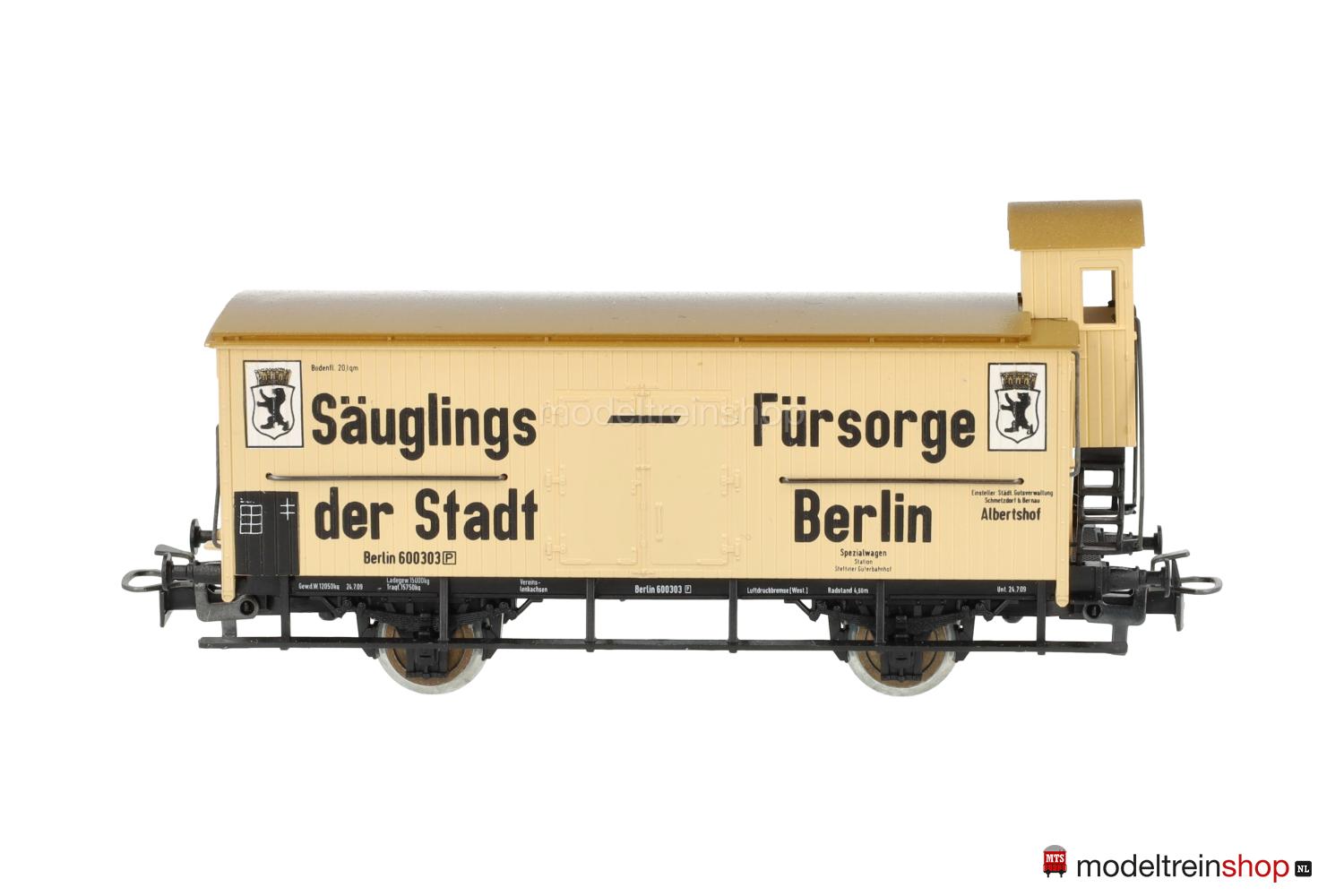 Schwarzes Untergestell mit Trittbrettern, Stangenpuffern und weißer Rahmenbeschriftung. Kunststoff-Aufbau: beigefarbener Wagenkasten, braunbeigefarbenes und schattiertes Dach, schwarze Aufschriften, Wagen-Nr.: Berlin 600303, schwarze Aufschrift: “Säuglings-Fürsorge der Stadt Berlin”, rundum angesteckte Handläufe aus Metall, Stiegen am Bremserhaus.