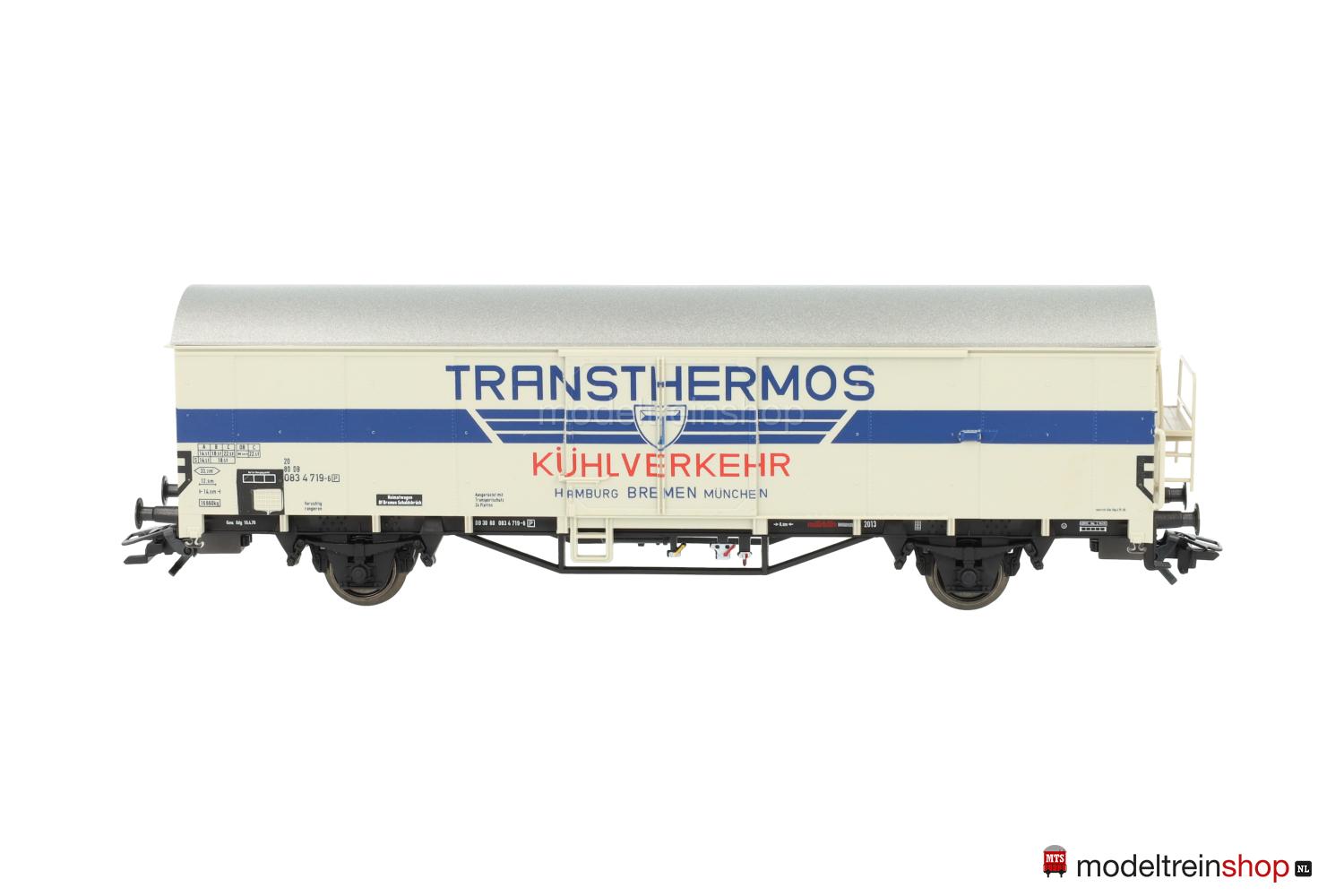 Schwarzes Kunststoff-Untergestell mit angegossenen Trittstufen, Sprengwerk und mehrfarbigen Bedienhebeln, weiß/rote Rahmenbeschriftung. Wagenkasten aus kieselgrauem Kunststoff, eine Stirnseite mit Eisluke und beiger Arbeitsbühne aus Kunststoff, durchbrochene Haltegriffe, perlhellgraues Dach. Wagen-Nr.: 083 4 719-6, schwarze Aufschriften, dunkelblau/kieselgraue Transthermos-Embleme, dunkelblau/rote Schriftzüge “TRANSTHERMOS KÜHLVERKEHR” und “HAMBURG BREMEN MÜNCHEN”, schwarze Bremszeichen an den Wagenecken.