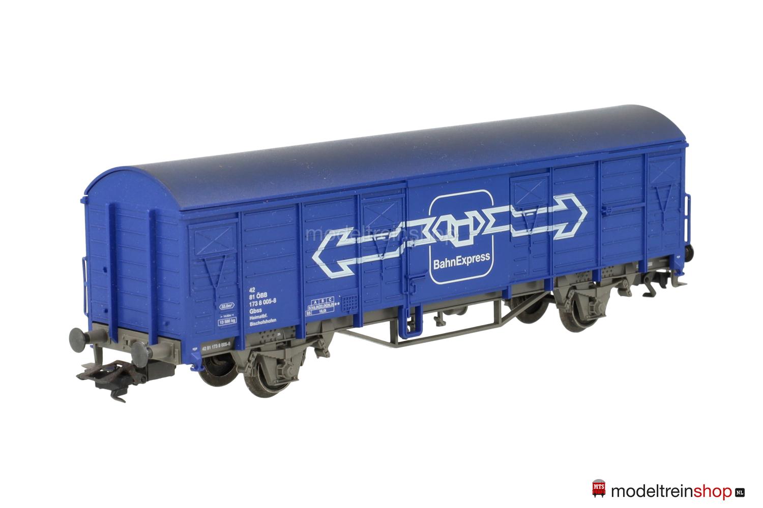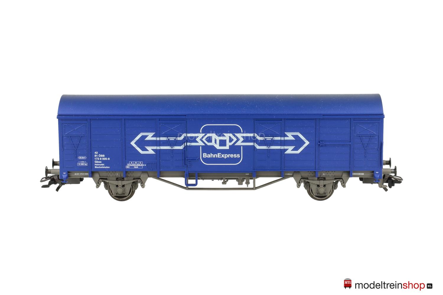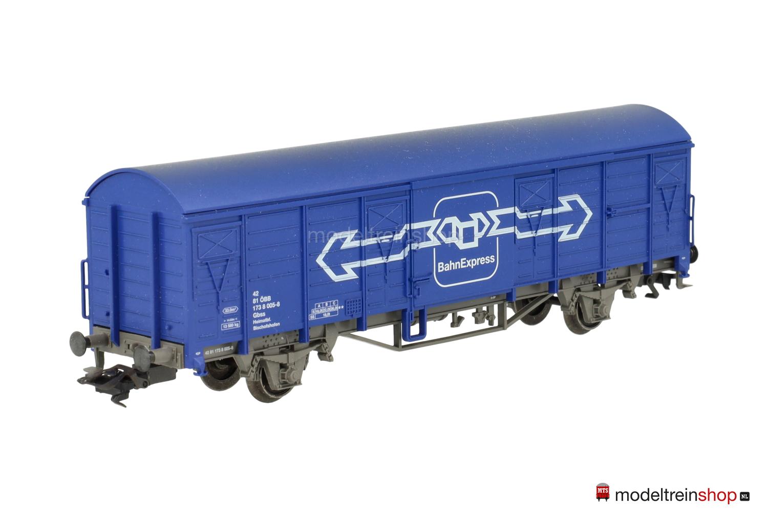 Graues Kunststoff-Untergestell. Kunstsoff-Aufbau: Wagenkasten und Dach blau, weiße Aufschriften, Wagen-Nr.: 173 8 005-8, weiße “BahnExpress”-Embleme.