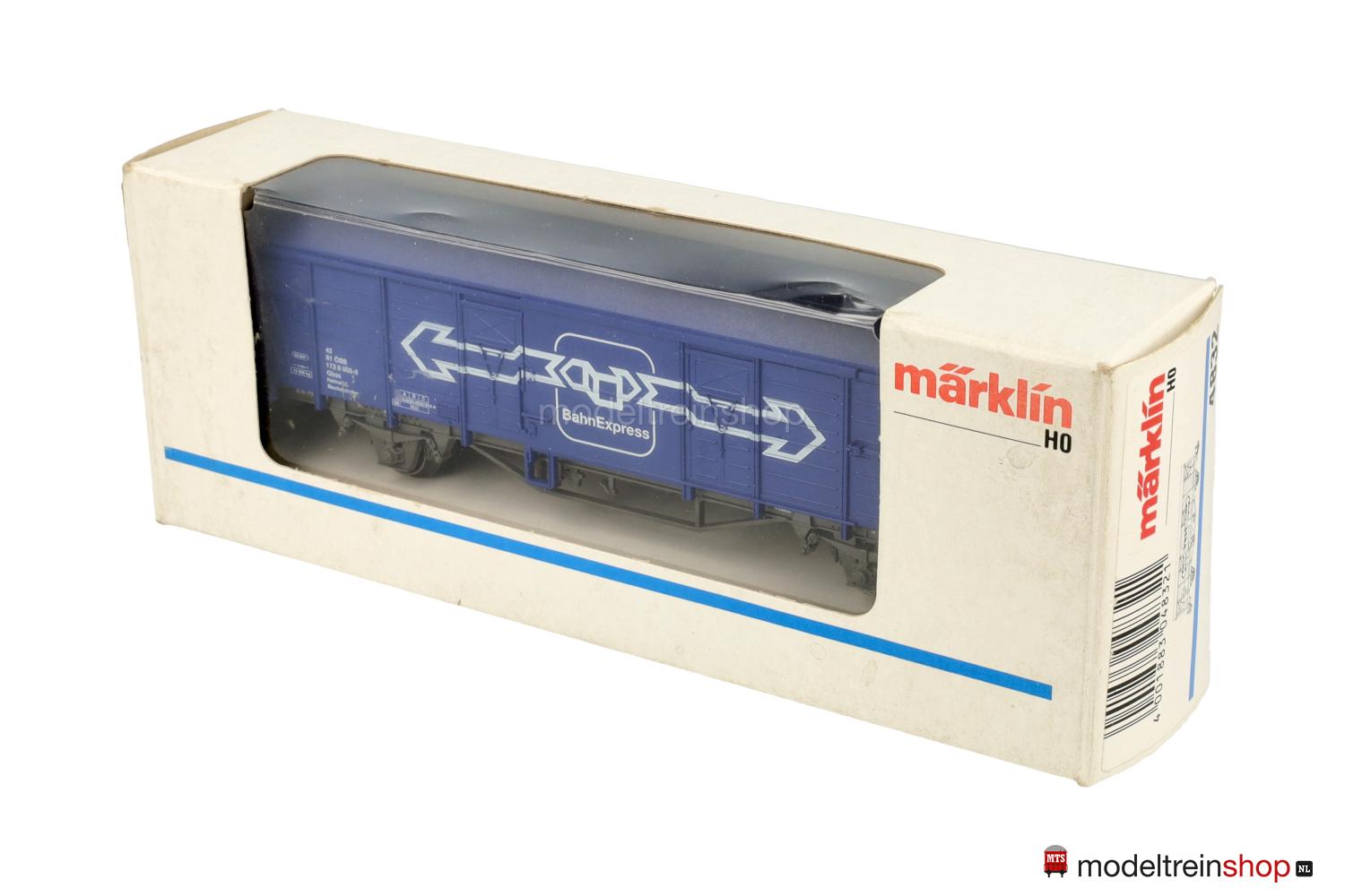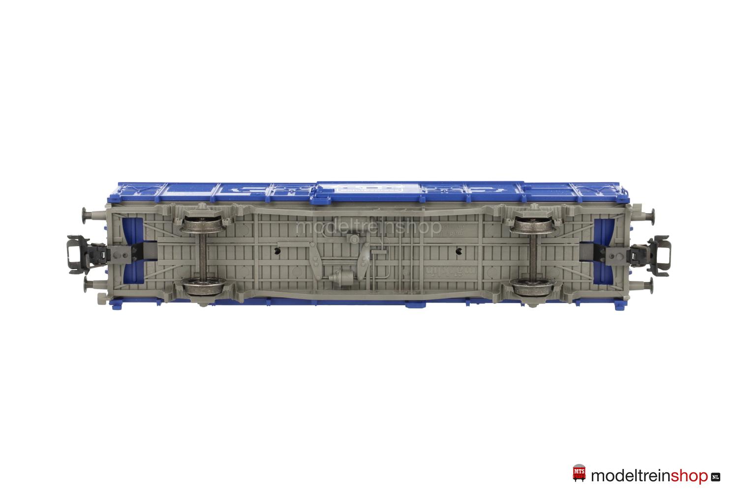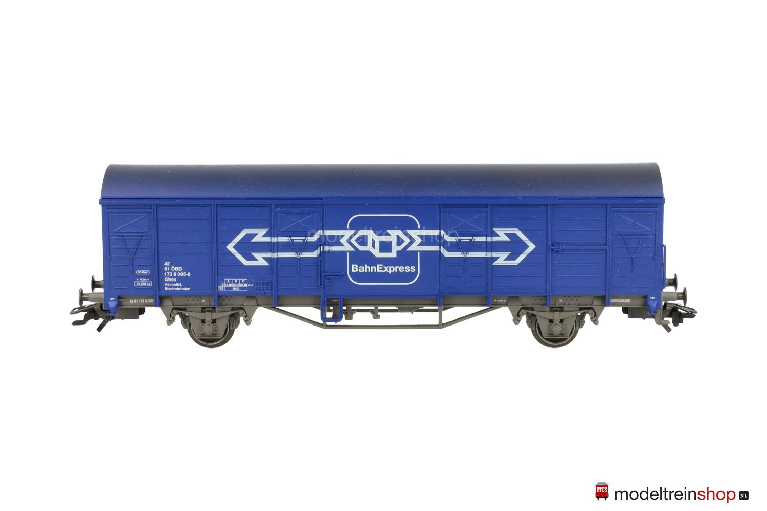Graues Kunststoff-Untergestell. Kunstsoff-Aufbau: Wagenkasten und Dach blau, weiße Aufschriften, Wagen-Nr.: 173 8 005-8, weiße “BahnExpress”-Embleme.