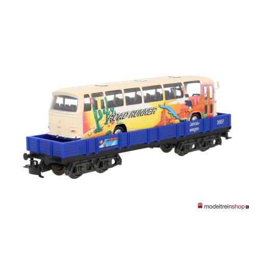 Dunkelgraue Drehgestelle aus Kunststoff, schwarzes Kunststoff-Untergestell, blauer Wagenkasten aus Kunststoff, blaue Ladefläche. Ohne Wagen-Nr., mehrfarbige 1 FC märklin-Embleme, weiße Schriftzüge “Jahreswagen 2007”. Beladen mit einem Omnibus.