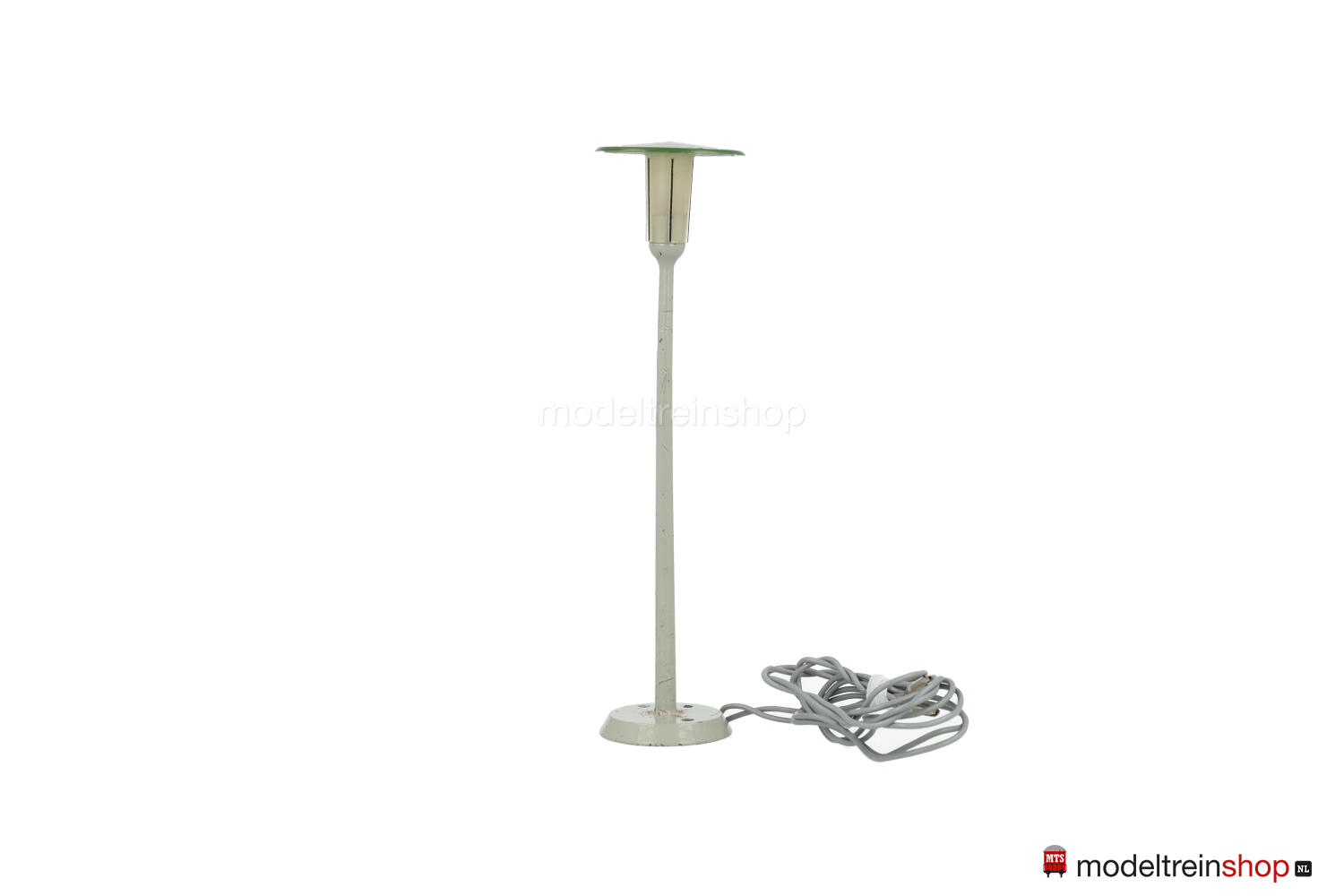 Ronde gietijzeren voet met taps toelopende gietijzeren paal, grijs, helder lichaam met platte groene kap, snoer