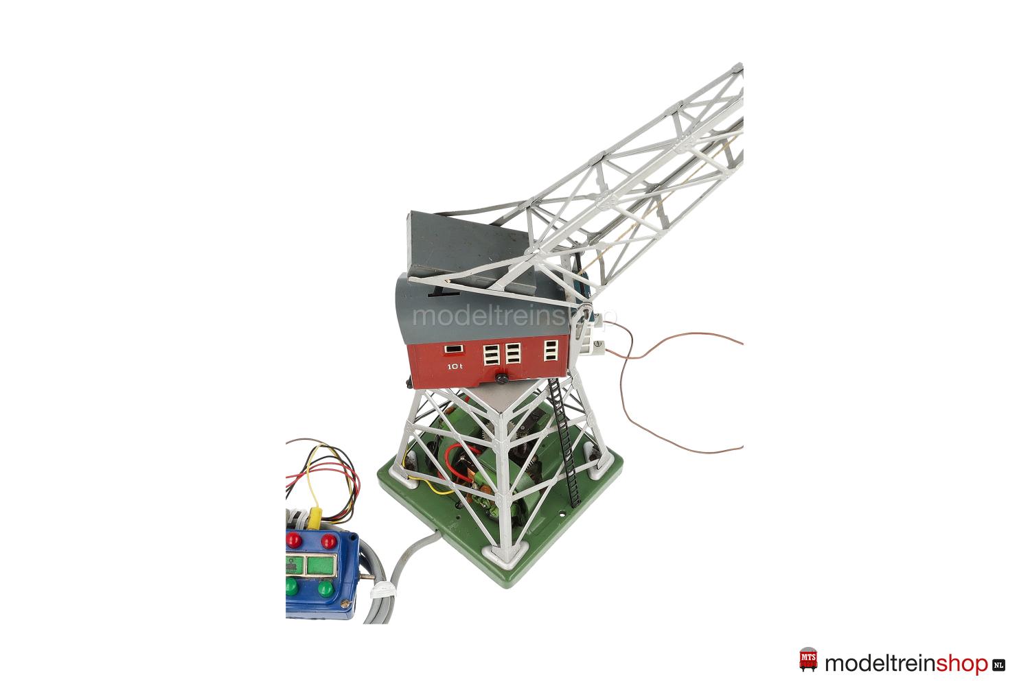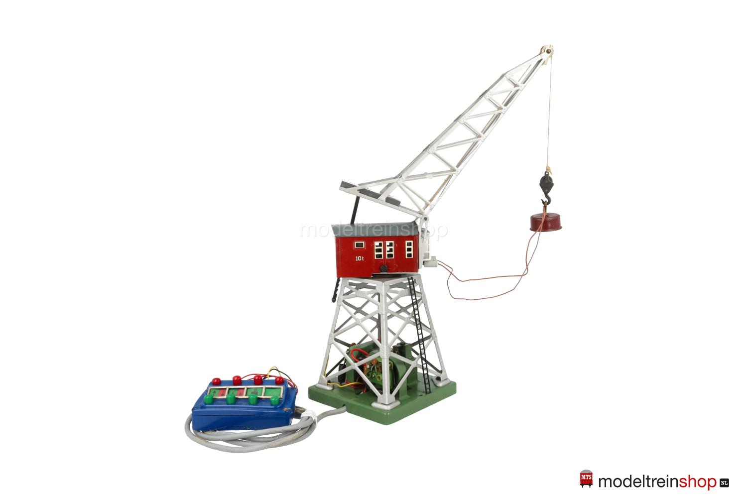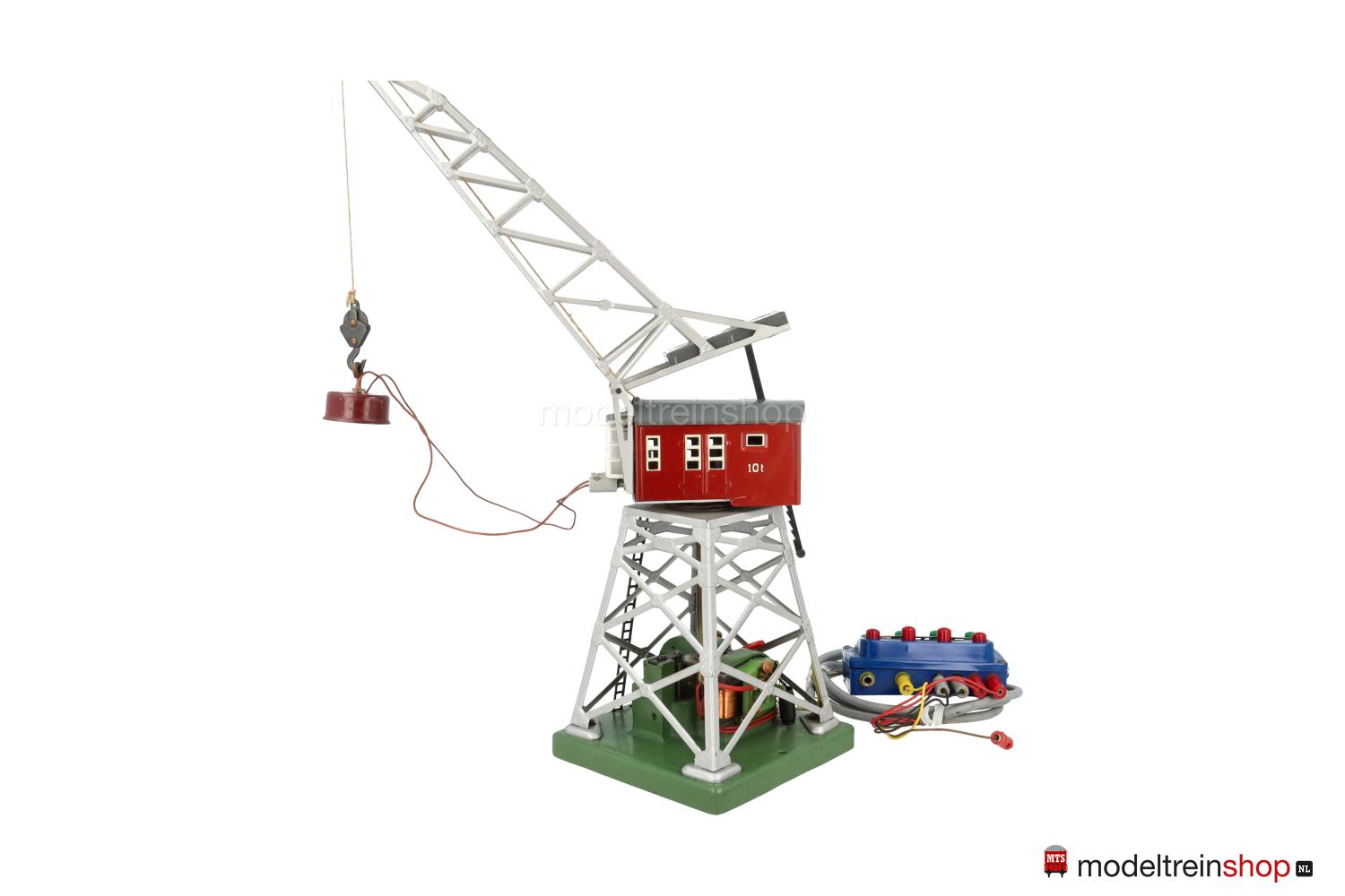 Mit elektrisch betätigtem Hebemagnet, ein Motor für die Drehbewegung des Auslegers, ein Motor zum Heben und Senken des Lasthakens bzw. Hebemagnets. Ausleger von Hand verstellbar. Guß-Sockelplatte (9 x 9 cm) mit den integrierten und fernbedienbaren Motoren. Kran in genieteter Gitterkonstruktion, Kranhaus mit Innenbeleuchtung, Gegengewicht. Schwenkbereich 360°.