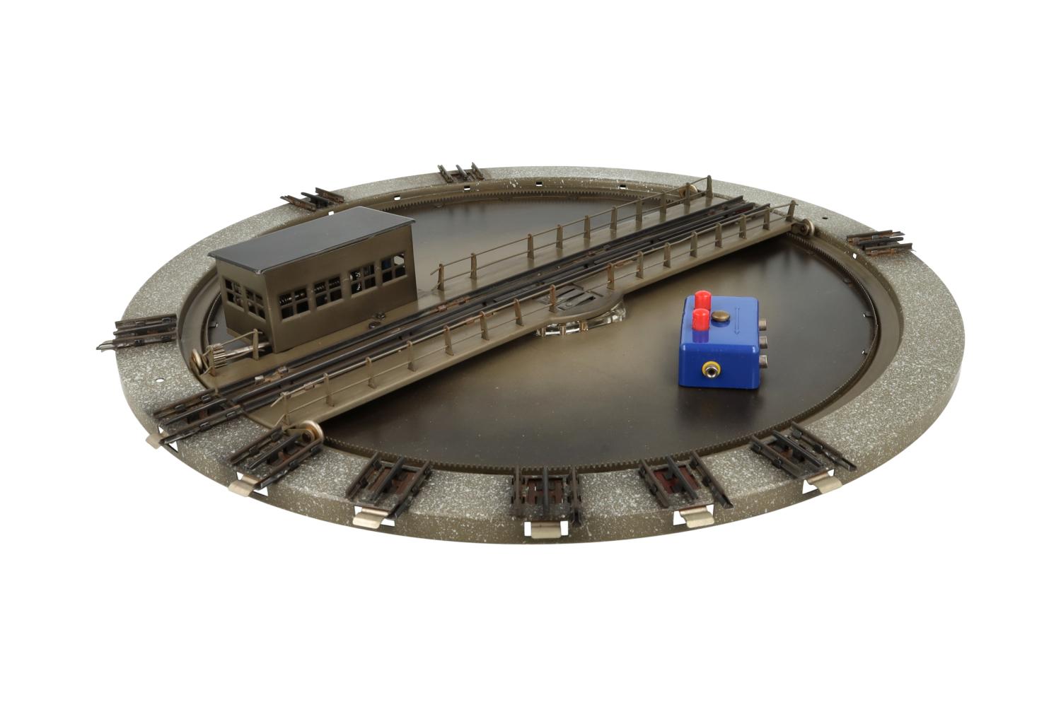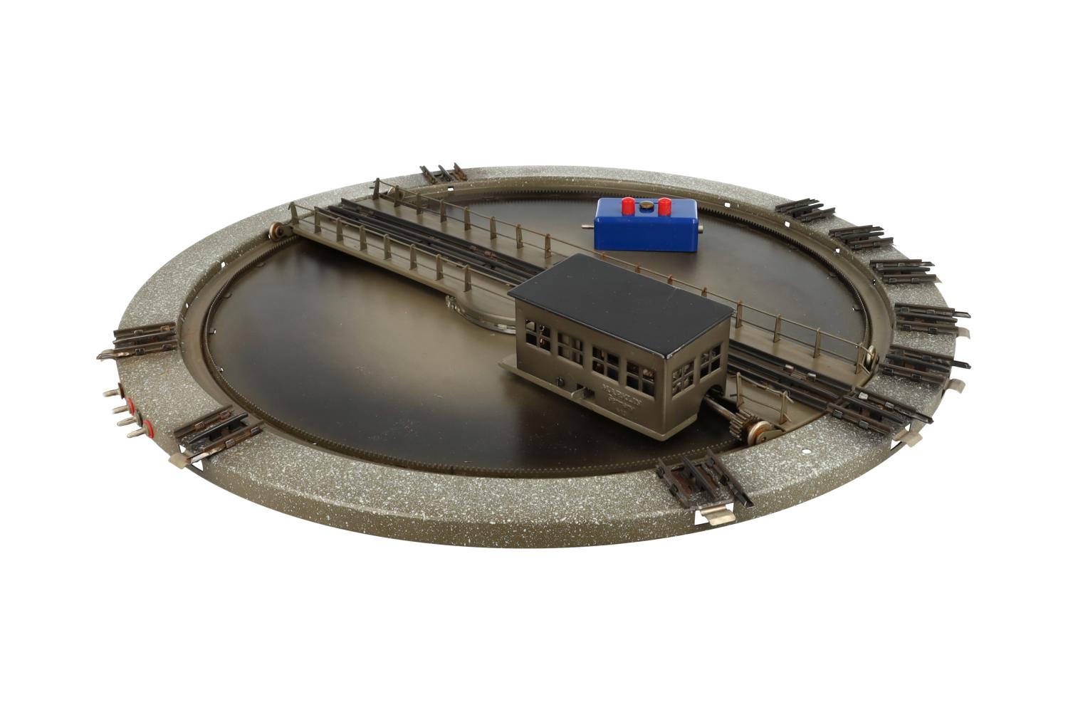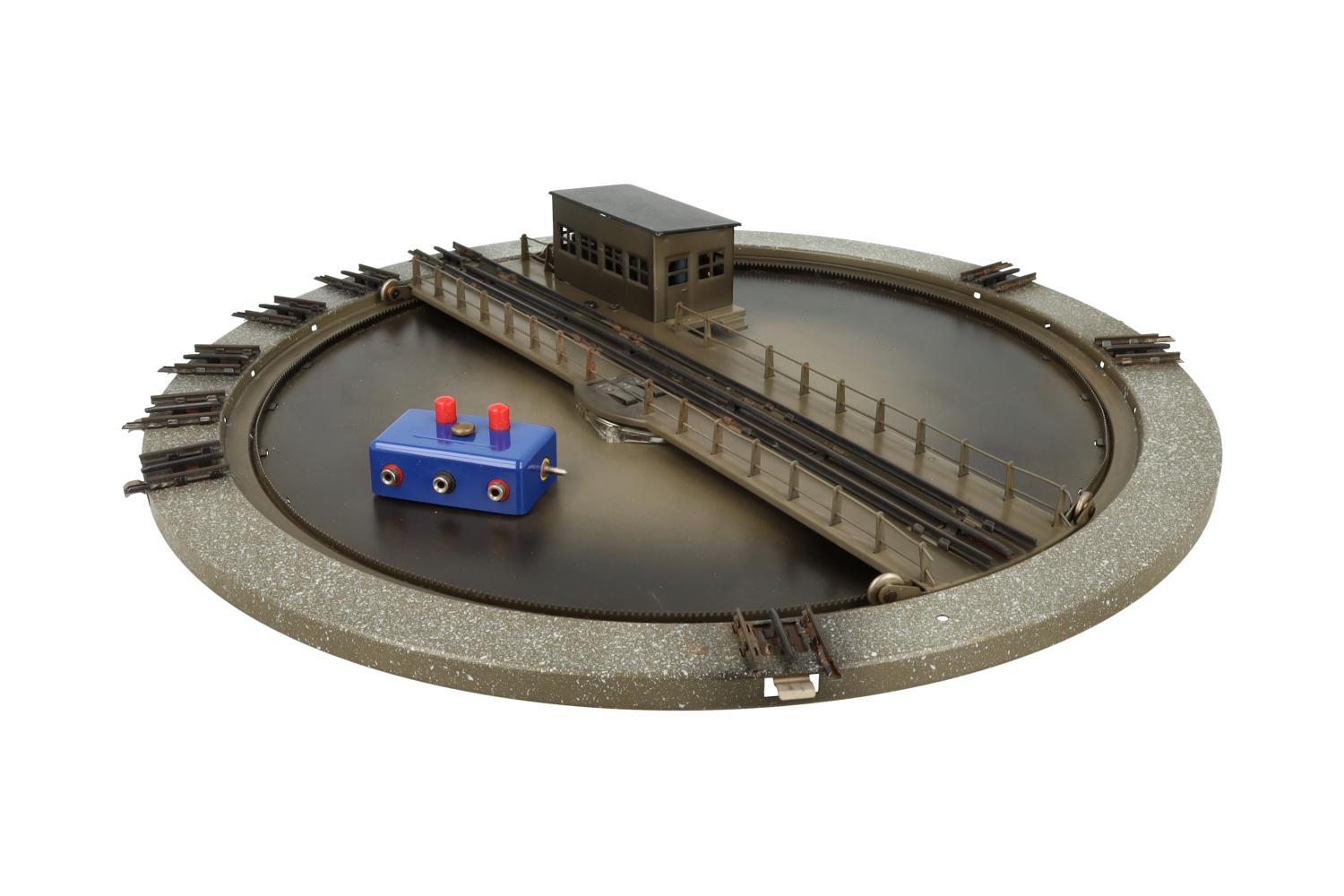 Super-Ausführung – Drehscheibe mit zehn Gleisanschlüssen, Motorhaus mit Antrieb (ohne Kontroll-Leuchte) – in der Drehbühne integriert, Motorhaus mit flachem Dach.