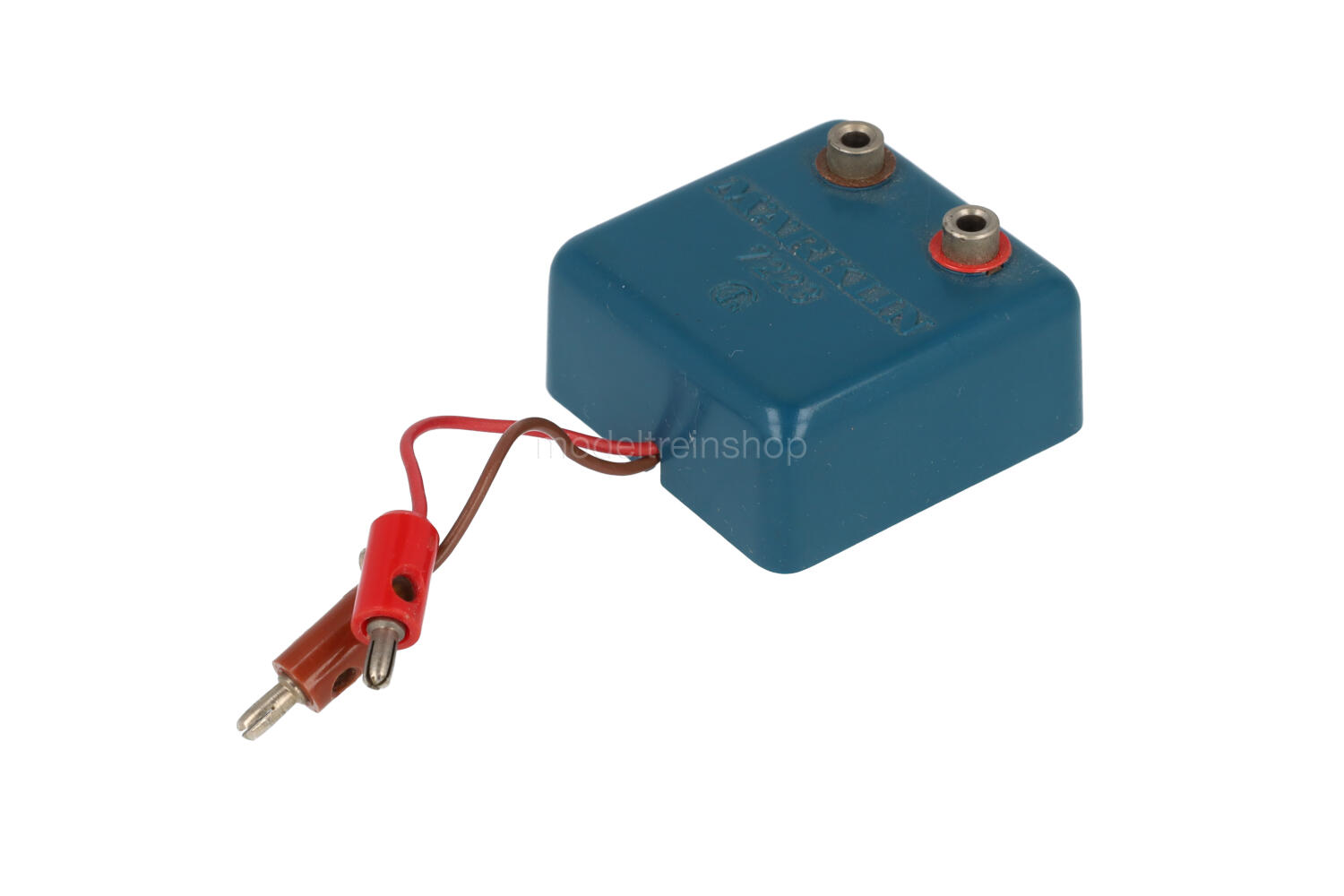 Wordt tussen de trafo en het railsysteem geplaatst. Blauwe kunststof behuizing met kabel en stekkers, 2 aansluitbussen.