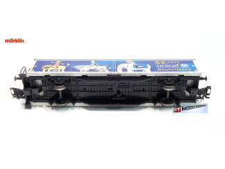 Schwarzes Kunststoff-Untergestell mit Bremserbühne. Kunststoff-Aufbau: weißer Wagenkasten, silberfarbenes Dach, Schiebewände nicht beweglich, Längsseiten mehrfarbig bedruckt mit von Kinderhand gestalteten Motiven sowie mehrfarbige Aufschriften: “ARD Buffet” und “50 Jahre unicef Deutschland”, gelbe angesetzte Griffstangen.