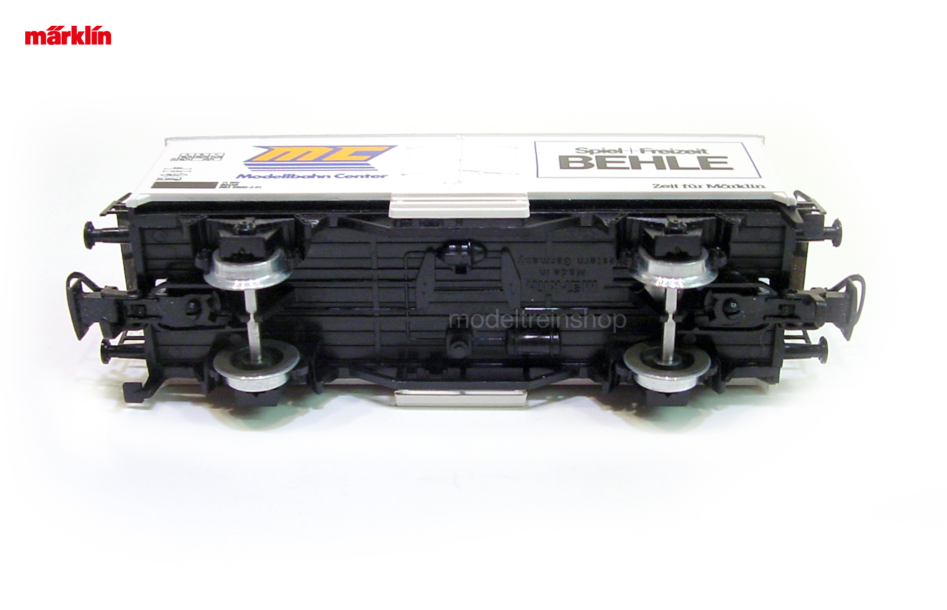 Schwarzes Kunststoff-Untergestell. Kunststoff-Aufbau: weißer Wagenkasten, silberfarbenes Dach, an beiden Stirnseiten Bühne und Stiegen aus Metall.