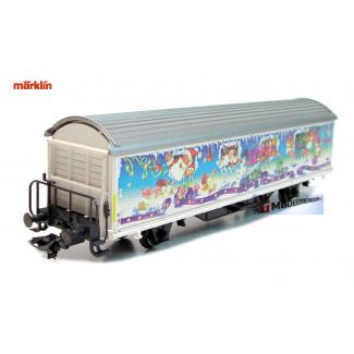 Schwarzes Kunststoff-Untergestell mit Bremserbühne. Kunststoff-Aufbau: weißer Wagenkasten, silberfarbenes Dach, Längsseiten bedruckt mit mehrfarbigen Weihnachtsmotiven und roter Aufschrift: “märklin”, keine weiteren Aufschriften.
