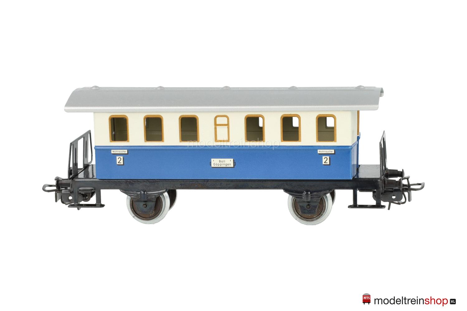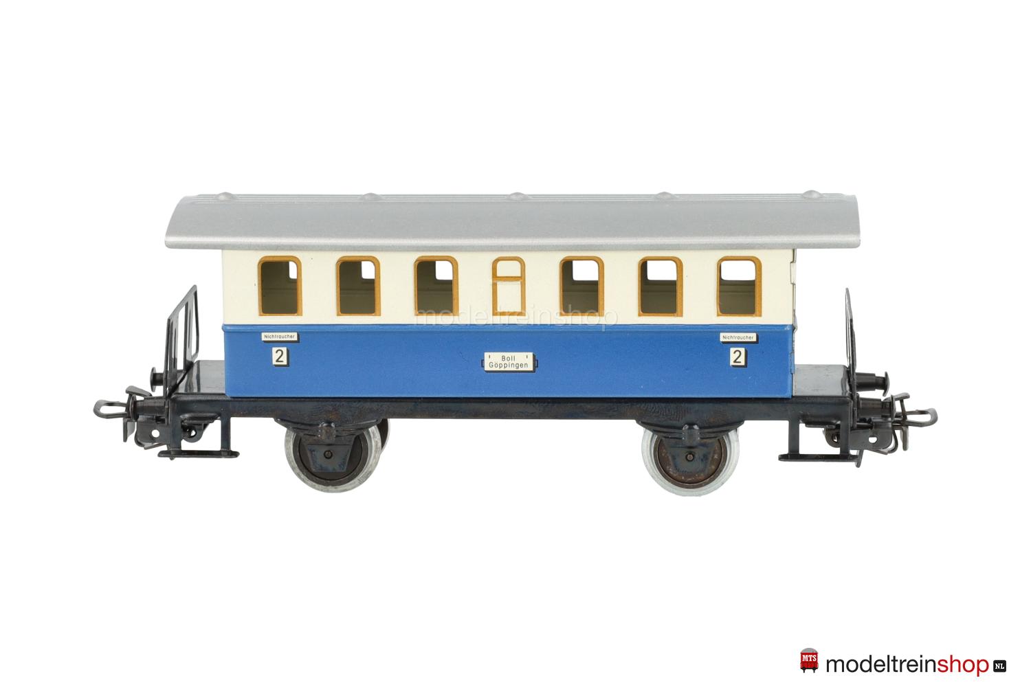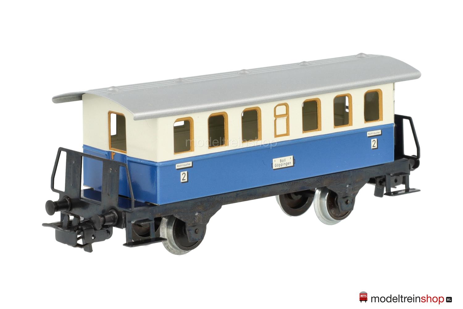 Schwarzes Blech-Untergestell. Blech-Aufbau: blau/weißer Wagenkasten, silberfarbenes Dach, schwarze Aufschriften, Klassenkennzeichnung “2”, Zuglaufschilder mit Aufschrift: “Boll – Göppingen”, Fenster ohne Verglasung, ockerfarbene Fensterrahmen.