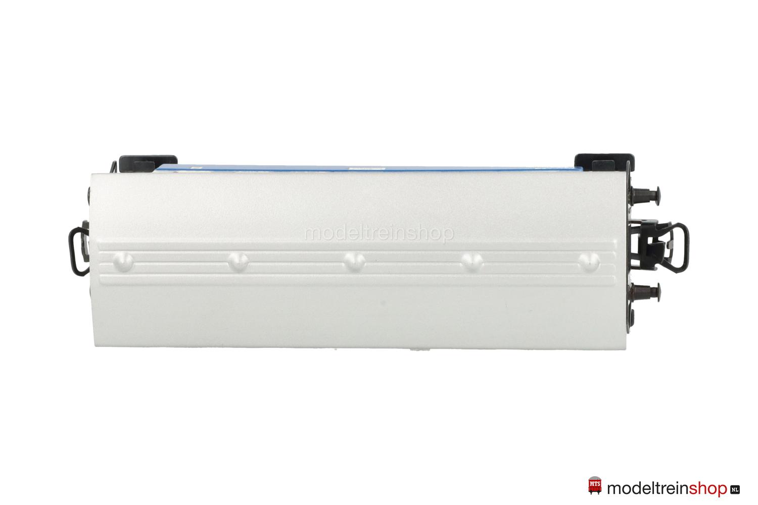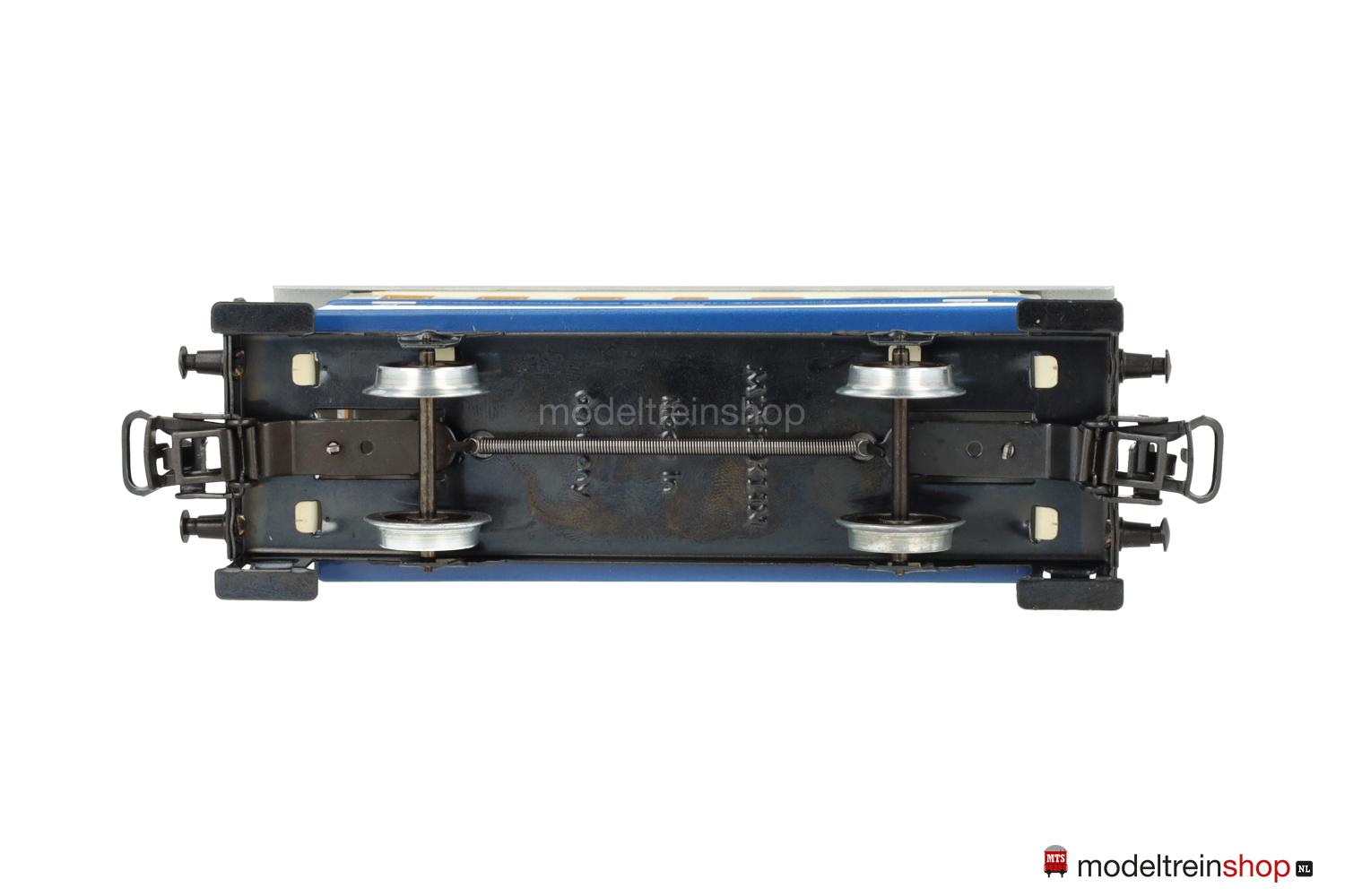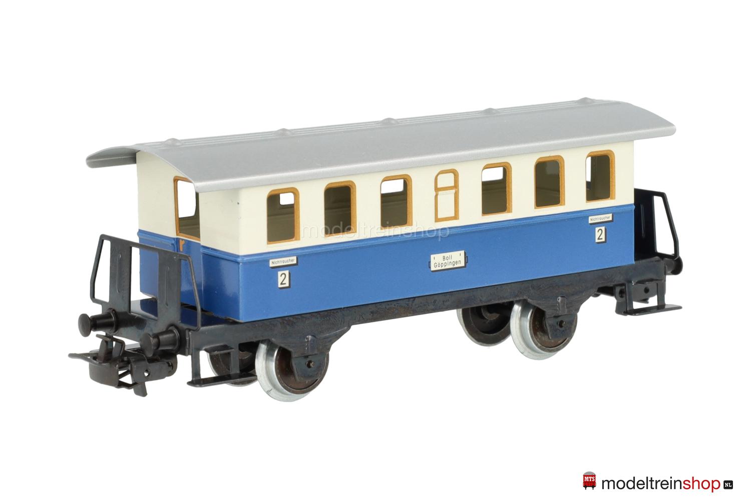 Schwarzes Blech-Untergestell. Blech-Aufbau: blau/weißer Wagenkasten, silberfarbenes Dach, schwarze Aufschriften, Klassenkennzeichnung “2”, Zuglaufschilder mit Aufschrift: “Boll – Göppingen”, Fenster ohne Verglasung, ockerfarbene Fensterrahmen.