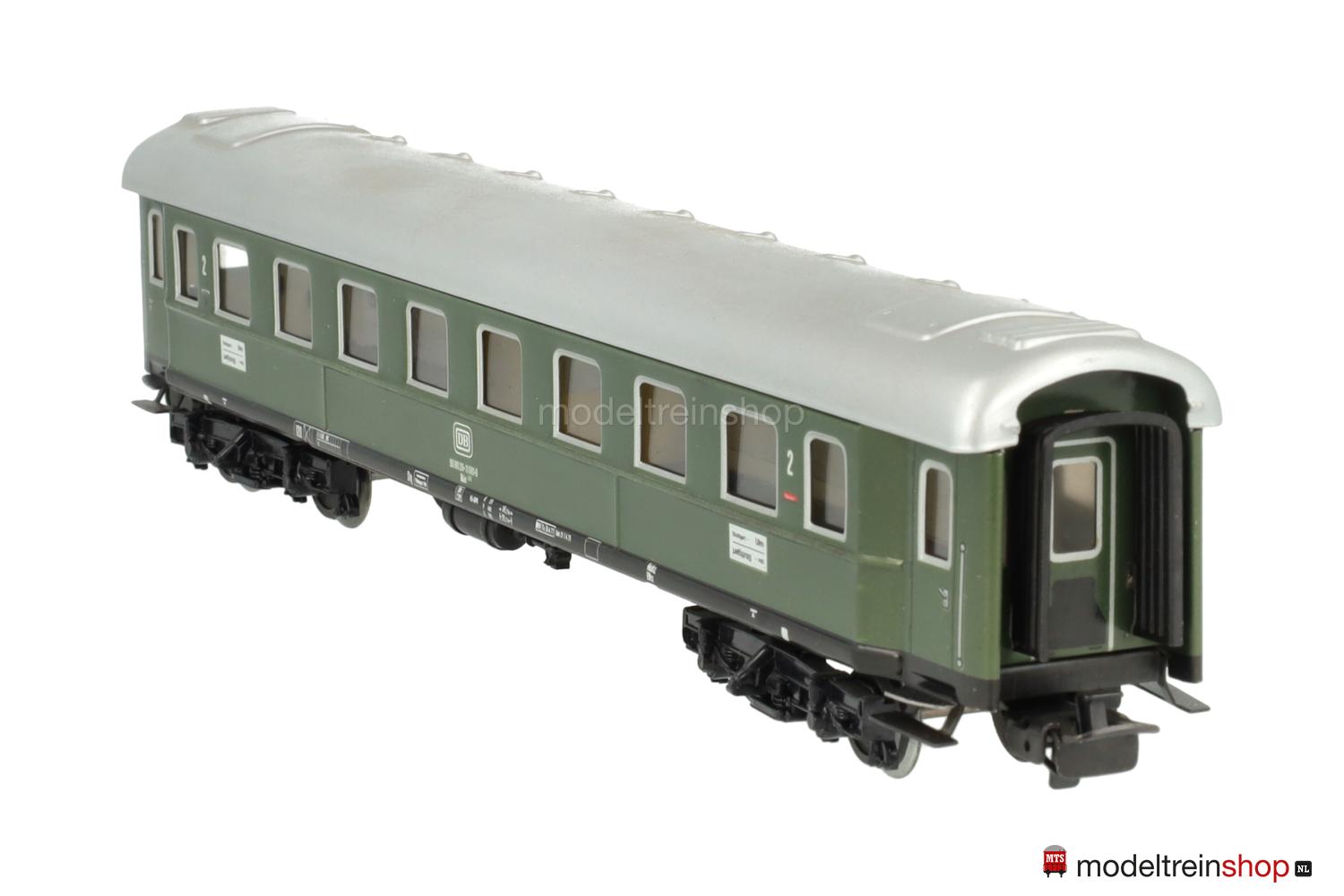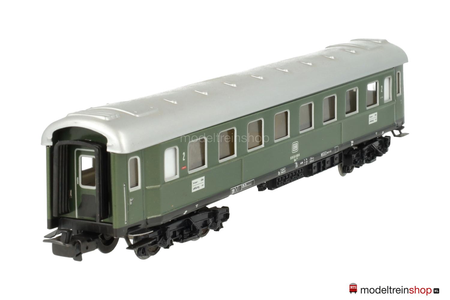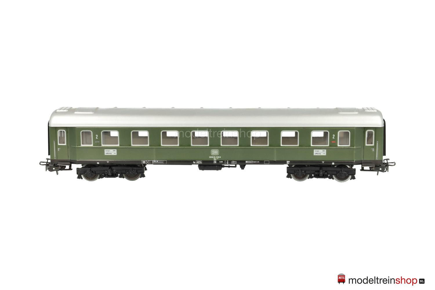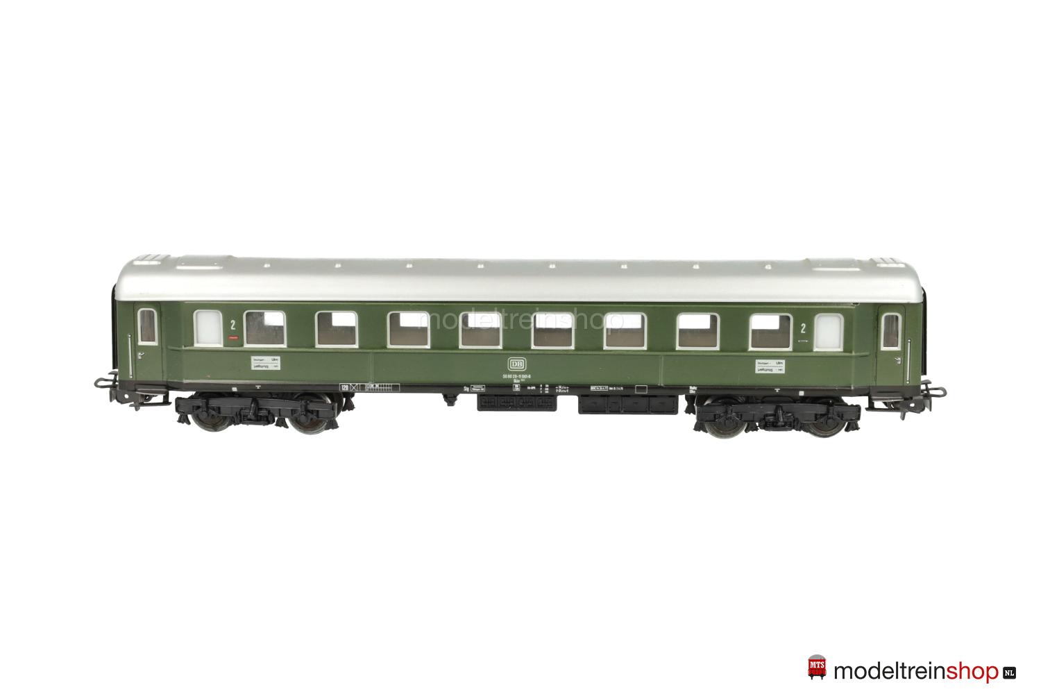 Schwarzes Blech-Untergestell. Minden-Deutz-Drehgestelle (Typ 5-b), Blech-Aufbau: grüner Wagenkasten, silberfarbenes Dach, silberfarbene Fenster- und Türrrahmen, weiße DB-Embleme und Aufschriften, Wagen-Nr.: 50 80 29-11 061-8, Zuglaufschilder mit Aufschrift “Stuttgart – Ulm”, Klassenkennzeichnung “2”, Fenster mit Cellonscheiben hinterlegt, Faltenbalgübergänge.