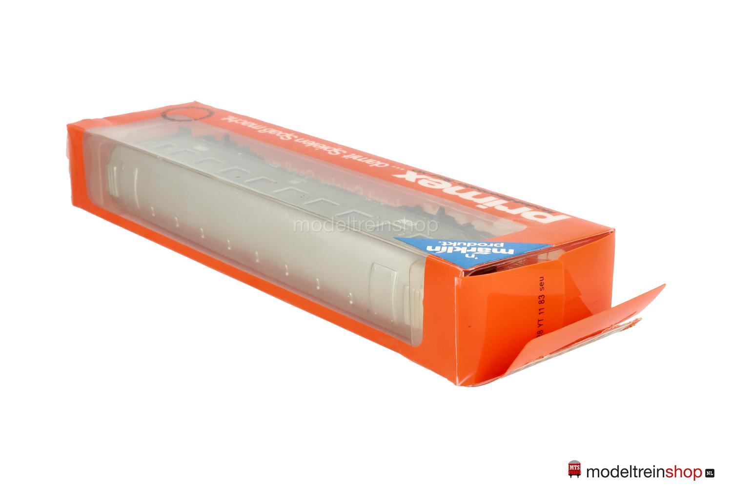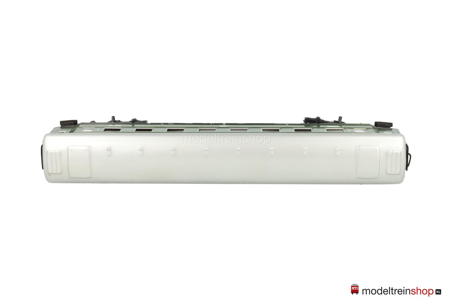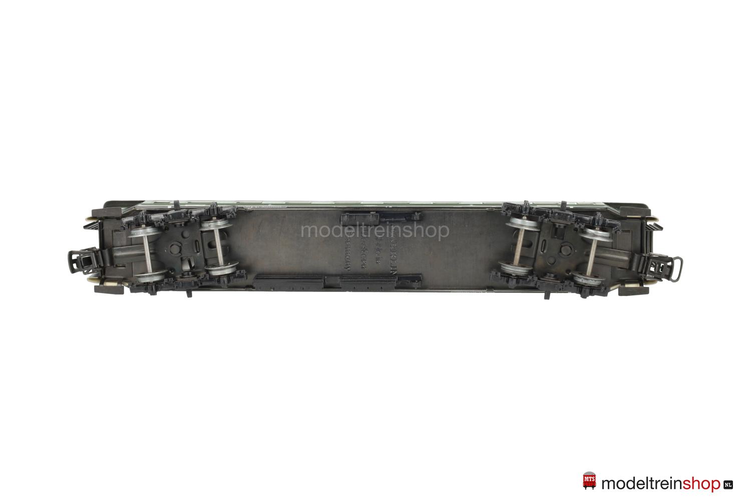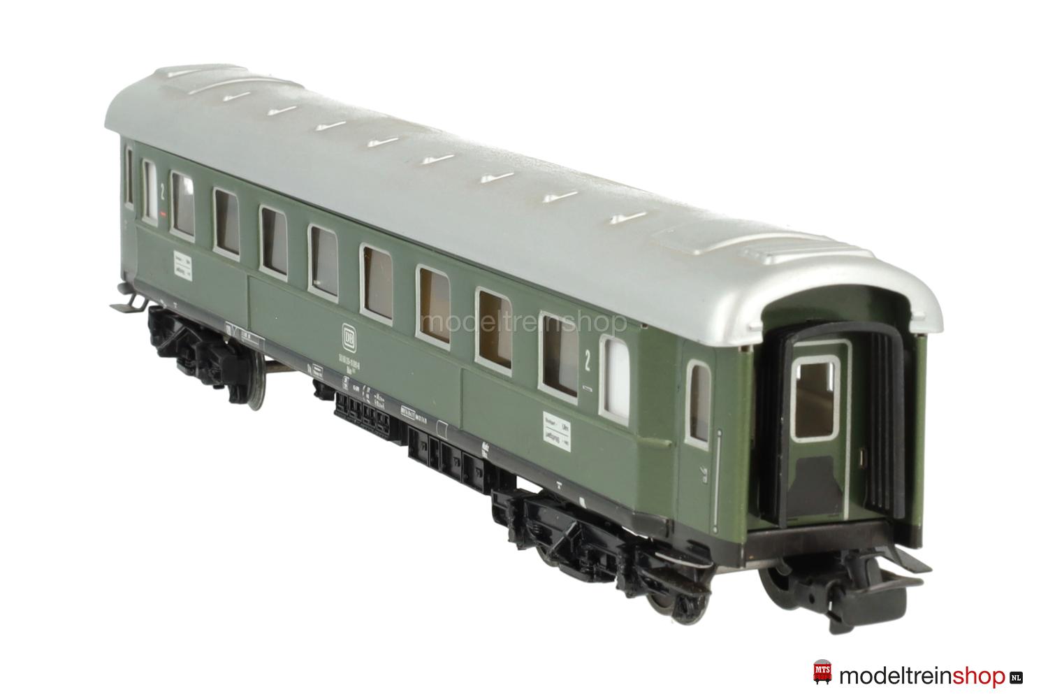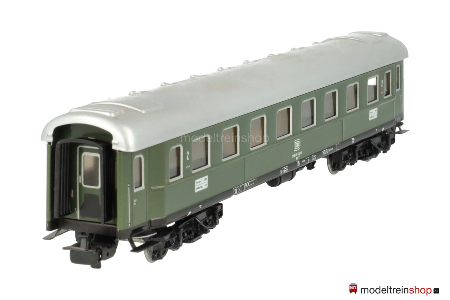 Schwarzes Blech-Untergestell. Minden-Deutz-Drehgestelle (Typ 5-b), Blech-Aufbau: grüner Wagenkasten, silberfarbenes Dach, silberfarbene Fenster- und Türrrahmen, weiße DB-Embleme und Aufschriften, Wagen-Nr.: 50 80 29-11 061-8, Zuglaufschilder mit Aufschrift “Stuttgart – Ulm”, Klassenkennzeichnung “2”, Fenster mit Cellonscheiben hinterlegt, Faltenbalgübergänge.