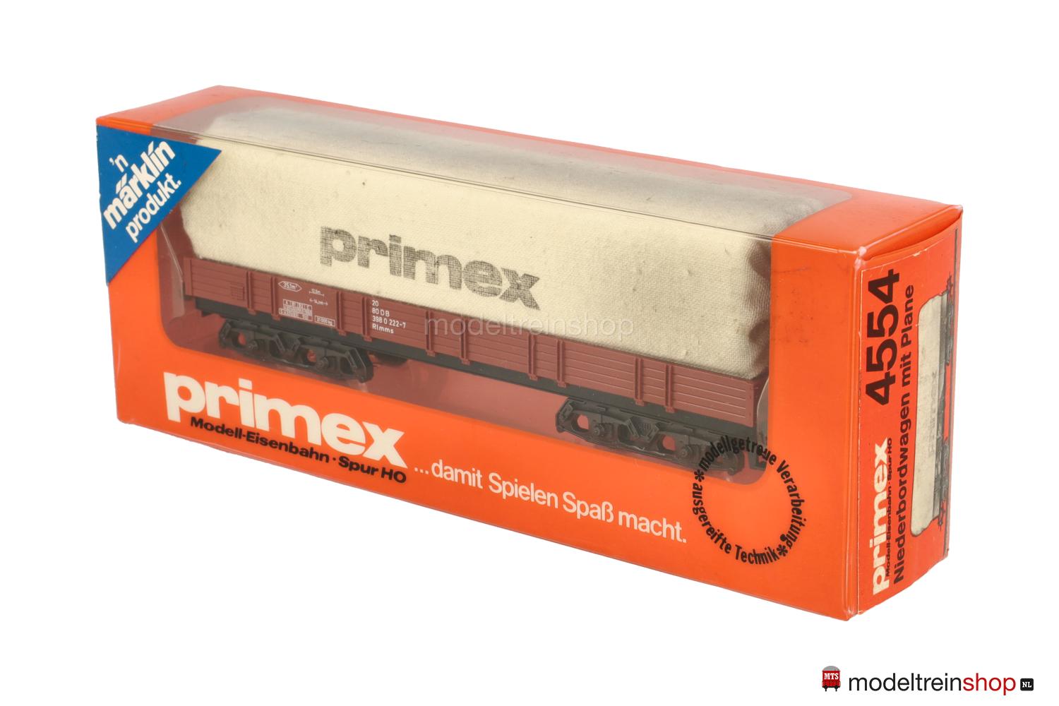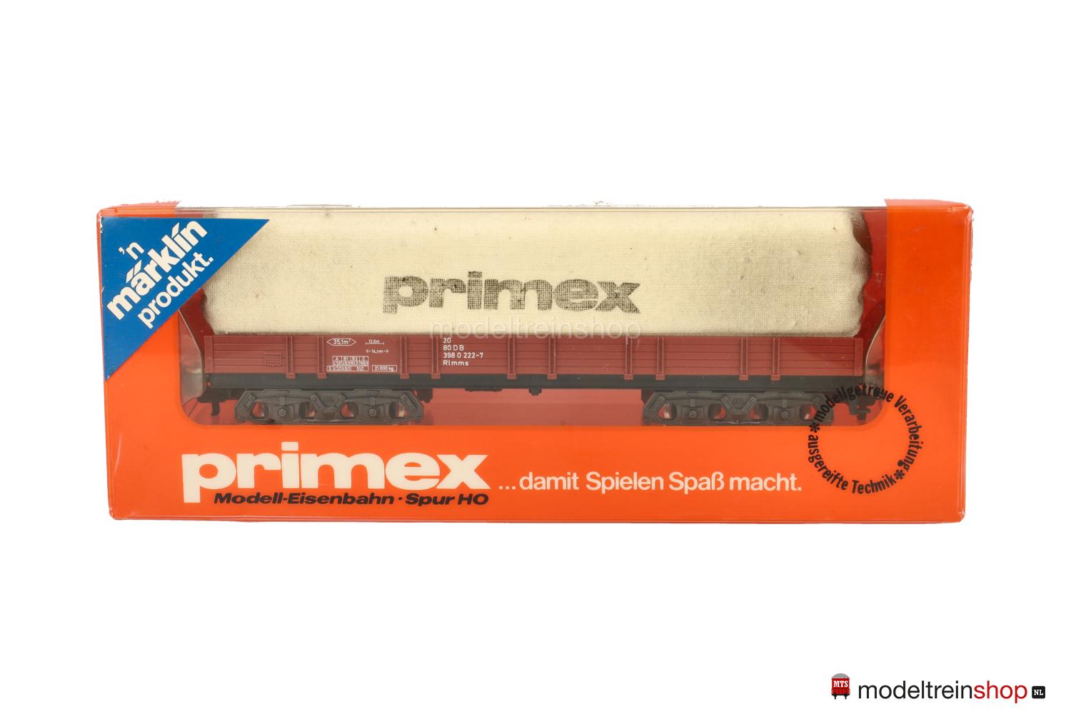 Schwarzes Kunststoff-Untergestell, Minden-Siegen-Drehgestelle (Typ E-a). Kunststoff-Aufbau: rotbrauner Wagenkasten (in verschiedenen Farbnuancen ausgeliefert), Wagenboden ohne Holzstruktur, weiße Aufschriften, Wagen-Nr.: 398 0 222-7, Spannbogen aus Styropor, weiße und schattierte Plane mit Aufschrift “primex”.