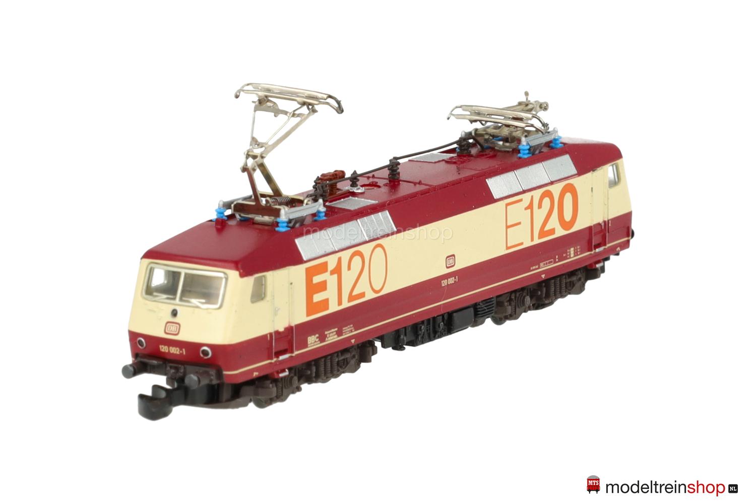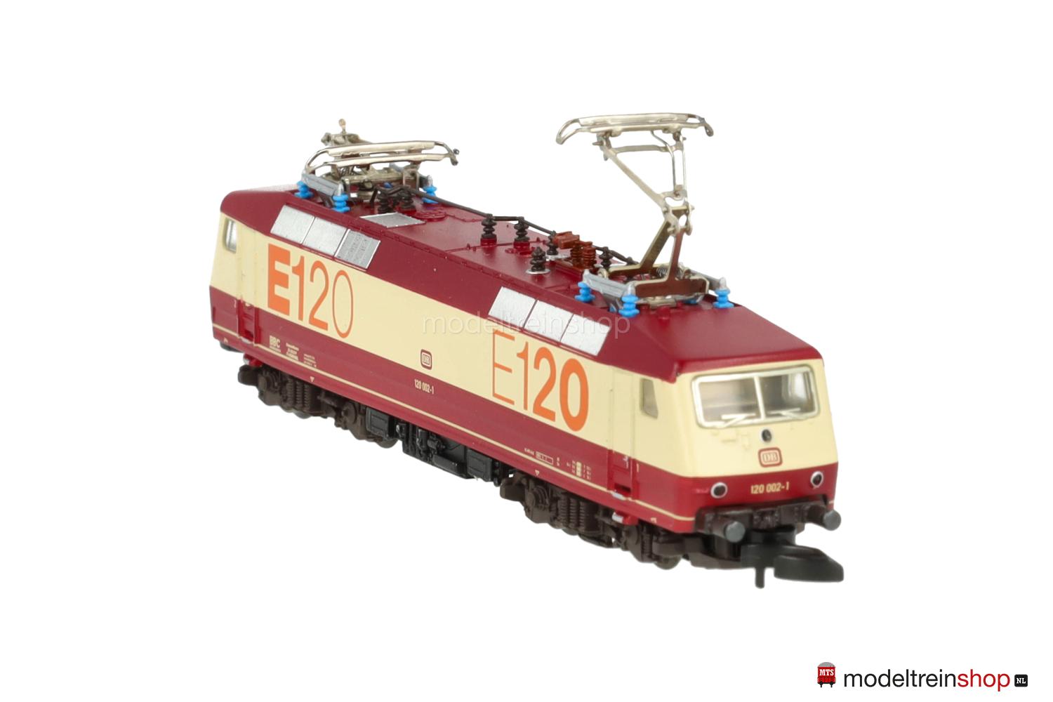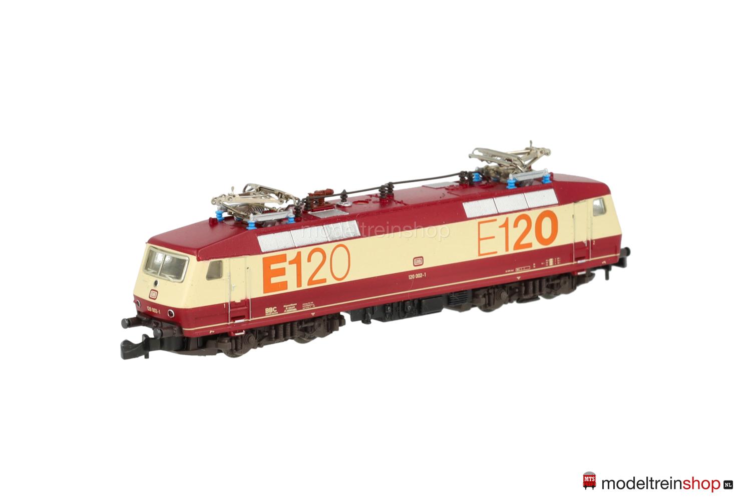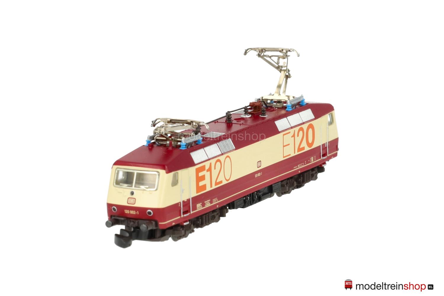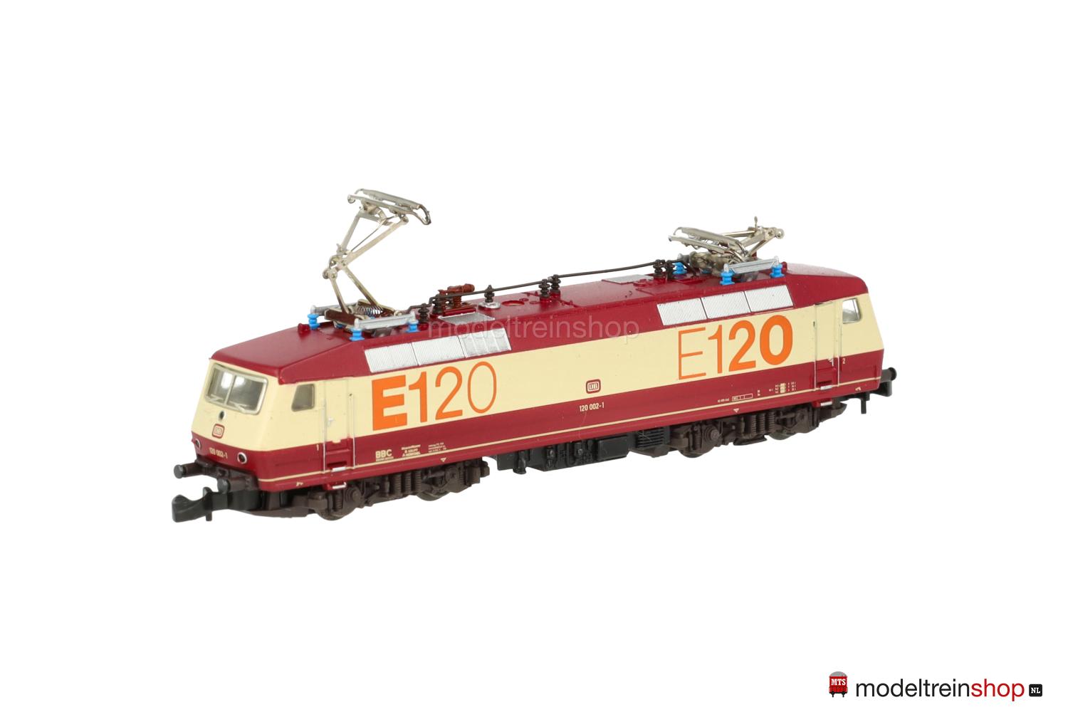 Achsfolge Bo’ Bo’. Dunkelbraune Kunststoff-Drehgestelle, schwarzes Gussfahrgestell, zwei Drehgestelle angetrieben, schwarze Speichenräder, dunkel vernickelte Radreifen. Weinrot/creme/weinrotes Kunststoff-Gehäuse, eingesetzte Fenster mit silberfarbenem Rahmen (Frontscheiben), Lüftergitter grau, weinrotes Dach, filigrane schwarze Dachaufbauten. Betriebs-Nr.: 120 002-1, cremefarbene Aufschriften, weinrote DB-Embleme, Führerstandskennzeichnungen “1” und “2”, orangefarbene Schriftzüge “E120”. Dreilicht-Spitzensignal, automatischer Lichtwechsel mit Fahrtrichtungsänderung.