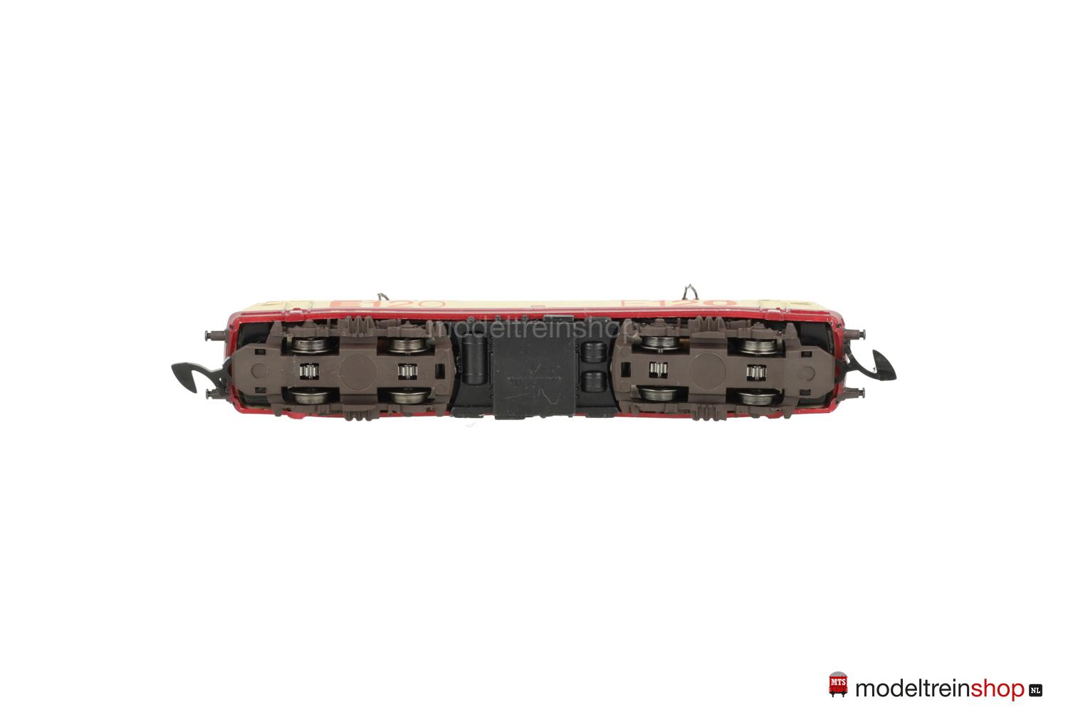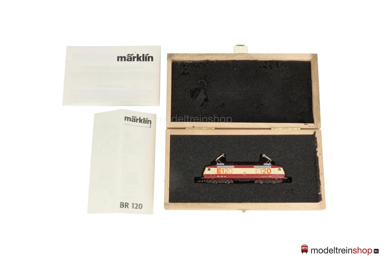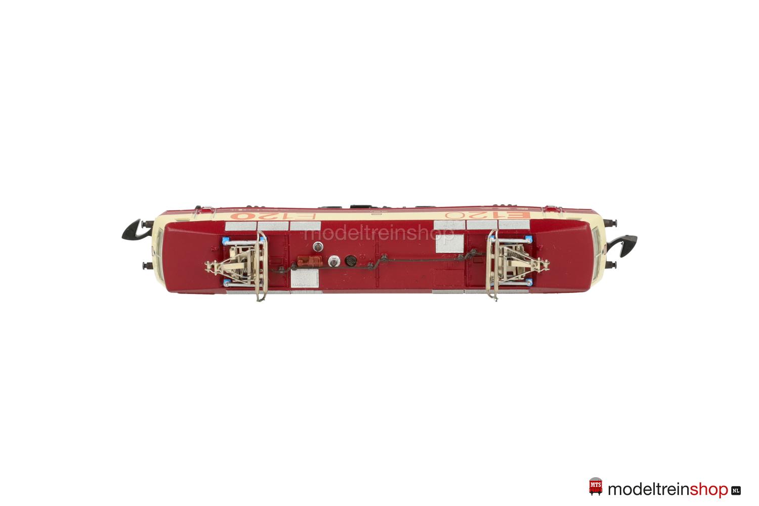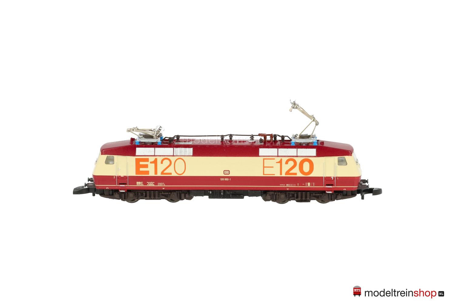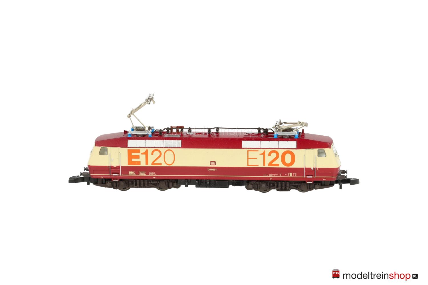 Achsfolge Bo’ Bo’. Dunkelbraune Kunststoff-Drehgestelle, schwarzes Gussfahrgestell, zwei Drehgestelle angetrieben, schwarze Speichenräder, dunkel vernickelte Radreifen. Weinrot/creme/weinrotes Kunststoff-Gehäuse, eingesetzte Fenster mit silberfarbenem Rahmen (Frontscheiben), Lüftergitter grau, weinrotes Dach, filigrane schwarze Dachaufbauten. Betriebs-Nr.: 120 002-1, cremefarbene Aufschriften, weinrote DB-Embleme, Führerstandskennzeichnungen “1” und “2”, orangefarbene Schriftzüge “E120”. Dreilicht-Spitzensignal, automatischer Lichtwechsel mit Fahrtrichtungsänderung.